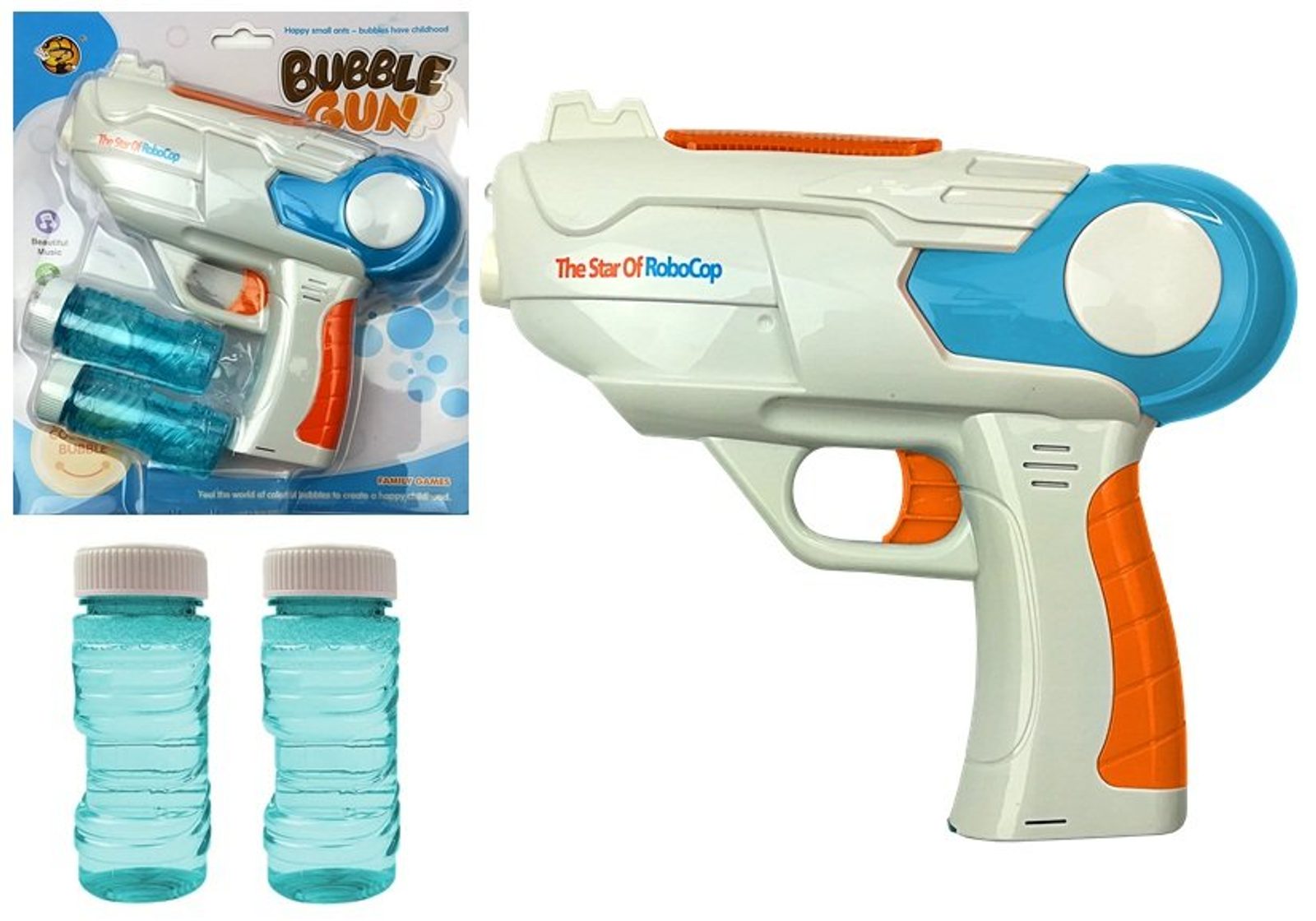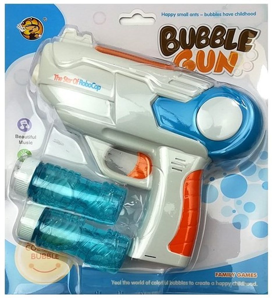 Dětský bublifuk ve tvaru kosmické pistole Bubble Gun dokáže vytvořit nekonečné množství duhových bublin. Nejdříve je třeba nasadit lahvičku s mýdlovým roztokem přímo do zadní části bublifuku. Předtím je třeba sejmout plastový kryt. Zmáčknutím spouště se začnou generovat duhové bubliny za současného zvuku. V přední části je umístěno světýlko, v horní části pod pod krytem jsou potom další 3 blikající světýlka. Po ukončení hry je třeba lahvičku z bublifuku demontovat a otřít ho suchým hadříkem. Hračka je vyrobena z plastu a je určena pro děti od 36 měsíců věku.