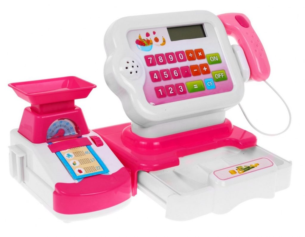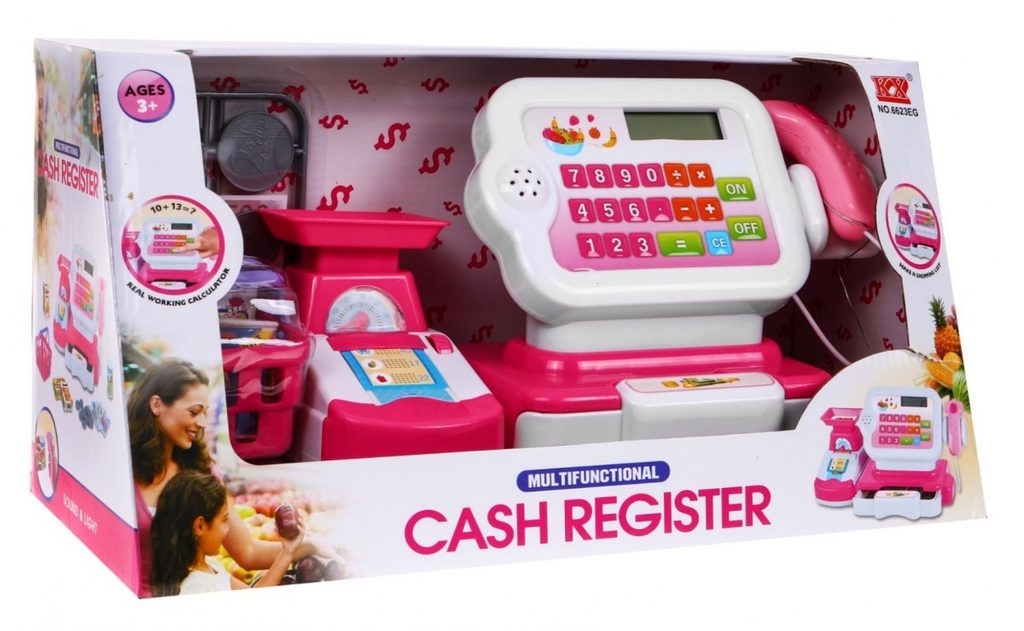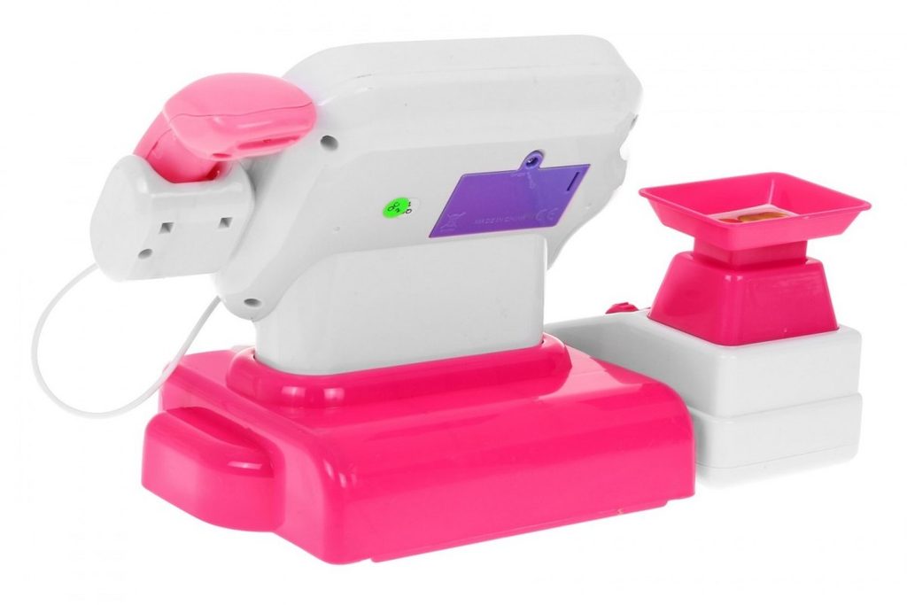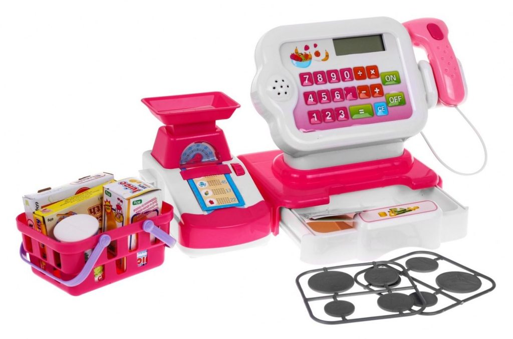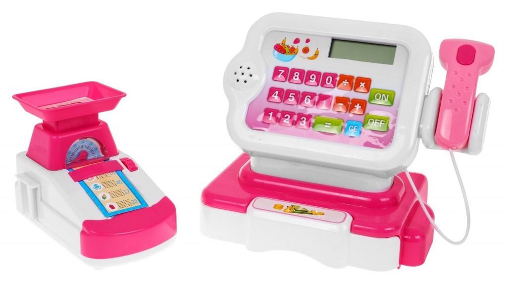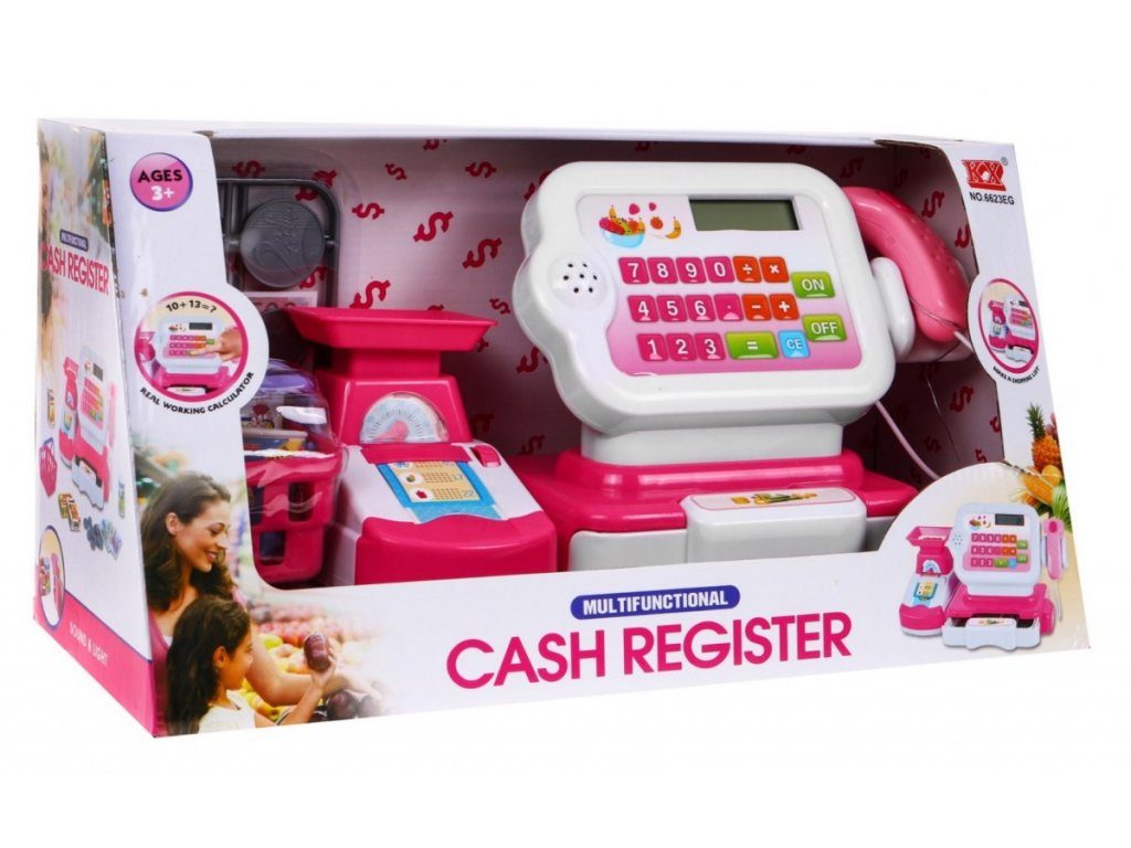 Dětská elektronická pokladna s váhou a displejem přemění Vaše dítě ve skutečnou pokladní. Je vybavena displejem, který má funkci kalkulačky. Ve spodní části je umístěna výsuvná přihrádka na bankovky a mince, které jsou také součástí balení. Pomocí funkčního skeneru lze skanovat zboží, po stisknutí tlačítka se rozvítí červená dioda a ozve se charakteristické pípnutí. Součástí balení je také nákupní košíček s imitacemi potravin. V levé části pokladny je umístěna váha. Hračka je určena pro děti od 36 měsíců věku.