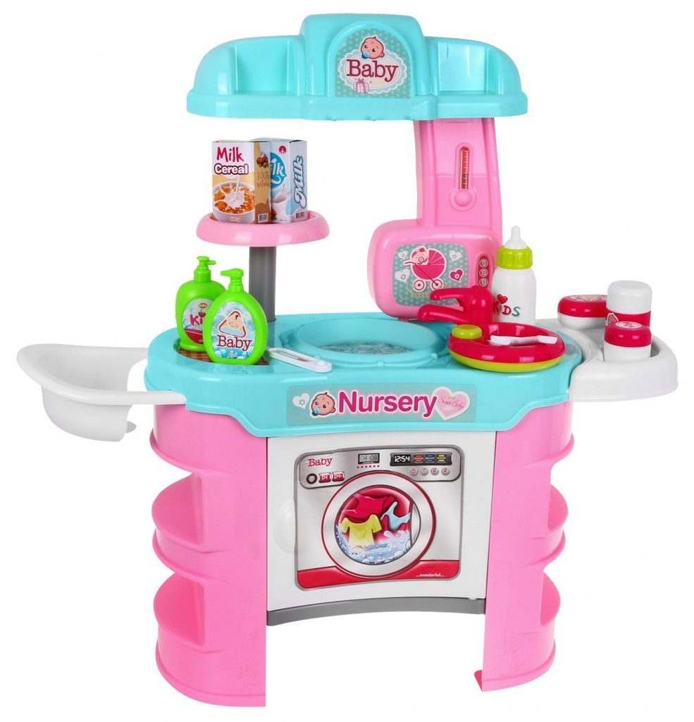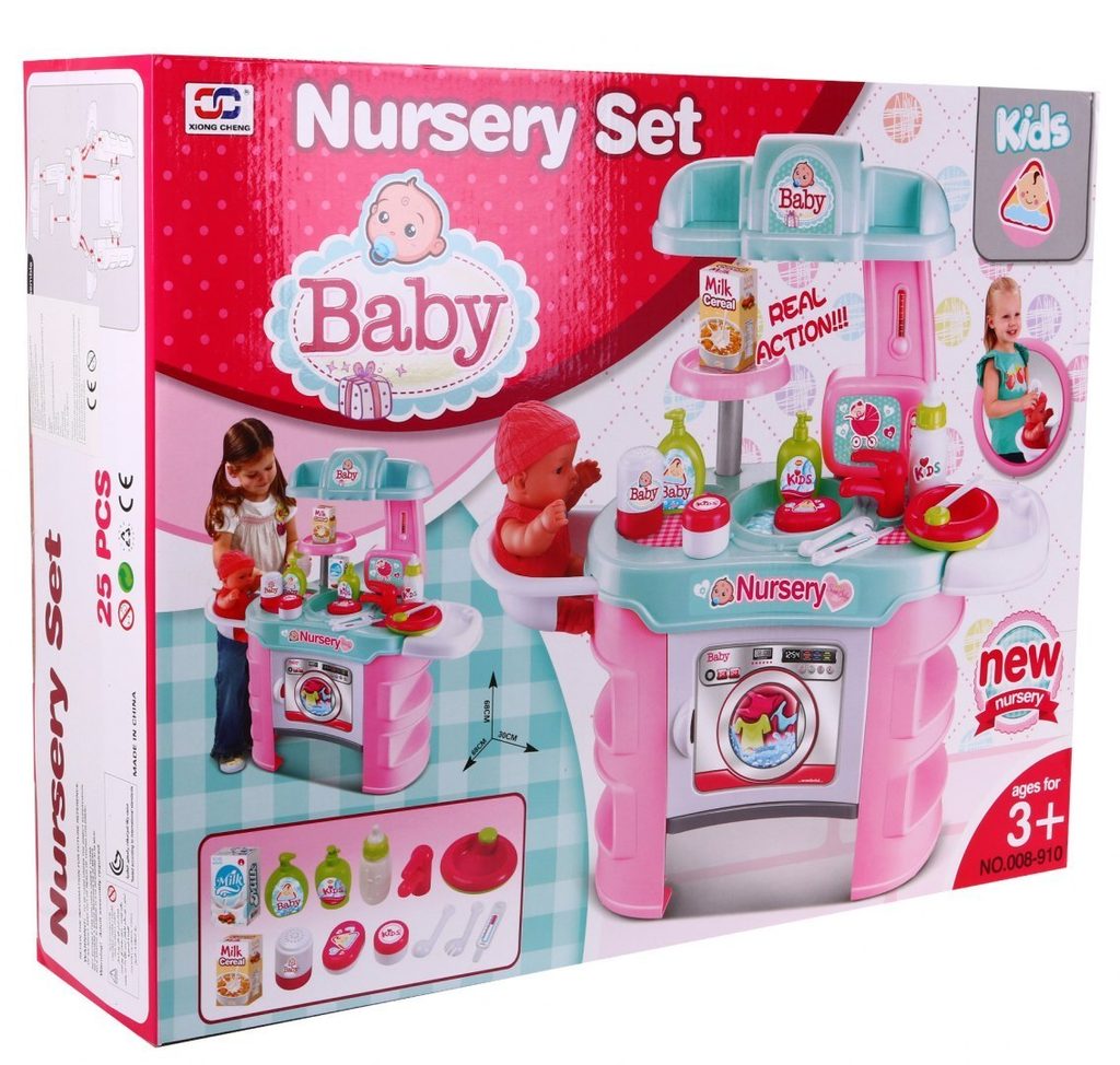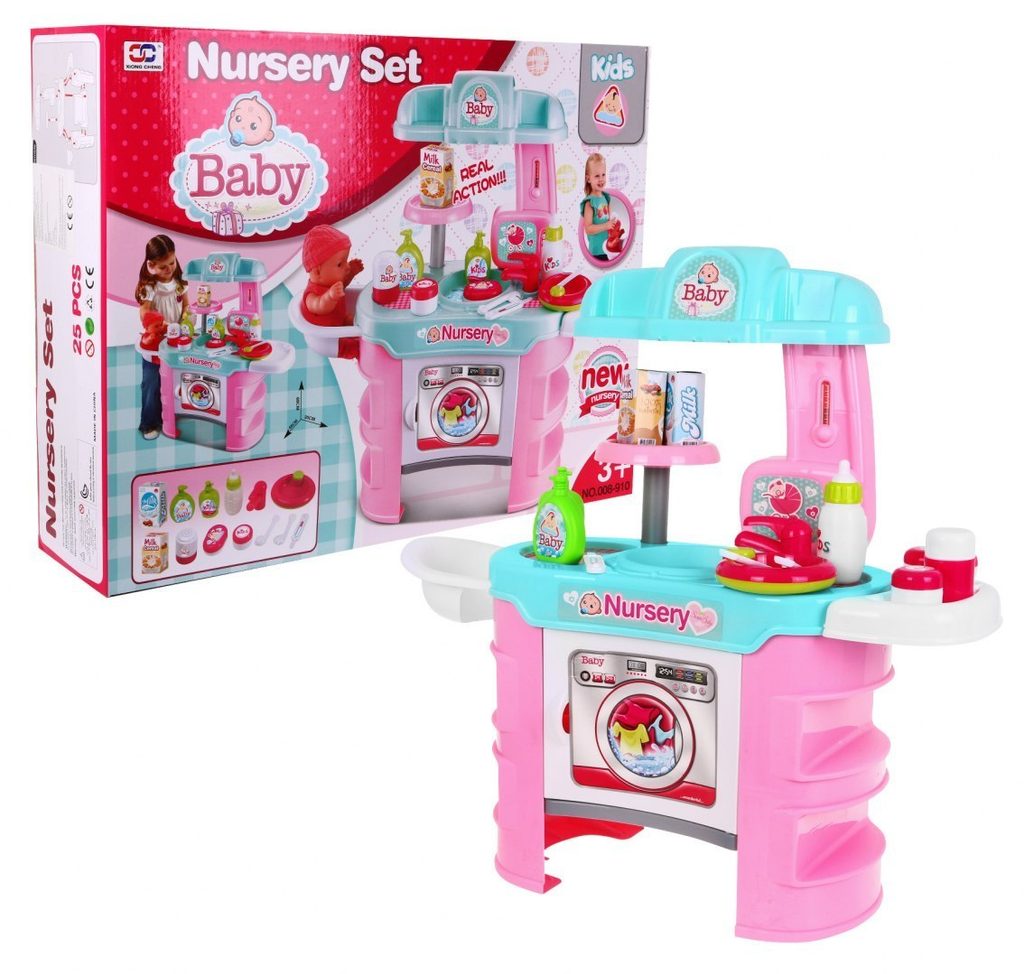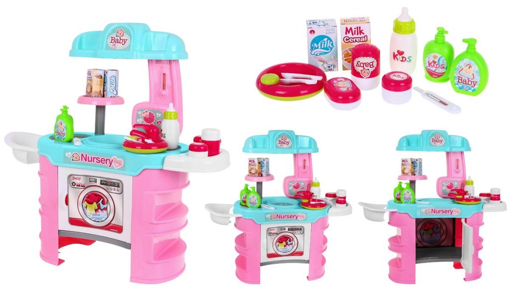 Dětské sestava Malá chůva obsahuje vše potřebné pro péči o panenku nebo medvídka. Na bočních stranách pultíku jsou umístěny police, v horní desce je dřez s kohoutkem. Přední otevírací skříňka slouží jako pračka. V sadě najdete spoustu dalších užitečných věcí jako jsou miska na jídlo, příbory, talíř, křesílko na krmení, imitaci tekutého mýdla, šamponu, masti a další. Hračka je určena pro děti od 36 měsíců věku.