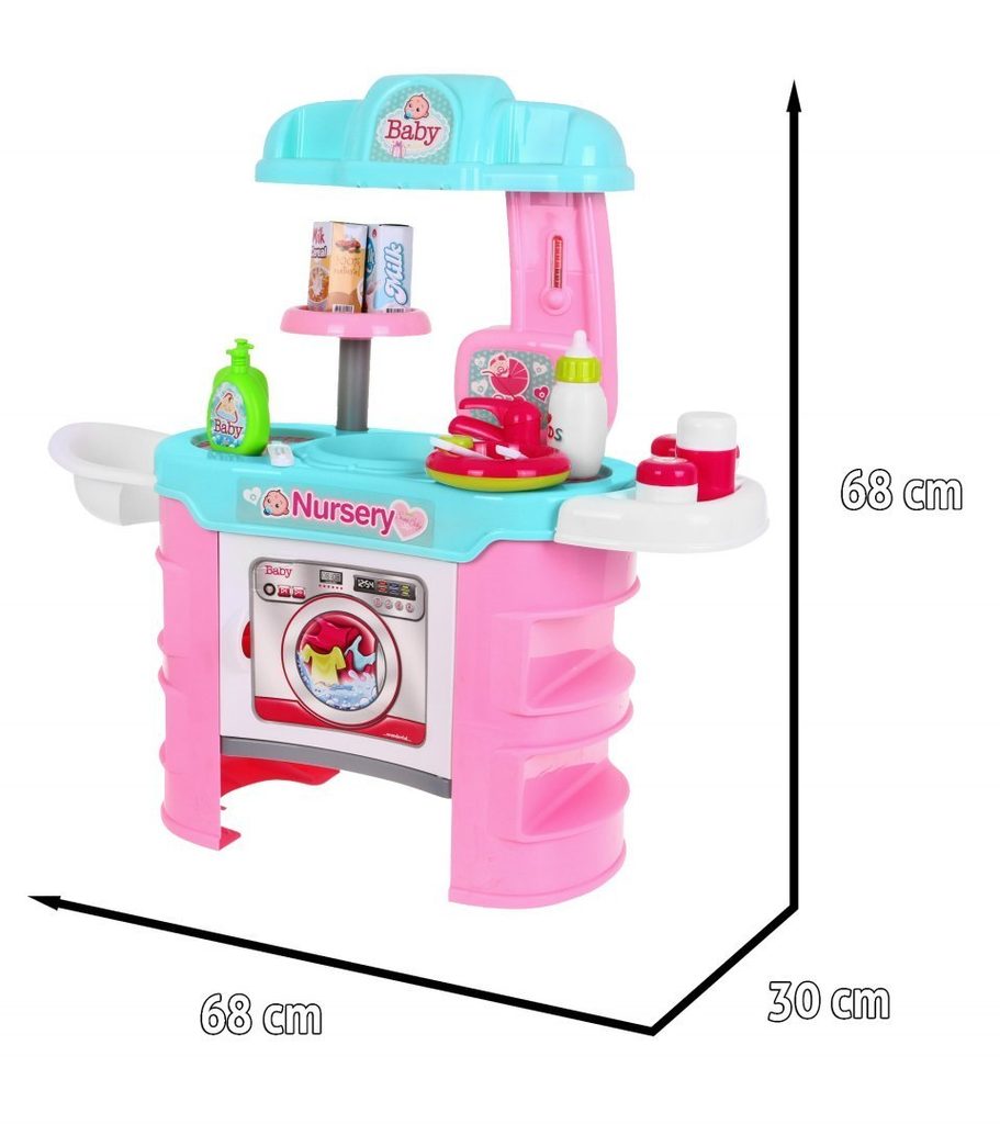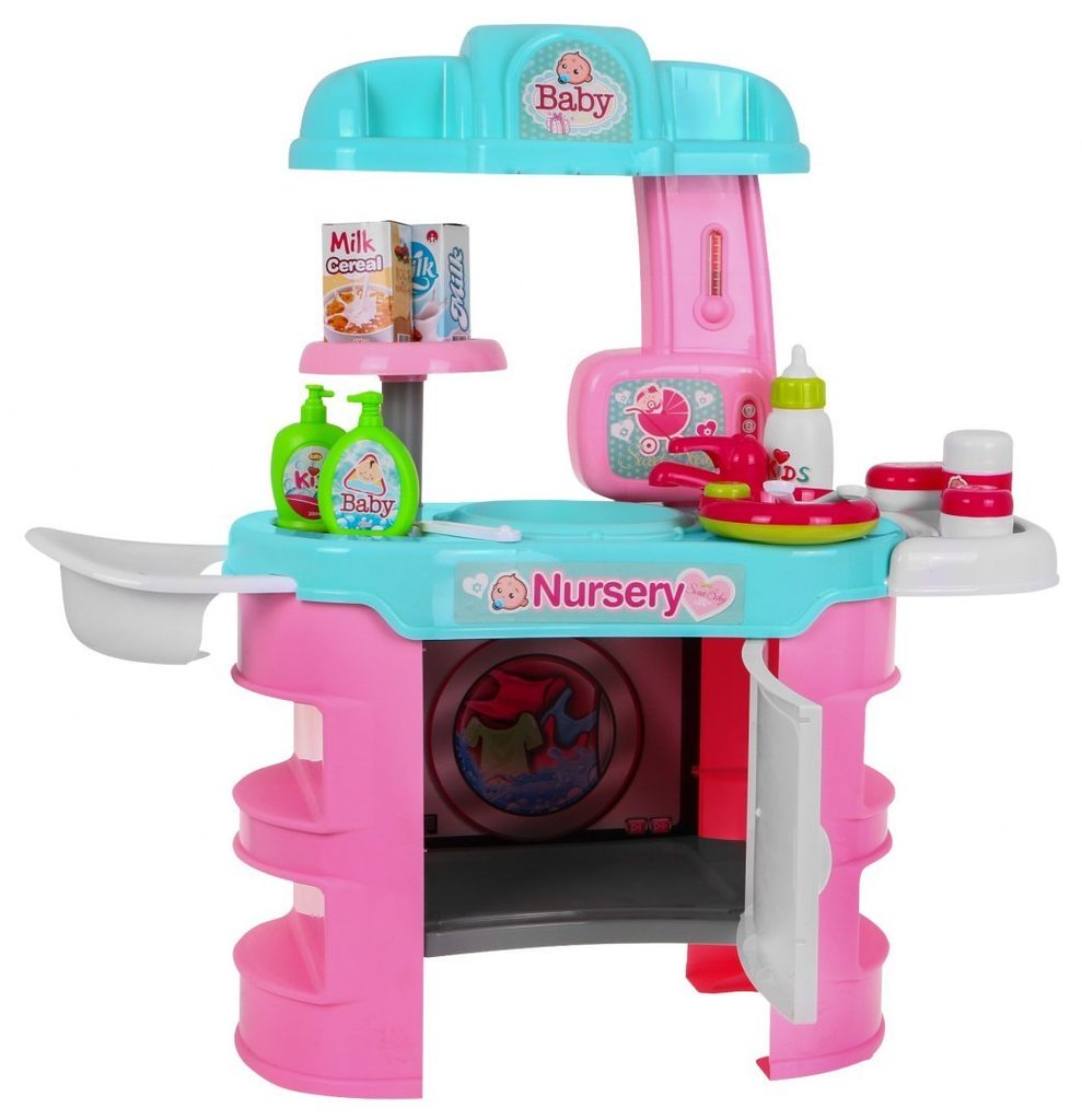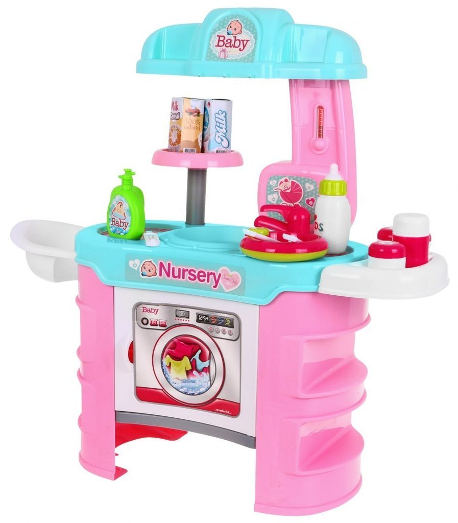 Dětské sestava Malá chůva obsahuje vše potřebné pro péči o panenku nebo medvídka. Na bočních stranách pultíku jsou umístěny police, v horní desce je dřez s kohoutkem. Přední otevírací skříňka slouží jako pračka. V sadě najdete spoustu dalších užitečných věcí jako jsou miska na jídlo, příbory, talíř, křesílko na krmení, imitaci tekutého mýdla, šamponu, masti a další. Hračka je určena pro děti od 36 měsíců věku.