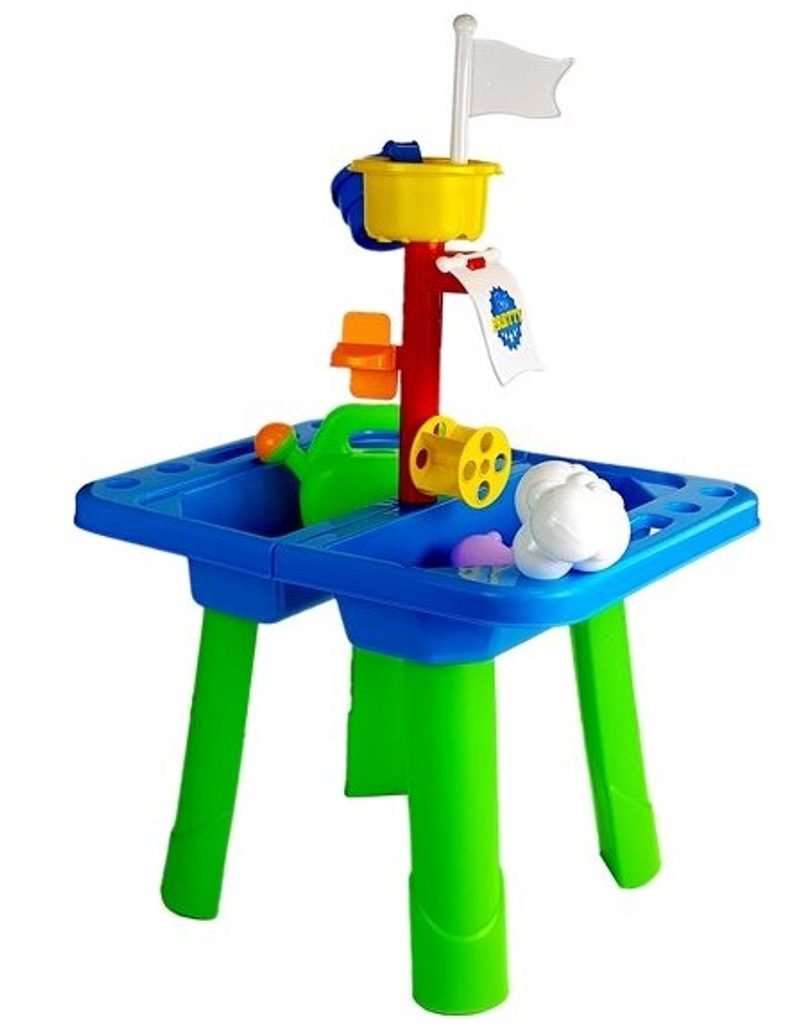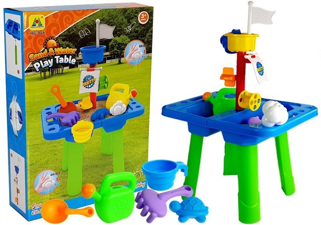 Dětské pískoviště ve stolečku s příslušenstvím Sand Table je ideální hračkou na zahradu, balkon nebo domů. Součástí sestavy jsou kromě skládacího stolečku se stožárem v provedení pískoviště také konvička, hrabičky, kyblíček, lopatička, formička ve tvaru želvičky a bílý mráček ze kterého po nalití teče voda. Dítě zde tedy najde vše potřebné pro hru s pískem a vodou. Hračka je určena pro děti od 36 měsíců věku.