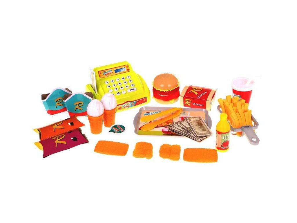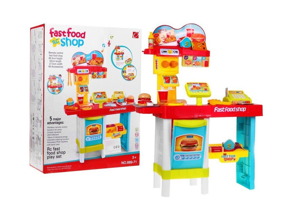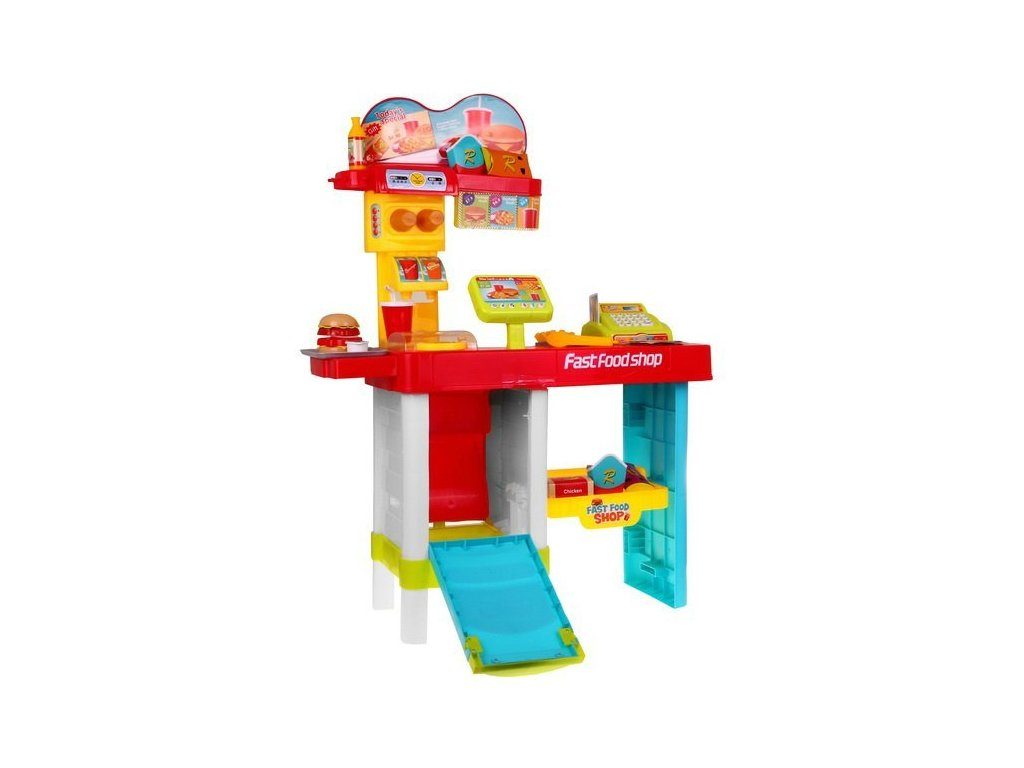 Kompletně vybavený dětský Fastfood s pokladnou na baterie, světlem a zvuky přemění Vaše dítě ve skutečného prodavače v rychlém občerstvení. Je vybaven vším důležitým co takový malý obchodník potřebuje. Podsvětlená tabule s menu, pokladna, hranolky, hamburger, kelímky, zmrzlina, tác, prodejní obaly, imitace bankovek, kreditní karta a mnoho dalších věcí. Pod pultem je umístěna trouba a police na uložení všeho potřebného. Hračka je určena pro děti od 36 měsíců věku.