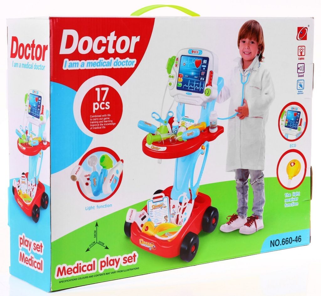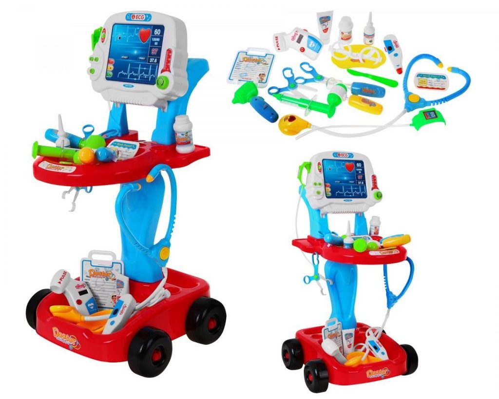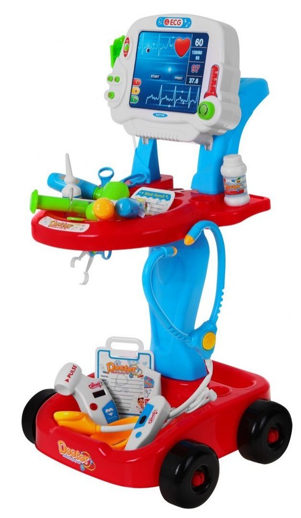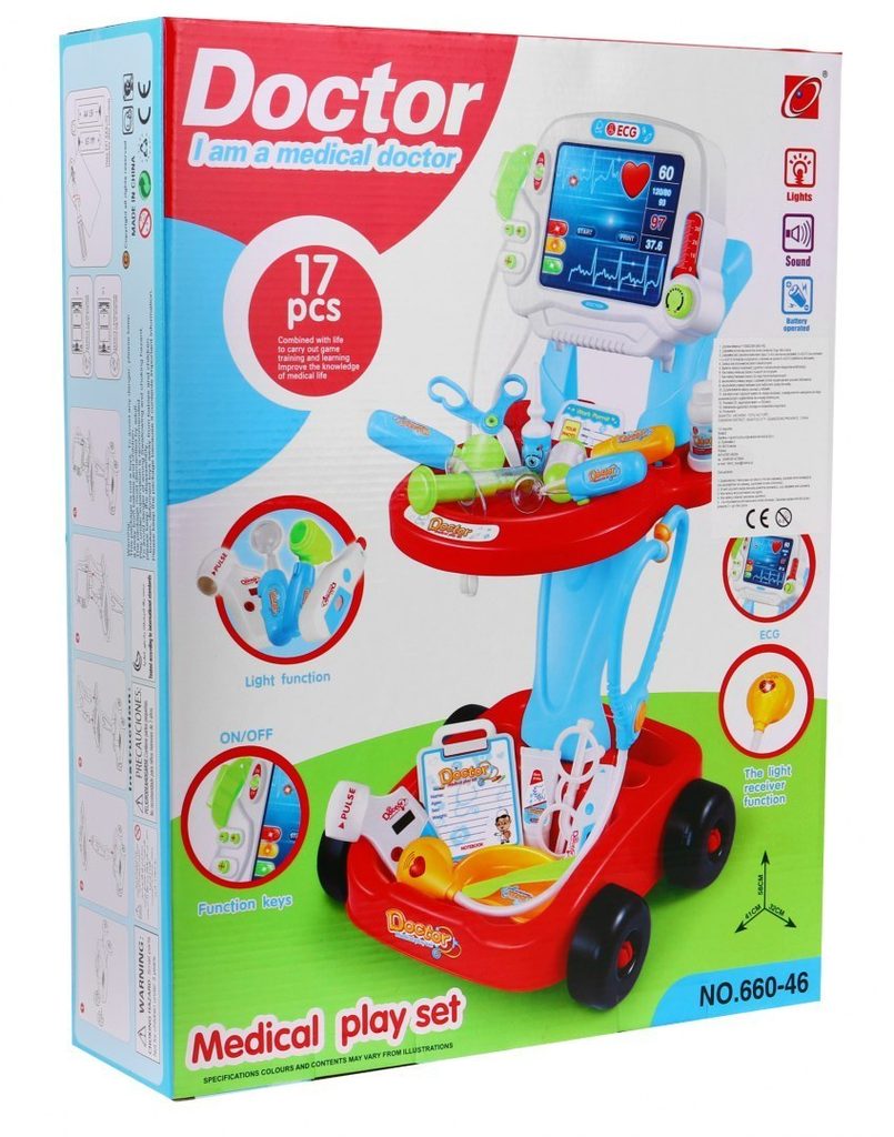 Dětský lékařský vozík s měřením EKG se zvuky a světelnými efekty je určen pro děti od 36 měsíců věku. Je vybaven celkem 17 elementy. Jako základ slouží monitor pro měření EKG, který má vypínač a zvukovou signalizaci. Dále zde najdete přístroj na stetoskop, který vydává zvuky bijícího srdce, teploměr, lékařské brýle, skalpel, měřič tlaku, neurologické kladívko a mnoho dalších užitečných věcí, které potřebuje malý doktor nebo doktorka ke své práci. Vaše dítě se určitě s touto velkou hračkou nudit nebude a návštěva u skutečného doktora pro něj nebude tolik stresující. Je vyrobena z kvalitního plastu v pestrobarevném provedení.
