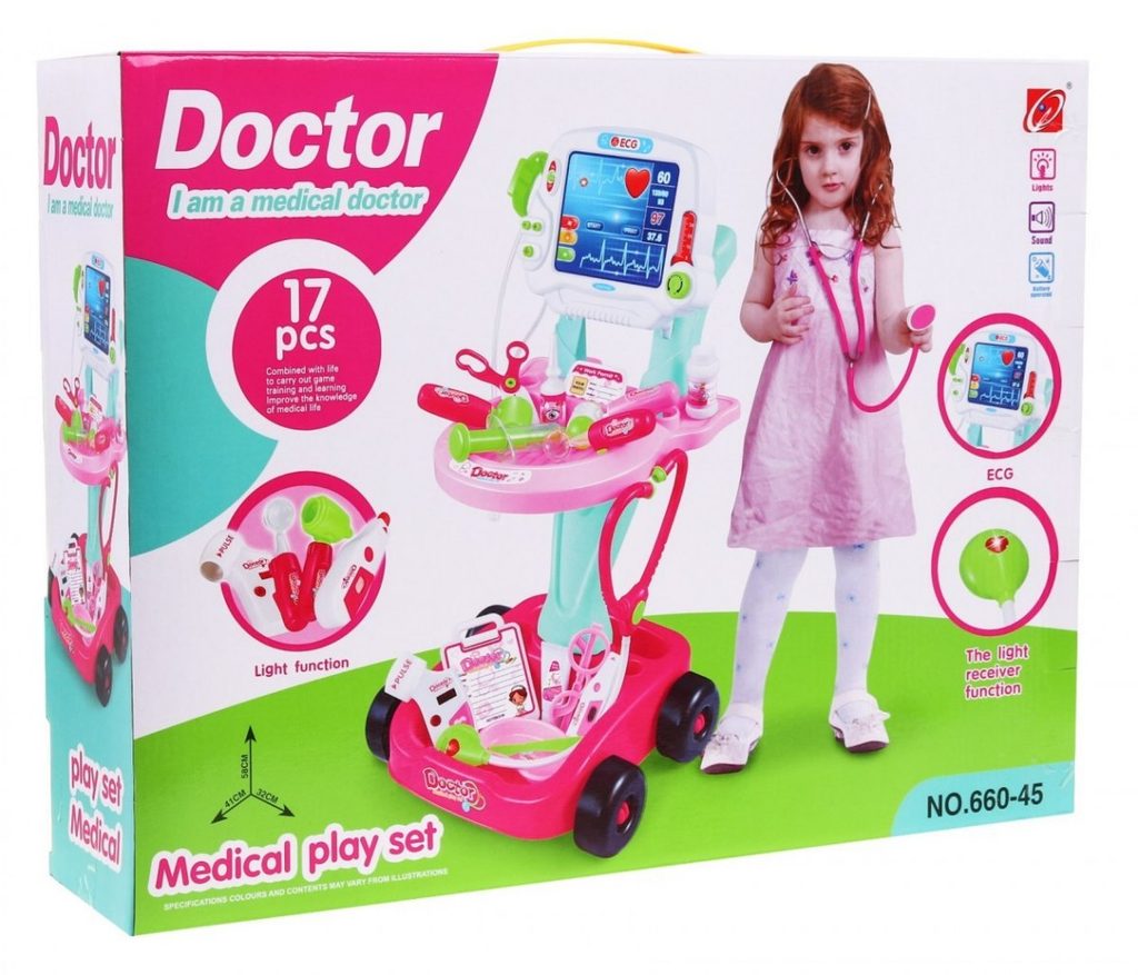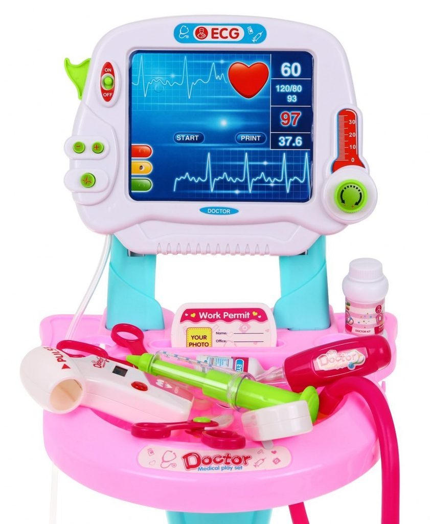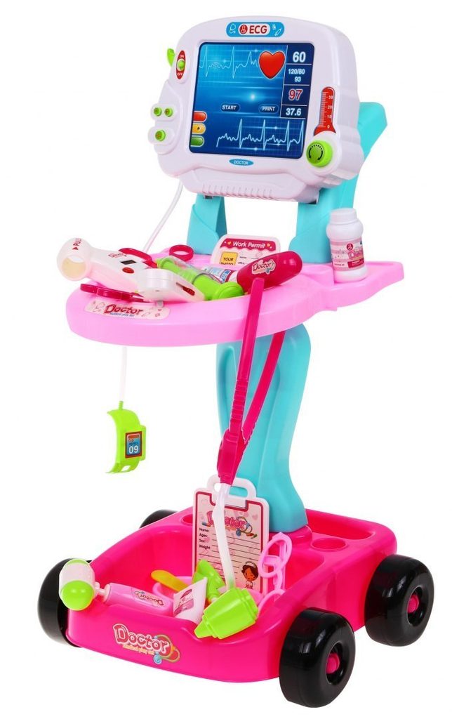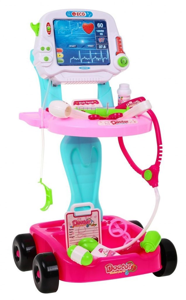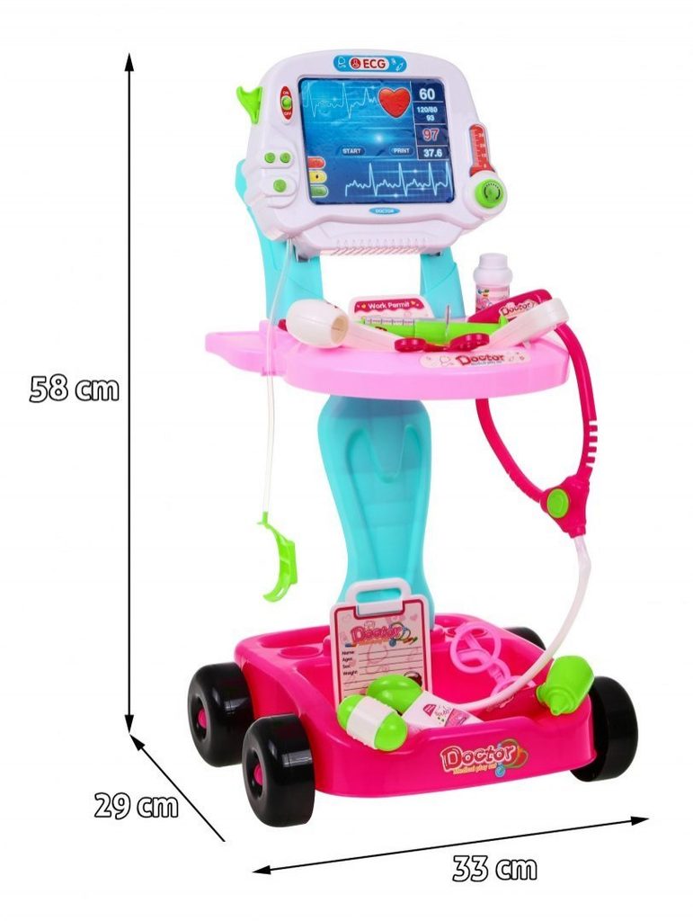 Dětský lékařský vozík s měřením EKG se zvuky a světelnými efekty je určen pro děti od 36 měsíců věku. Je vybaven celkem 17 elementy. Jako základ slouží monitor pro měření EKG, který má vypínač a zvukovou signalizaci. Dále zde najdete přístroj na stetoskop, který vydává zvuky bijícího srdce, teploměr, lékařské brýle, skalpel, měřič tlaku, neurologické kladívko a mnoho dalších užitečných věcí, které potřebuje malý doktor nebo doktorka ke své práci. Vaše dítě se určitě s touto velkou hračkou nudit nebude a návštěva u skutečného doktora pro něj nebude tolik stresující. Je vyrobena z kvalitního plastu v pestrobarevném provedení.