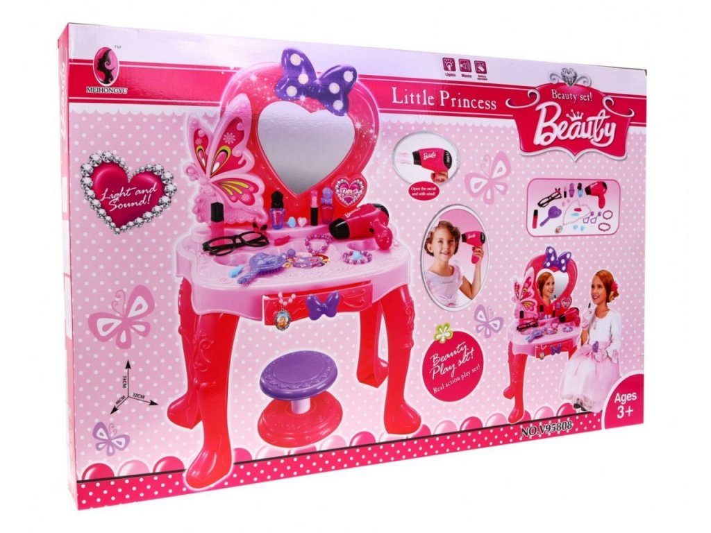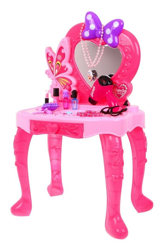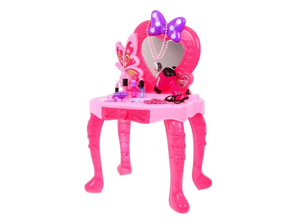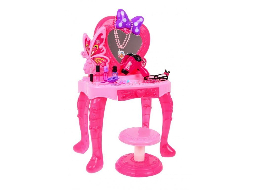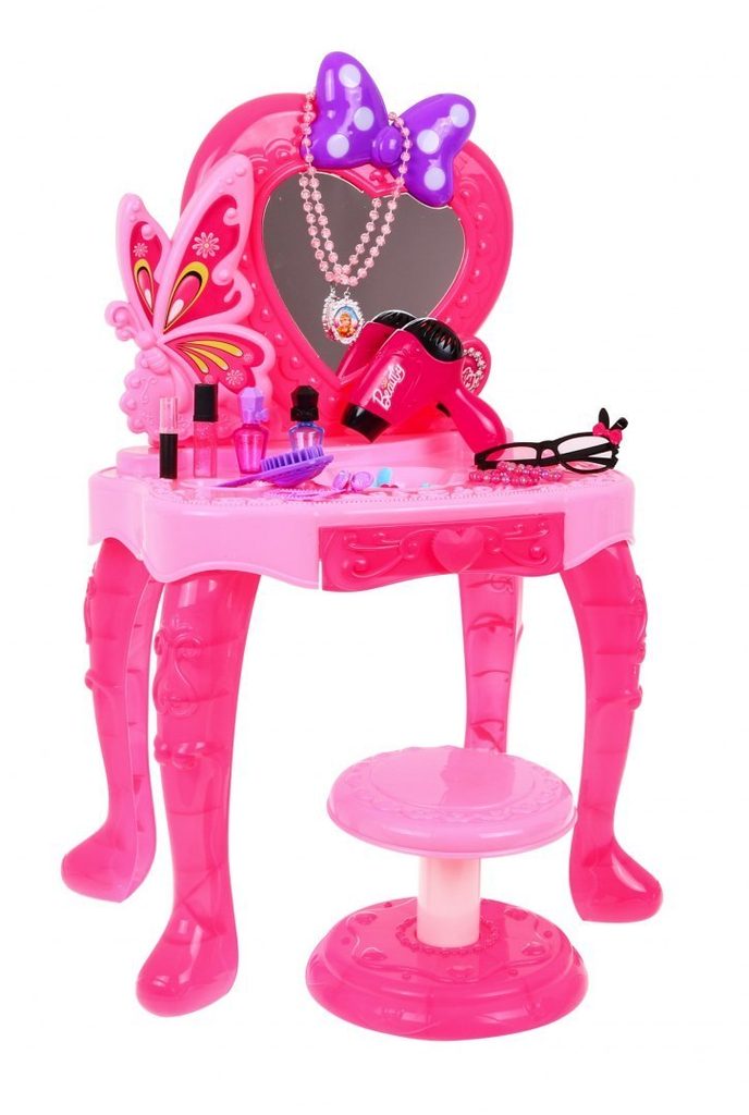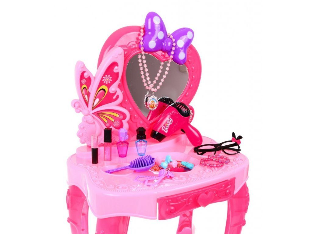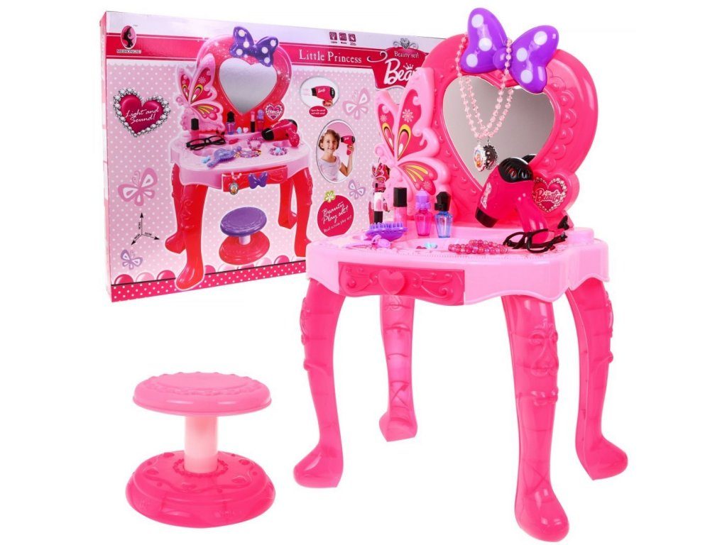Plastový toaletní stoleček musí být součástí pokojíčku každé malé princezny. Je vybaven spoustou důležitých věcí pro každou malou parádnici. Set obsahuje imitace kosmetiky, hřebínky, prstýnky, náramky, praktickou stoličku, zrcadlo na kterém je umístěna mašlička s blikotajícími světýlky. Ve stolku je také praktický šuplíček na drobnosti. Pro ještě větší zábavu má stoleček světelné efekty a vydává zvuky. Fén na baterie fouká vzduch jako by byl skutečný. Hračka je určena pro děti od 36 měsíců věku.
