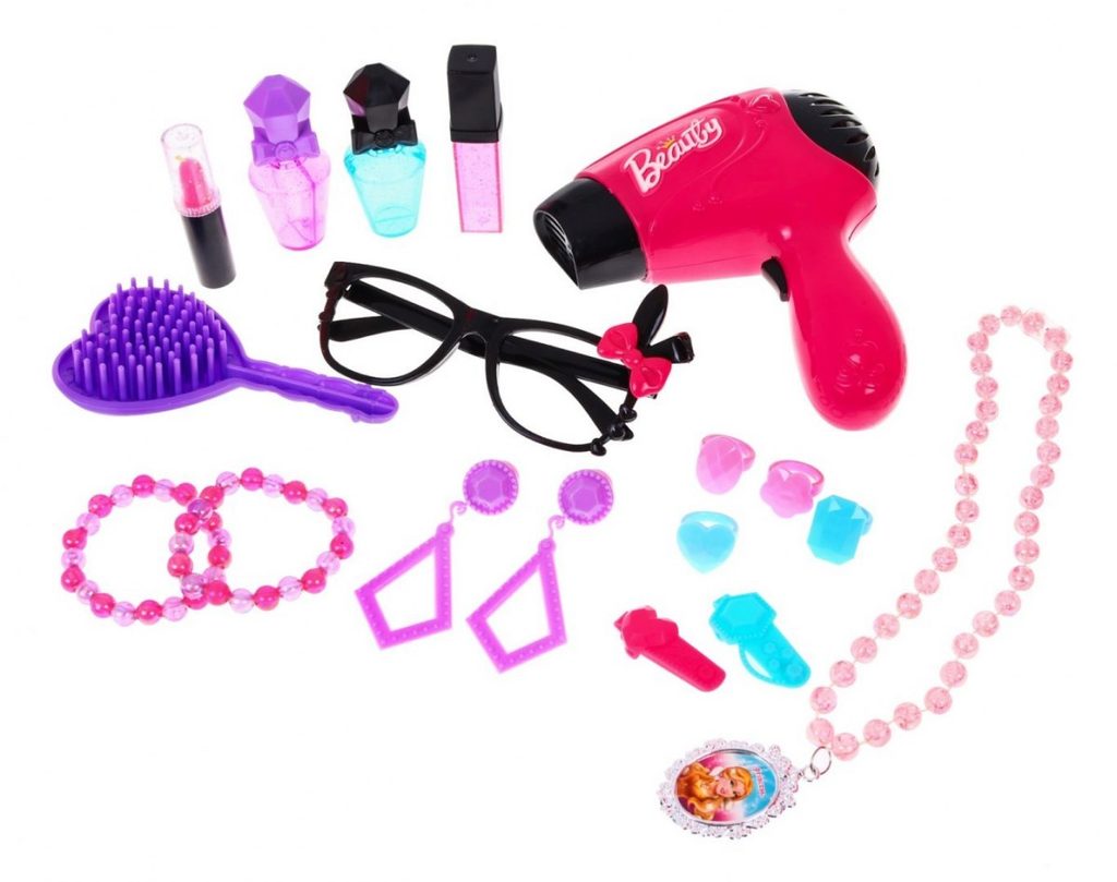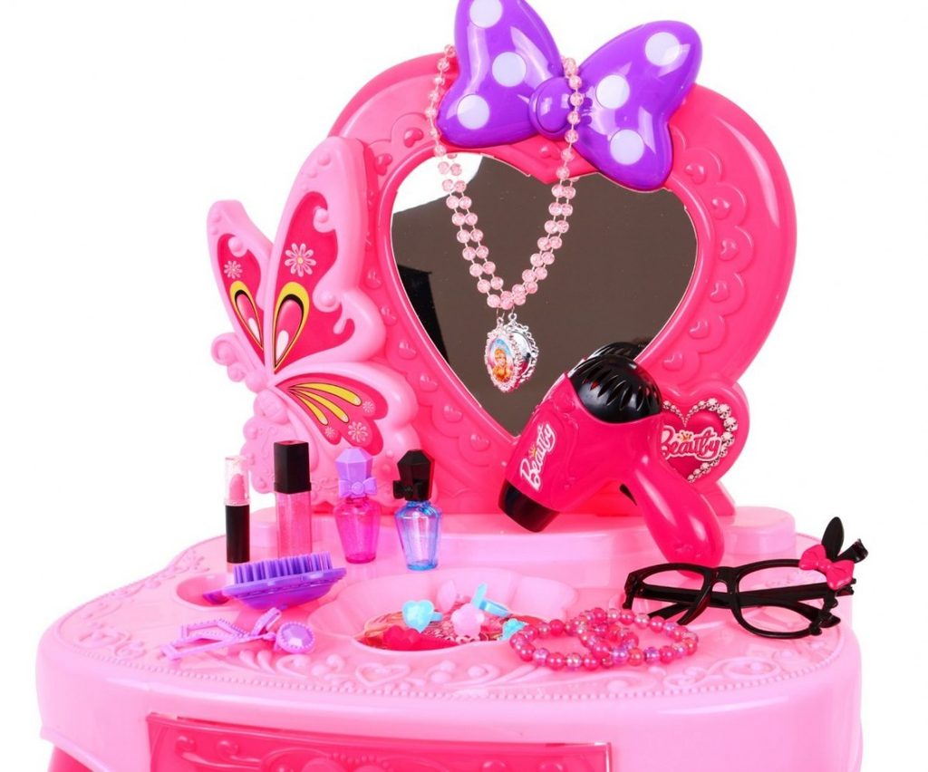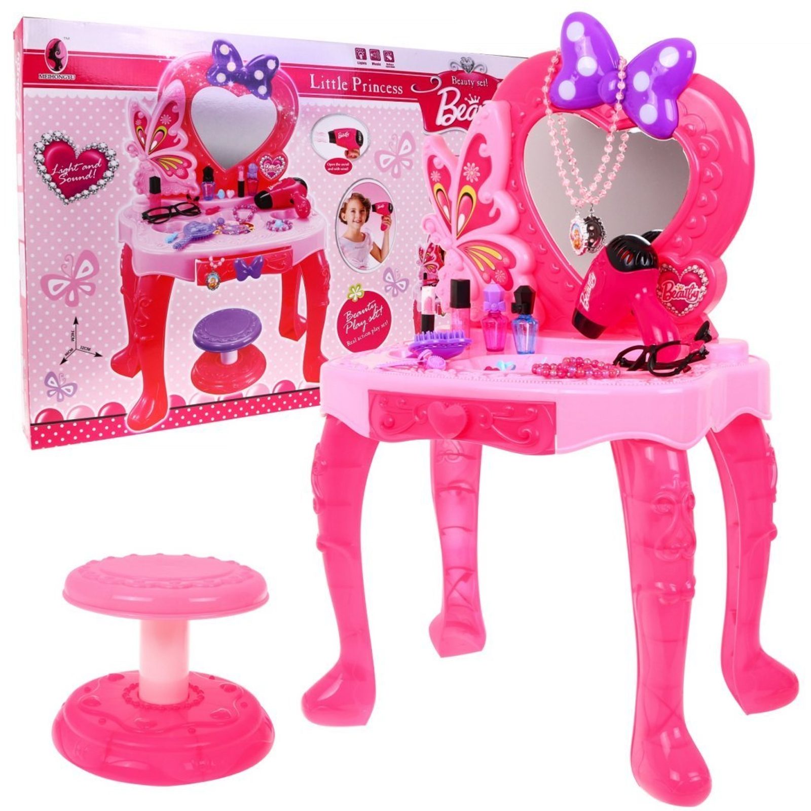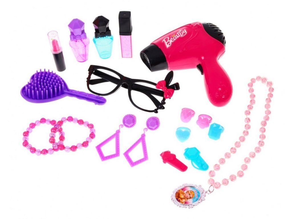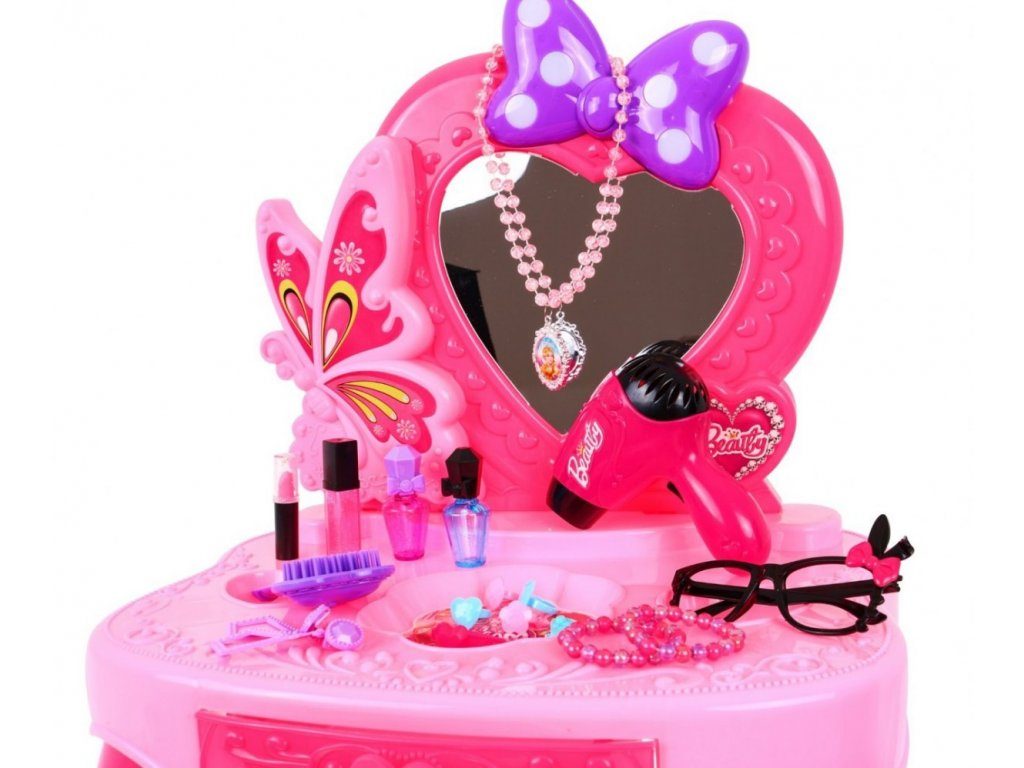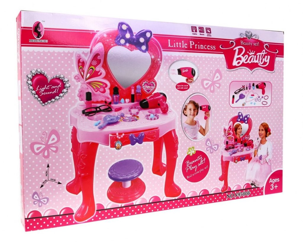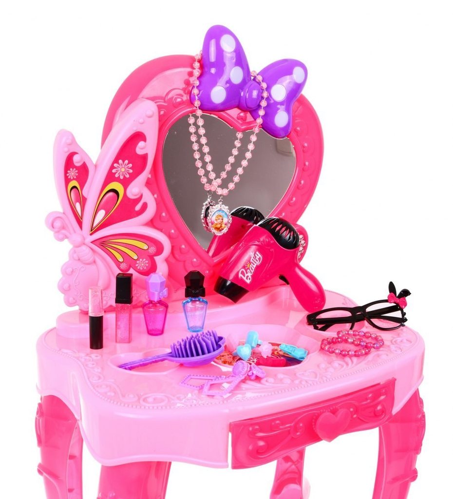 Plastový toaletní stoleček musí být součástí pokojíčku každé malé princezny. Je vybaven spoustou důležitých věcí pro každou malou parádnici. Set obsahuje imitace kosmetiky, hřebínky, prstýnky, náramky, praktickou stoličku, zrcadlo na kterém je umístěna mašlička s blikotajícími světýlky. Ve stolku je také praktický šuplíček na drobnosti. Pro ještě větší zábavu má stoleček světelné efekty a vydává zvuky. Fén na baterie fouká vzduch jako by byl skutečný. Hračka je určena pro děti od 36 měsíců věku.