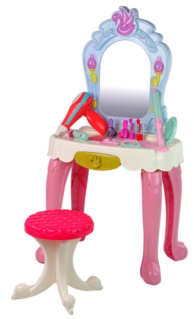Toaletní stoleček Play Dresser musí být součástí pokojíčku každé malé princezny. Je vybaven spoustou důležitých věcí pro každou malou parádnici. Set obsahuje imitace kosmetiky, hřeben, kulmu a další příslušenství. Ve stolku je také praktický šuplíček na drobnosti. Pro ještě větší zábavu má stoleček světelné efekty a vydává melodie. Fén na baterie fouká vzduch jako by byl skutečný. Hračka je určena pro děti od 36 měsíců věku.