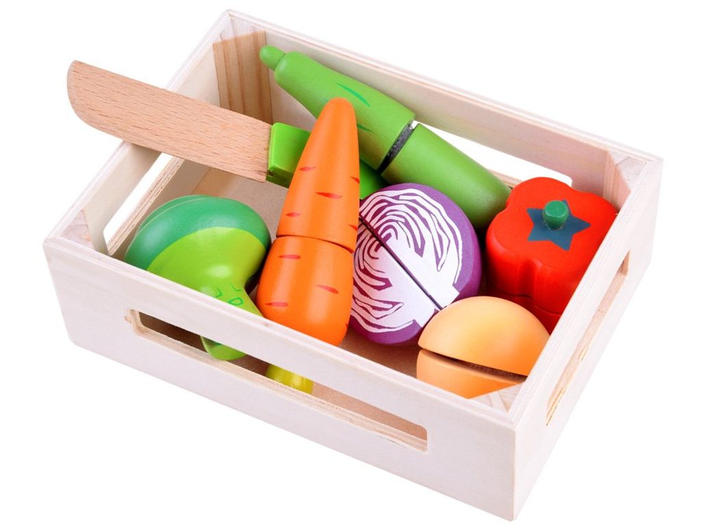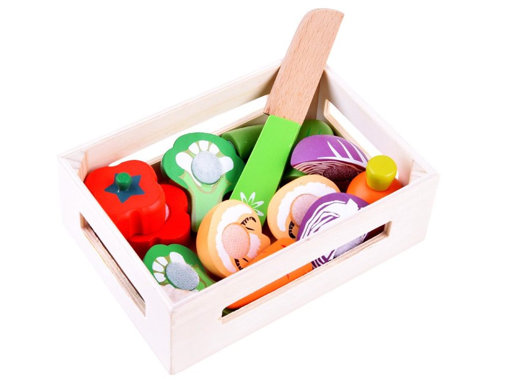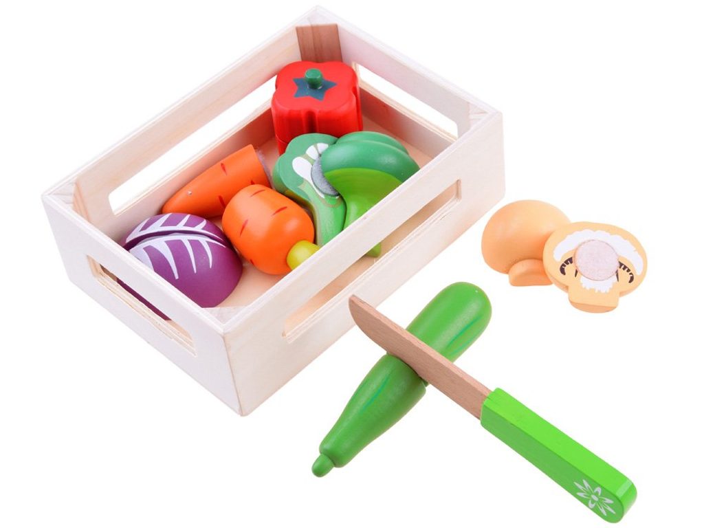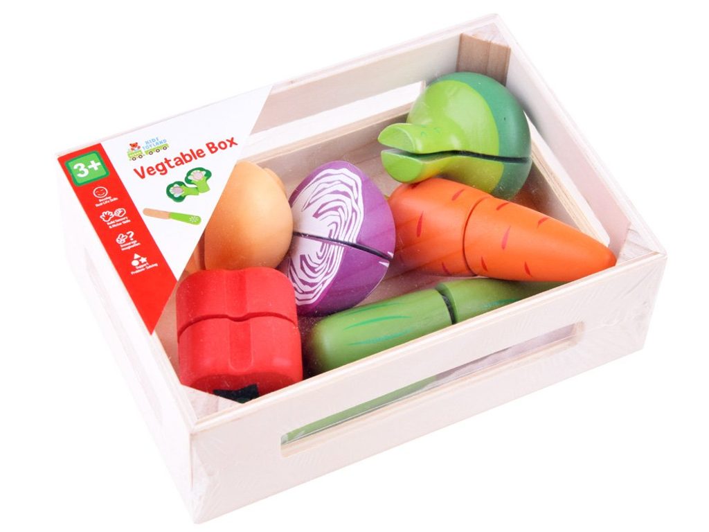 Sada dřevěné zeleniny Vegetable Box se hodí do každé dětské kuchyňky nebo si s ní může dítě hrát samostatně. Zelenina je vyrobena ze dřeva a je pokryta zdravotně nezávadnou barvou. Každou z nich lze rozpůlit a zase zpět spojit pomocí suchého zipu. Sada obsahuje nejznámější druhy zeleniny, dítě se je tak snadno naučí rozpoznávat. Vše je uloženo v praktické dřevěné bedýnce. Součástí balení je také bezpečný nůž. Tato hračka je určena pro děti od 3 let věku.