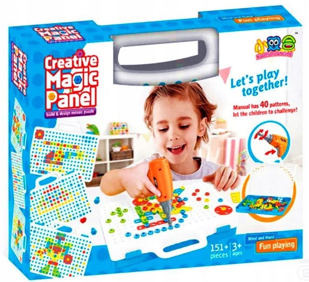 Konstrukční stavebnice Magic Panel v praktickém kufříku je ideální hračkou pro kluky i holčičky. Součástí je vrtačka na baterie se dvěma nástavci. Celkem je zde obsaženo 151 ks různých konstrukčních prvků v různých barvách, ze kterých lze šroubováním pomocí vrtačky libovolně vytvářet obrazce, mozaiky a vzory. Vše záleží jen na představivosti dítěte. Hra se stavebnicí podporuje u dětí představivost, motorické schopnosti a trpělivost. Hračka je určena pro děti od 36 měsíců věku.