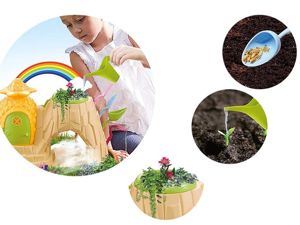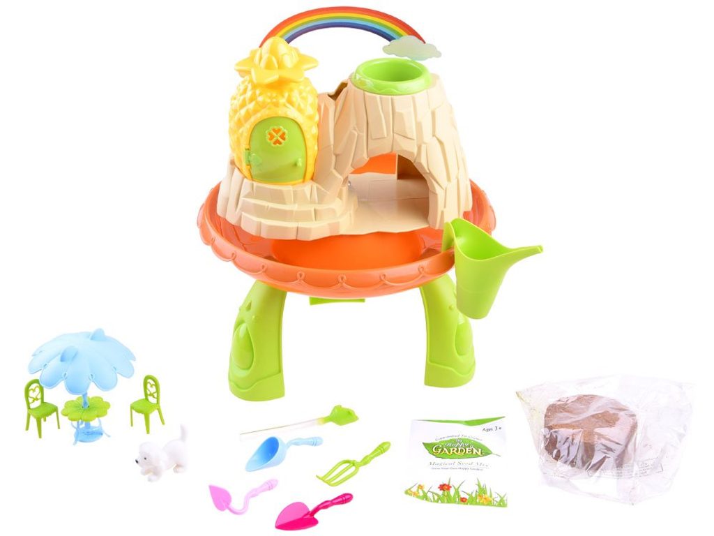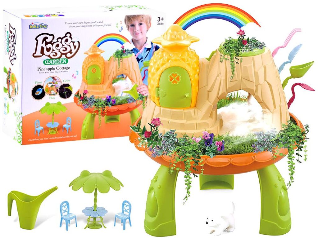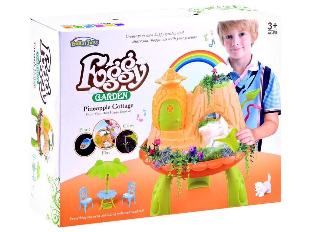 Magická zahrádka Foggy Garden se světlem a zvukem je snem každého malého zahradníka a umožní mu mít celoroční zahradu ve svém pokoji. Tato hračka podněcuje představivost, ale také učí zodpovědnost, péči a empatii. Dítě se naučí sadit, zalévat, pěstovat a zároveň sledovat jak rostlinky postupně rostou. V jeskyni je umístěno tlačítko, které spouští světýlka, melodie a po nalití vody také efektní vodní páru. Dalšími dodatečnými prvky v sadě jsou zahradní nábytek, plastový pejsek, ananasový domeček s otevíracími dvířky a samozřejmě kompletní zahradní nářadí. Zahrádka bude perfektní hračka jak pro chlapce, tak pro dívku.
