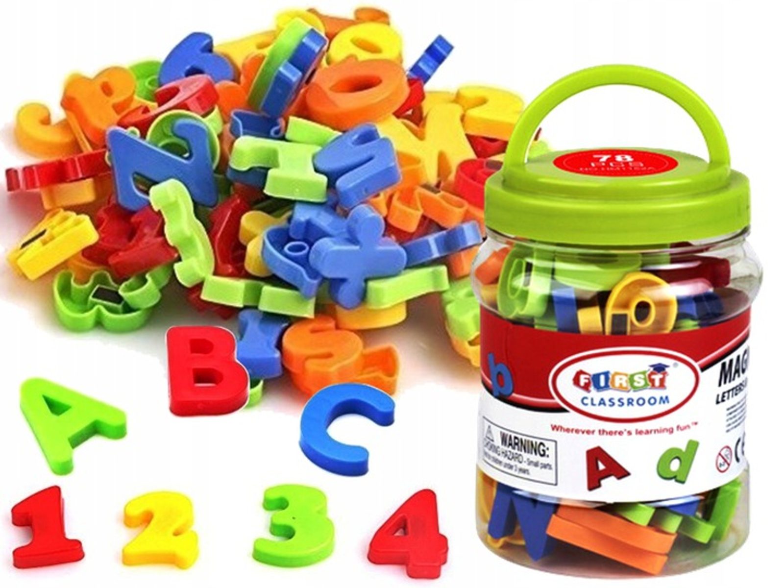 Sada magnetických písmenek a číslic First Classroom 78 kusů je určena pro děti od 36 měsíců věku. Slouží pro první vzdělávání, rozvíjí dětskou kreativitu, logické myšlení a rozpoznávání barev a tvarů. Pomocí magnetu je lze umístit na jakoukoli magnetickou tabuli, lednici nebo položit na vodorovnou plochu.