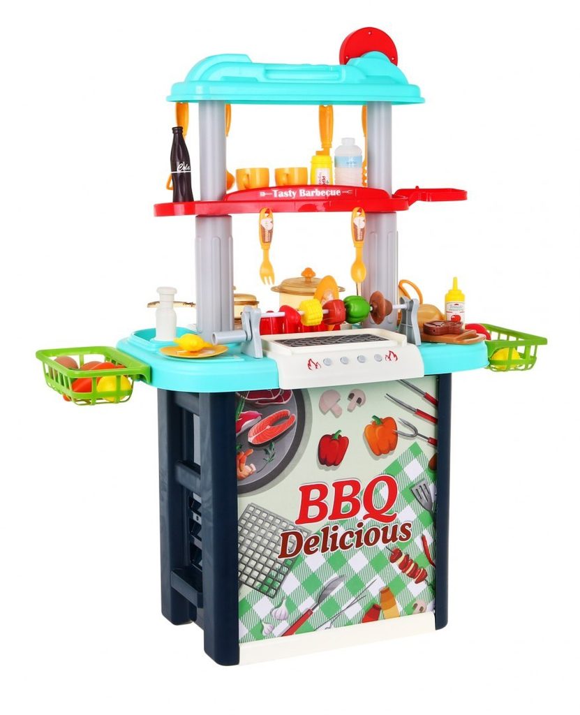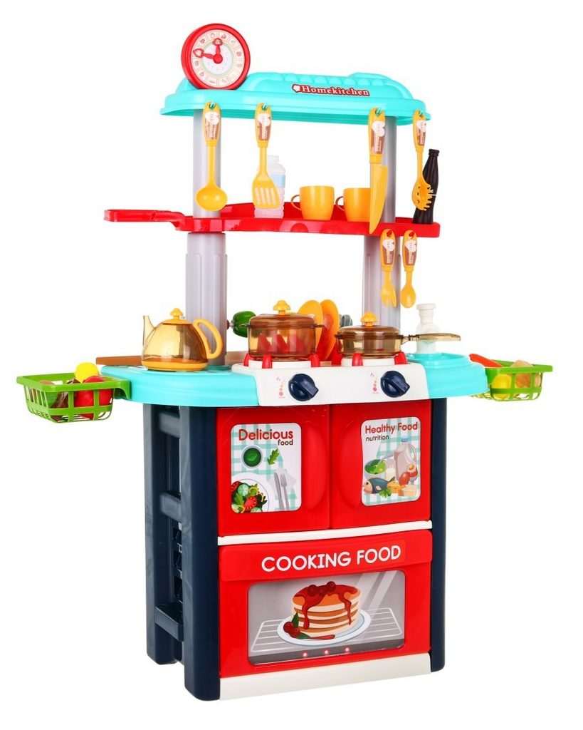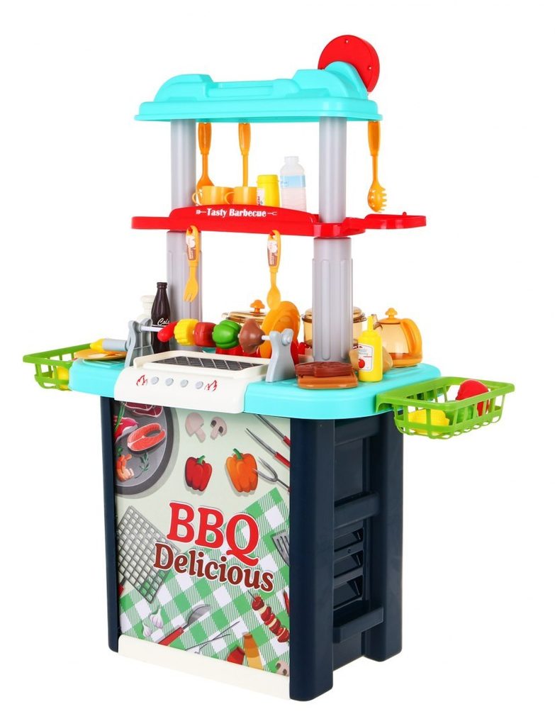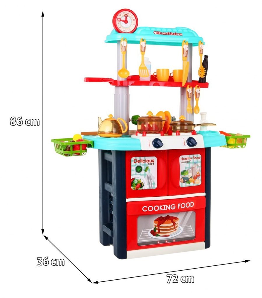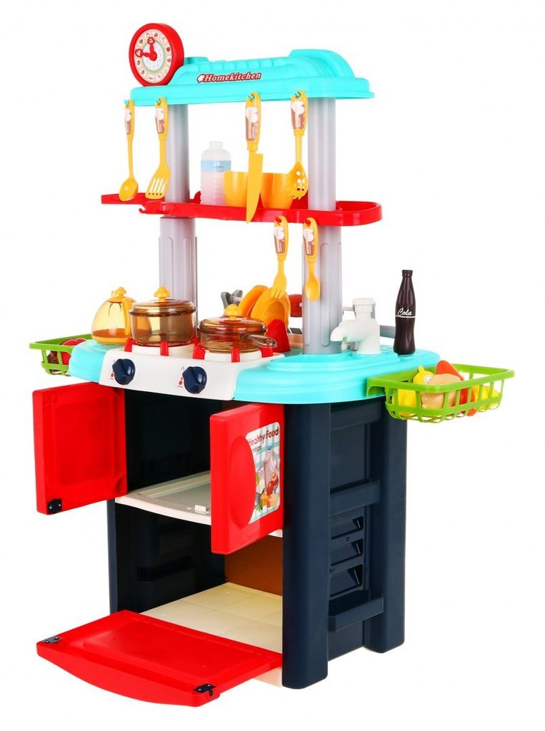 Oboustranná dětská dětská kuchyňka GuGu Kitchen se zvuky, světlem, studenou párou a tekoucí vodou je určena pro děti od 36 měsíců věku. Z jedné strany kuchyňky jsou umístěny hořáky na druhé straně je umístěný grill. Je vybavena celkem 61 elementy jako jsou příbory, pánev, podnos, konvice, hrnec s poklicí, hotová jídla, imitace ovoce a zeleniny a mnoho dalších. Jeden hořák způsobuje po nalití malého množství vody efekt studené páry takže vaření bude opravdu jako skutečné. Grill je podsvětlený a vydává zvuky vaření. Po nalití vody do dřezu začne téct voda a děti mohou mýt nádobí jako v reálné kuchyni. Vaše dítě se určitě s touto velkou kuchyňkou nudit nebude. Trouba a skříňka jsou otevírací. V horní části jsou umístěny hodiny s otočnými ručičkami a praktická polička. Kuchyňka je vyrobena z kvalitního plastu v pestrobarevném provedení.