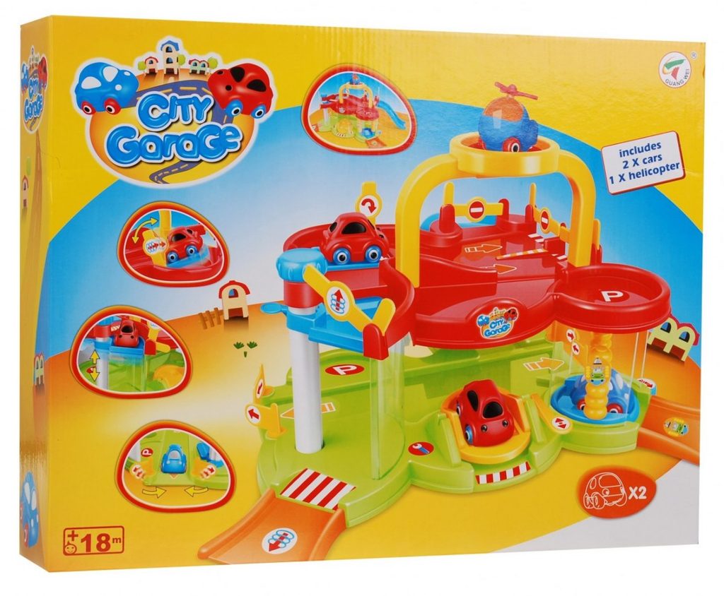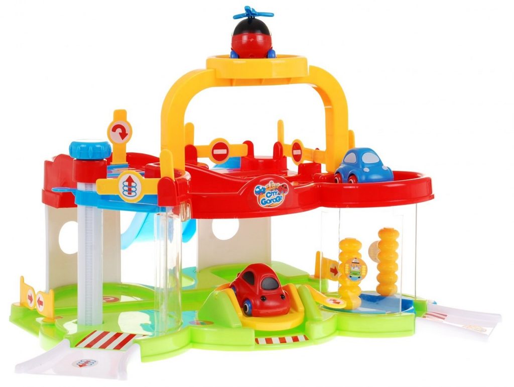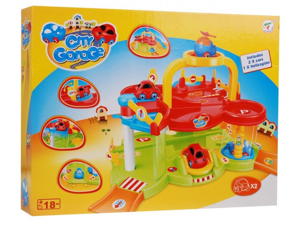 Dětská dvoupatrová garáž pro nejmenší děti se 2 autíčky a vrtulníkem. Součástí parkoviště je pohyblivý výtah, který umožňuje přesouvat autíčka mezi jednotlivými patry, přistávací plocha vrtulníku a sjezd. Mladý motoristický nadšenec zde nalezne vše co potřebuje. Vyrobena z velmi kvalitního materiálu bez ostrých hran. Hračka je určena pro děti od 18 měsíců věku.