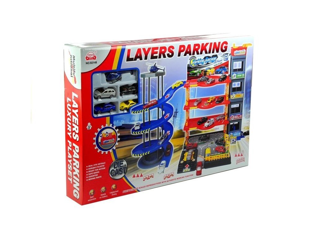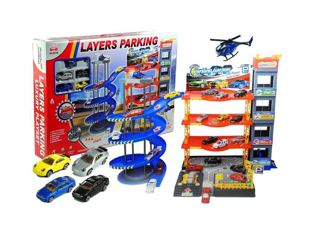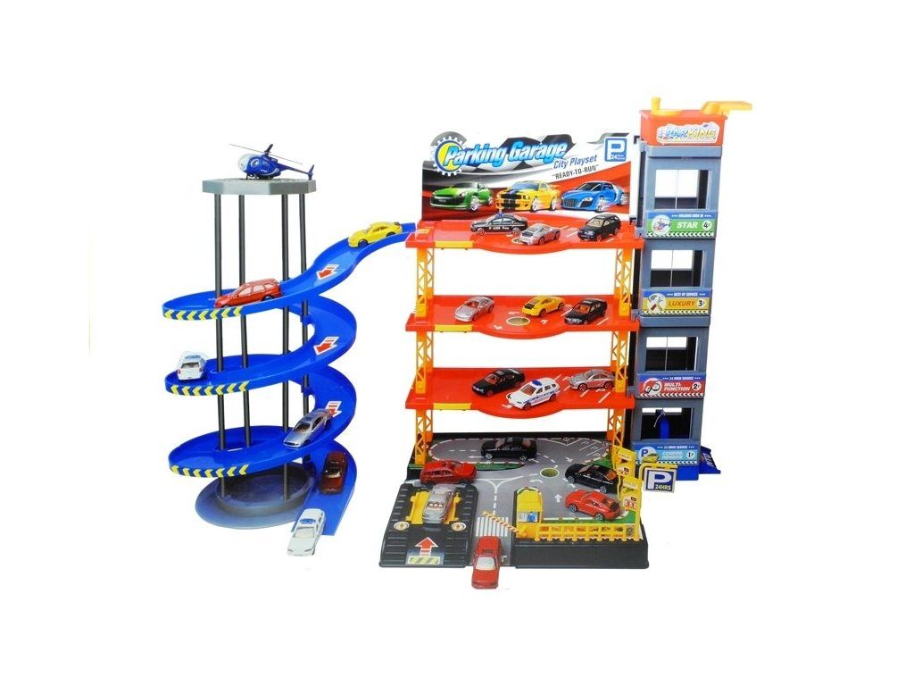 Dětská patrová garáž se 4 kovovými autíčky a vrtulníkem. Součástí parkoviště je pohyblivý výtah, který umožňuje přesouvat autíčka mezi jednotlivými patry, benzínová pumpa, přistávací plocha vrtulníku a spousta nálepek. Jednotlivá patra jsou propojena spirálovitou dráhou. Mladý motoristický nadšenec zde nalezne vše co potřebuje. Vyrobena z velmi kvalitního materiálu bez ostrých hran.