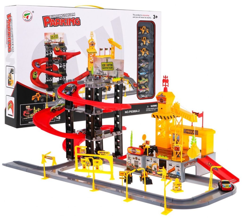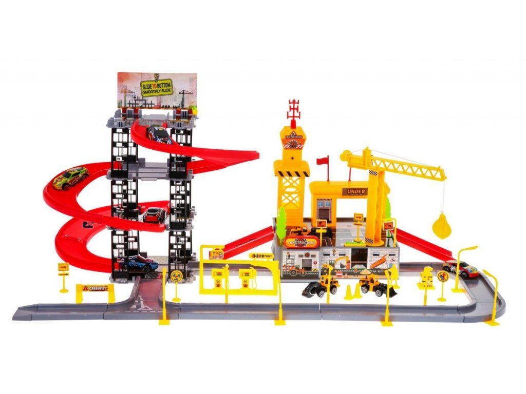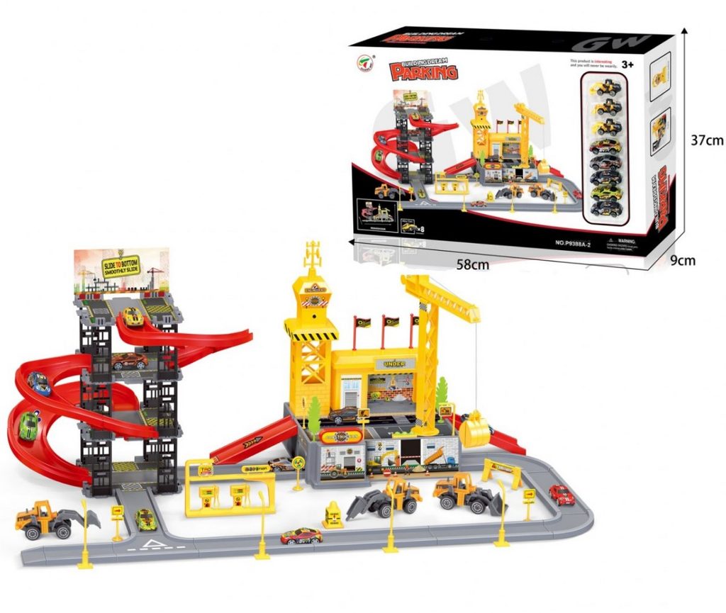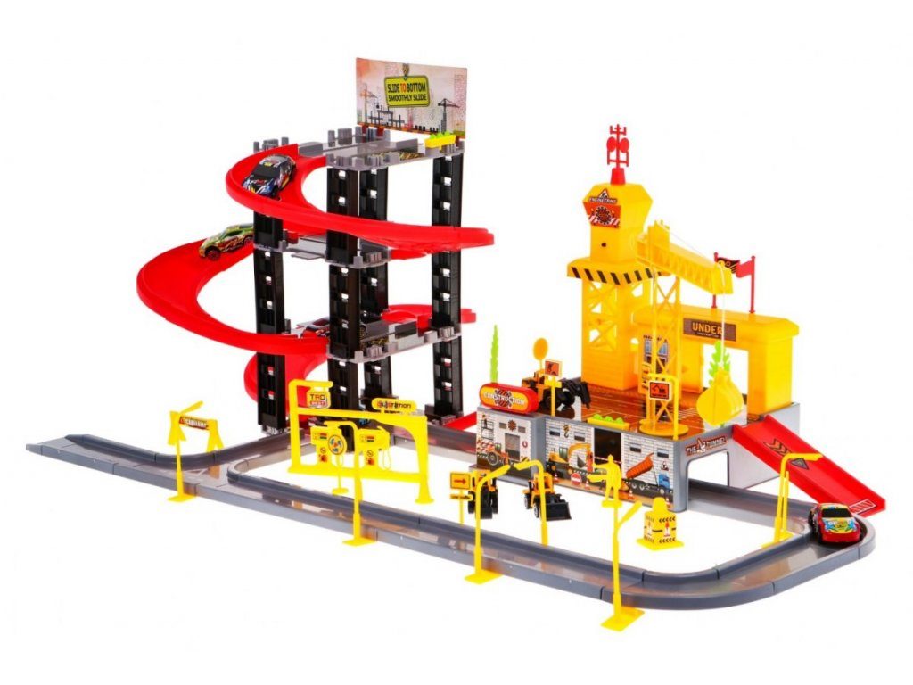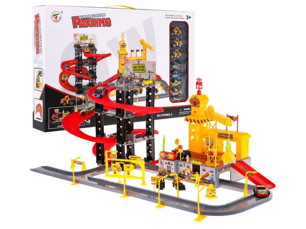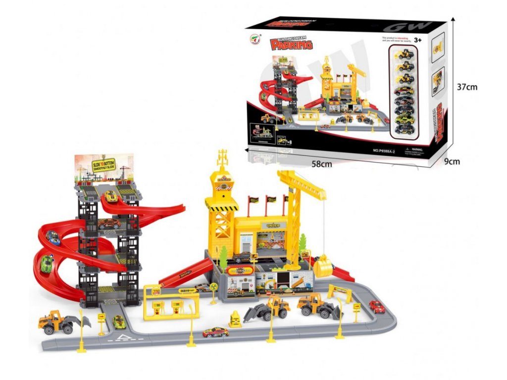 Dětská patrová garáž s 8 autíčky a staveništěm Building Garage. V jedná části najdete 4 patrové parkoviště se sjížděcí dráhou, ve druhé je potom stavební část s tunelem, jeřábem a věžičkou, která vydává zvuky alarmu. 5 autíček jsou osobní auta a ostatní jsou stavební stroje. Součástí parkoviště jsou taky dopravní značky, benzínová pumpa, pouliční lampy, postavička dělníka a nálepky. Mladý motoristický nadšenec zde nalezne vše co potřebuje. Vyrobena z plastu bez ostrých hran a určena pro děti od 3 let