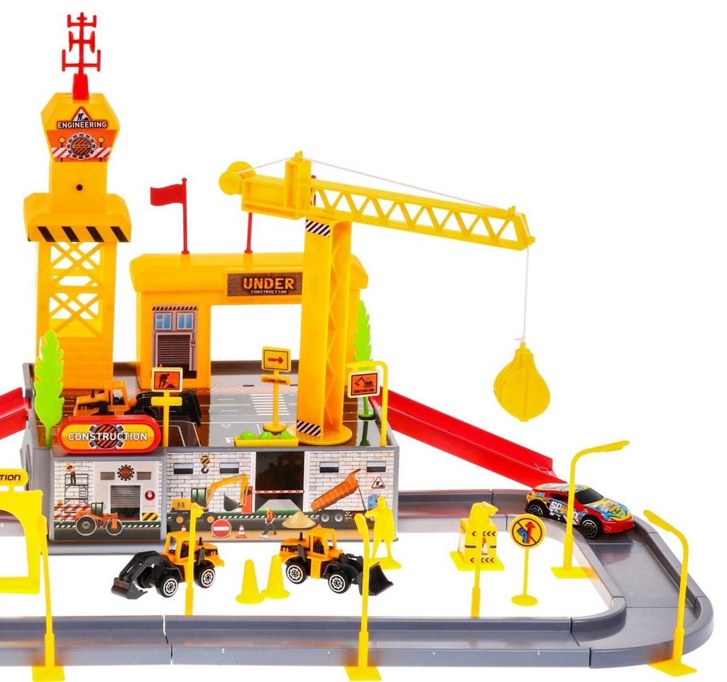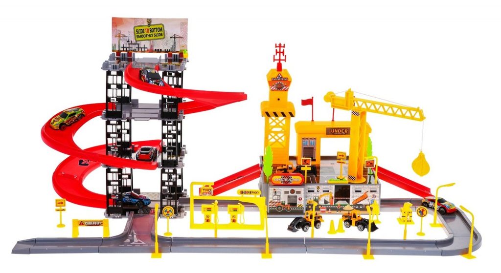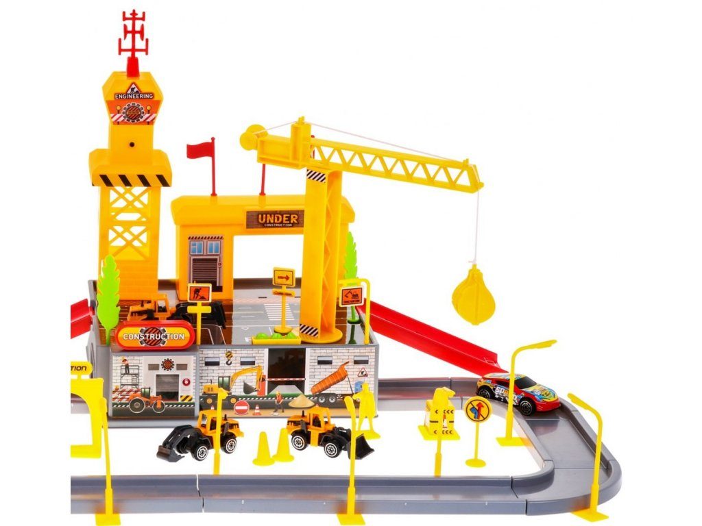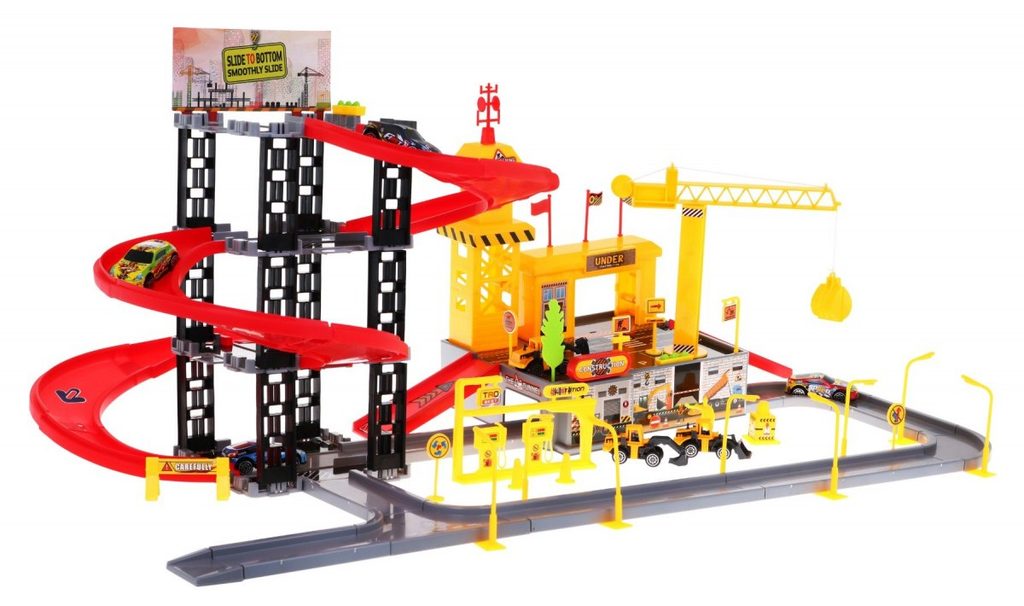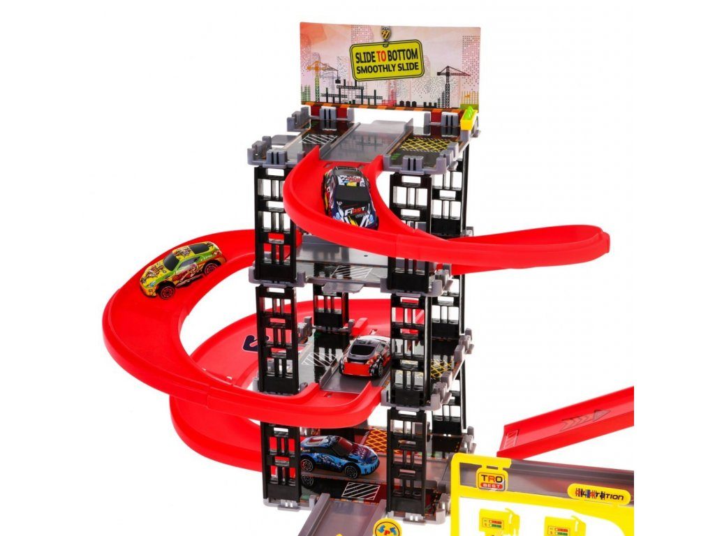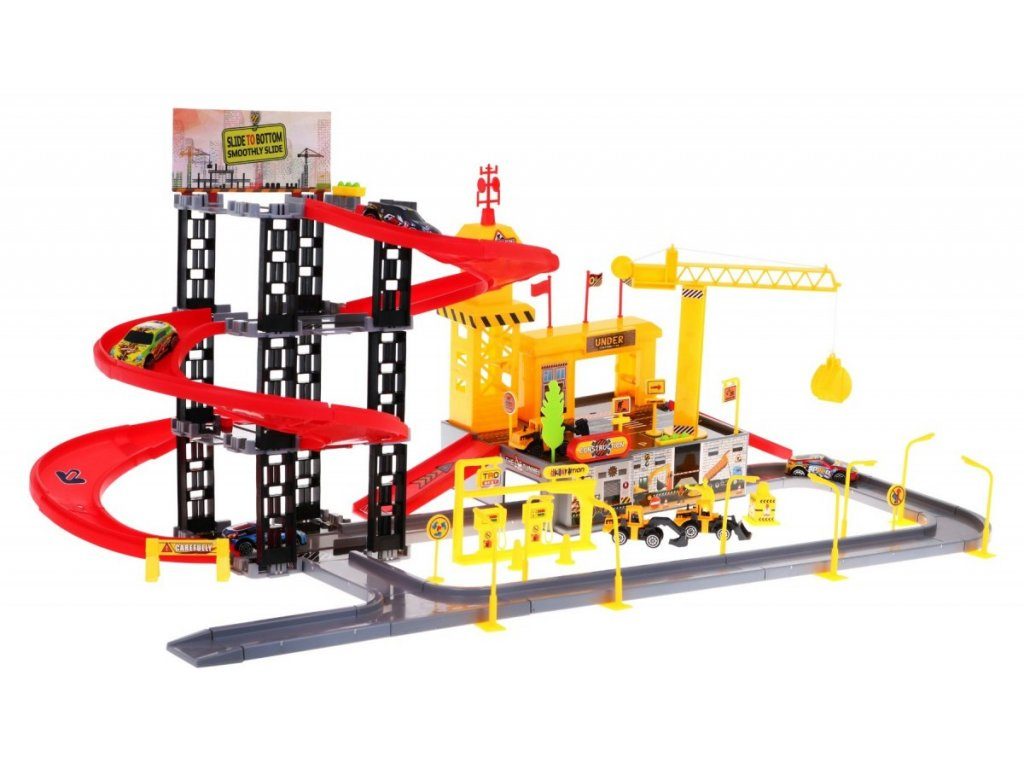 Dětská patrová garáž s 8 autíčky a staveništěm Building Garage. V jedná části najdete 4 patrové parkoviště se sjížděcí dráhou, ve druhé je potom stavební část s tunelem, jeřábem a věžičkou, která vydává zvuky alarmu. 5 autíček jsou osobní auta a ostatní jsou stavební stroje. Součástí parkoviště jsou taky dopravní značky, benzínová pumpa, pouliční lampy, postavička dělníka a nálepky. Mladý motoristický nadšenec zde nalezne vše co potřebuje. Vyrobena z plastu bez ostrých hran a určena pro děti od 3 let