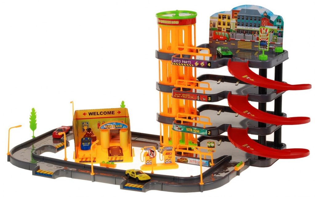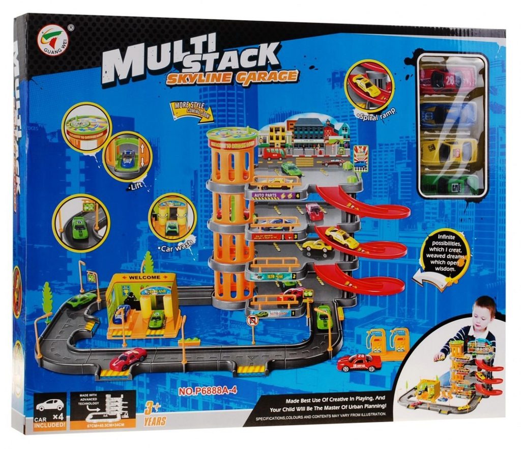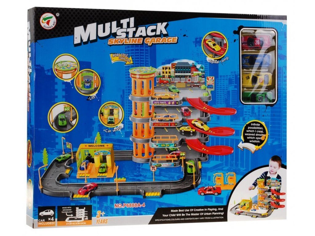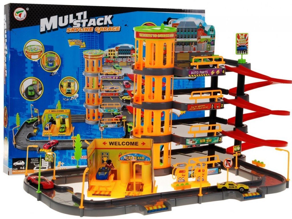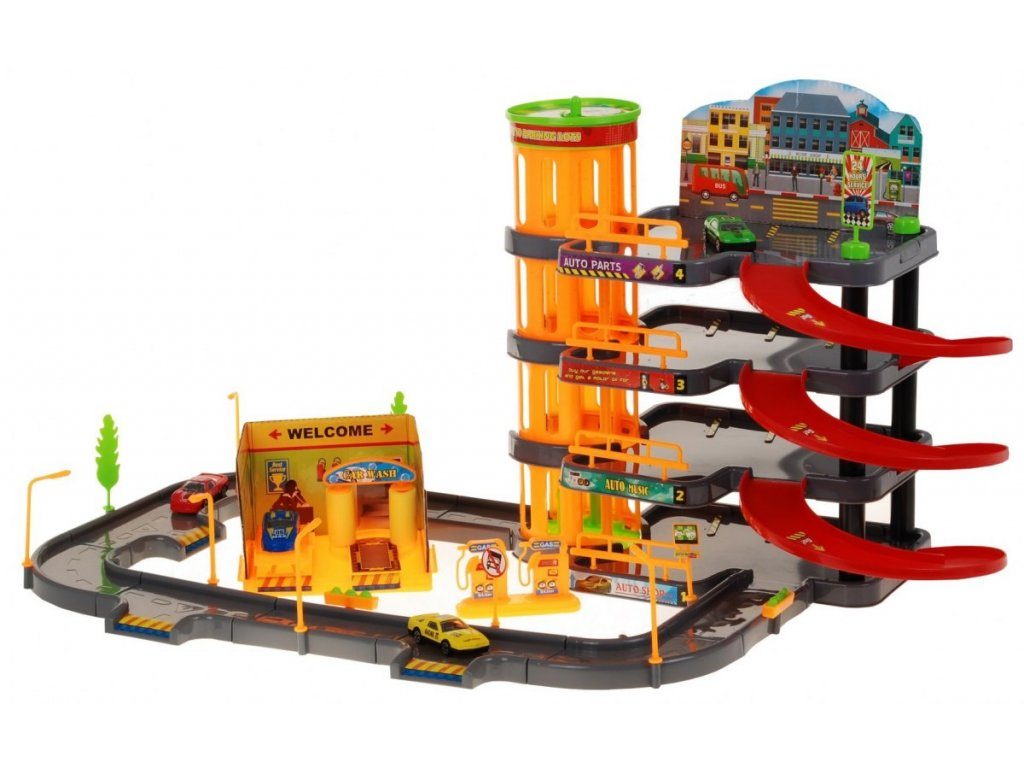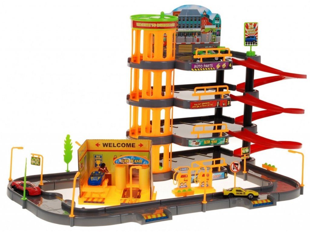 Dětská patrová garáž se 4 autíčky a výtahem. Součástí parkoviště je pohyblivý výtah, který umožňuje přesouvat autíčka mezi jednotlivými patry, benzínová pumpa, myčka aut, dopravní značky a lampy. Jednotlivá patra jsou propojena spirálovitou dráhou a ve spodní části je umístěna okružní dráha. Mladý motoristický nadšenec zde nalezne vše co potřebuje. Vyrobena z kvalitního materiálu bez ostrých hran. Hračka je učena pro děti od 3 let věku.