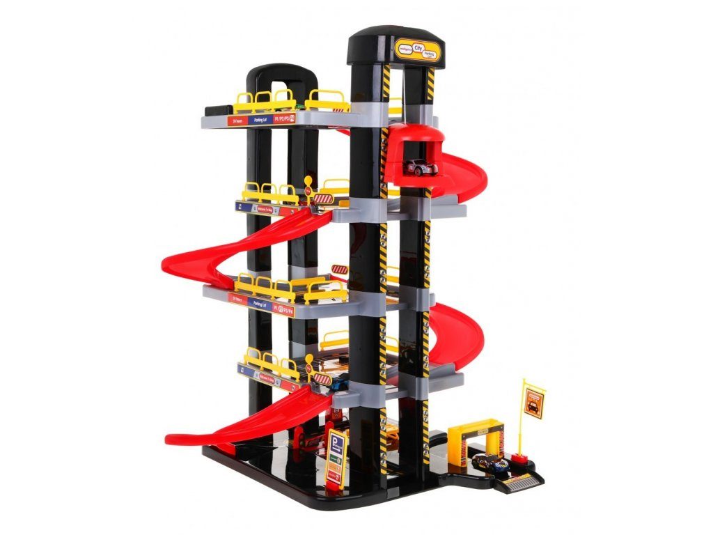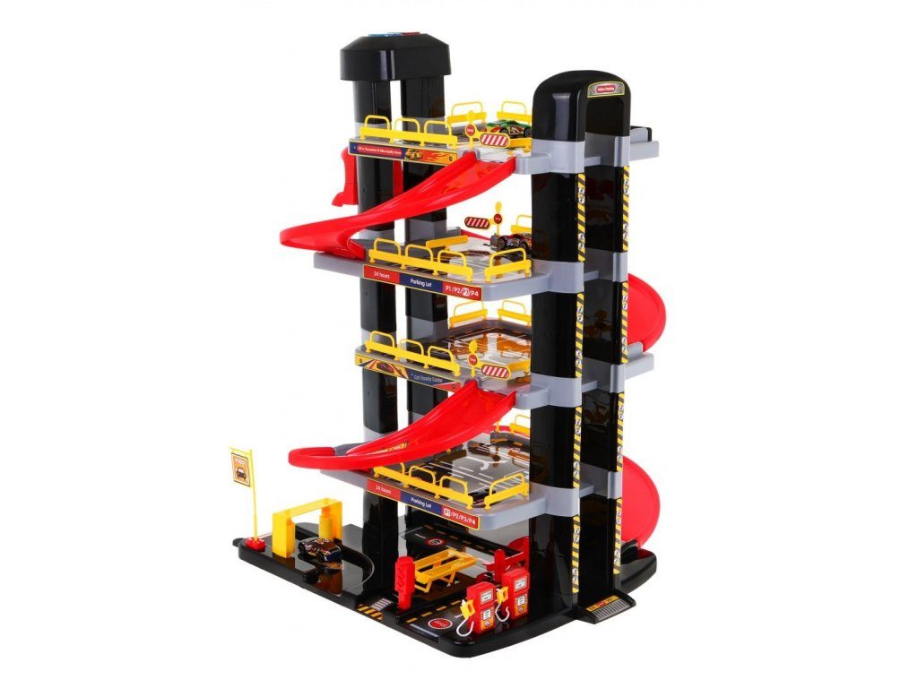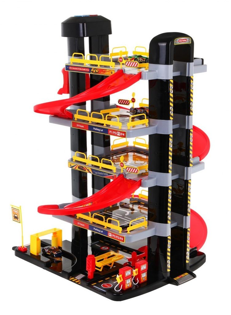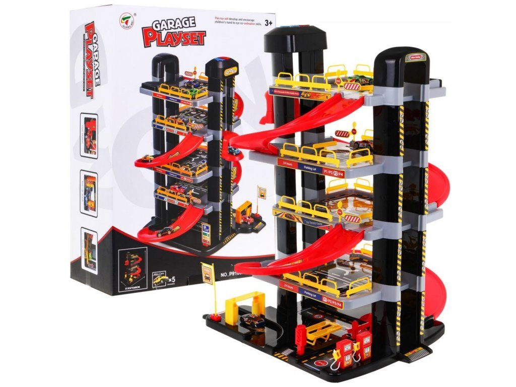 Dětská pětipatrová garáž s 5 autíčky a pohyblivým výtahem a příslušenstvím Big Garage. Všechna podlaží jsou propojena sjížděcí dráhou a také pohyblivým výtahem na baterie, který za jízdy bliká. Ve spodní části parkoviště se nachází benzínová pumpa, myčka a autoservis. Mladý motoristický nadšenec zde nalezne vše co potřebuje. Je vyrobena z plastu bez ostrých hran a určena pro děti od 3 let.