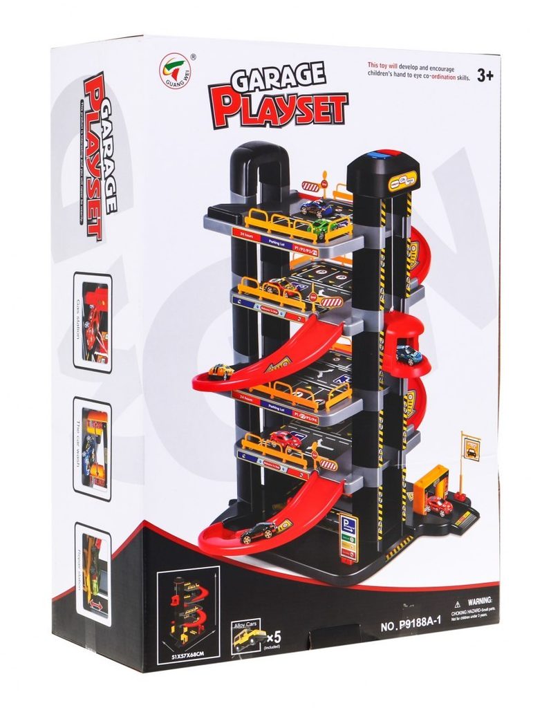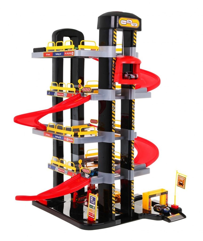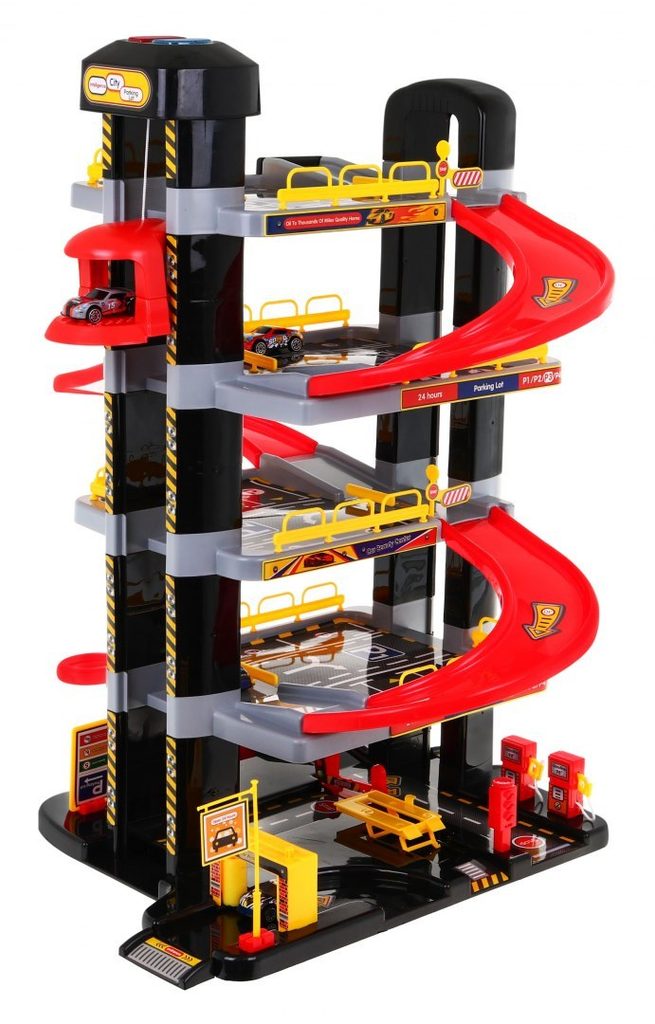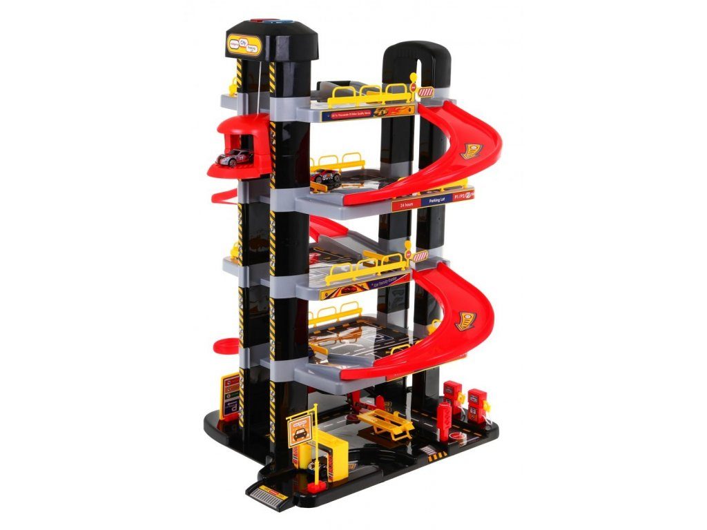 Dětská pětipatrová garáž s 5 autíčky a pohyblivým výtahem a příslušenstvím Big Garage. Všechna podlaží jsou propojena sjížděcí dráhou a také pohyblivým výtahem na baterie, který za jízdy bliká. Ve spodní části parkoviště se nachází benzínová pumpa, myčka a autoservis. Mladý motoristický nadšenec zde nalezne vše co potřebuje. Je vyrobena z plastu bez ostrých hran a určena pro děti od 3 let.
