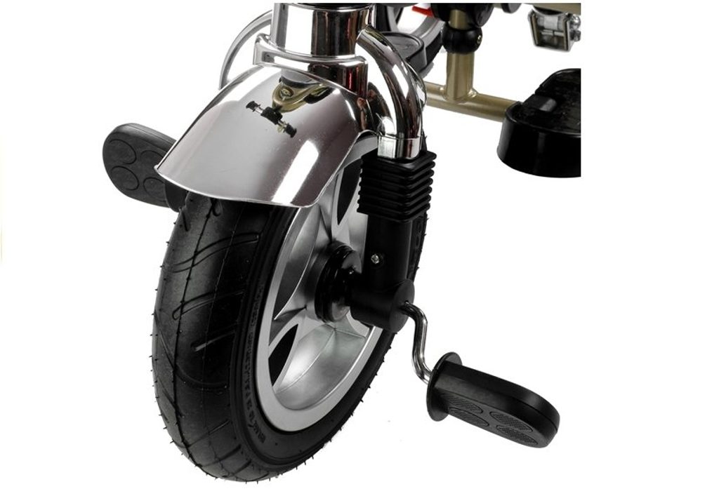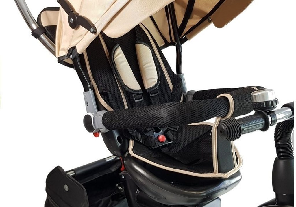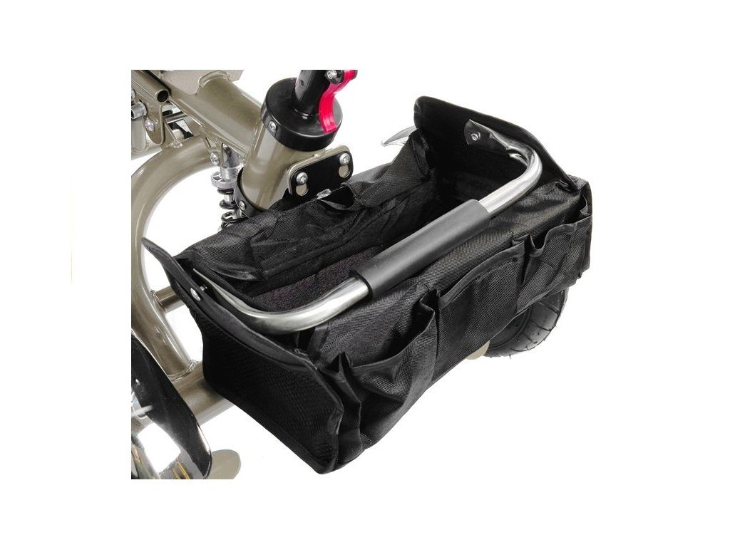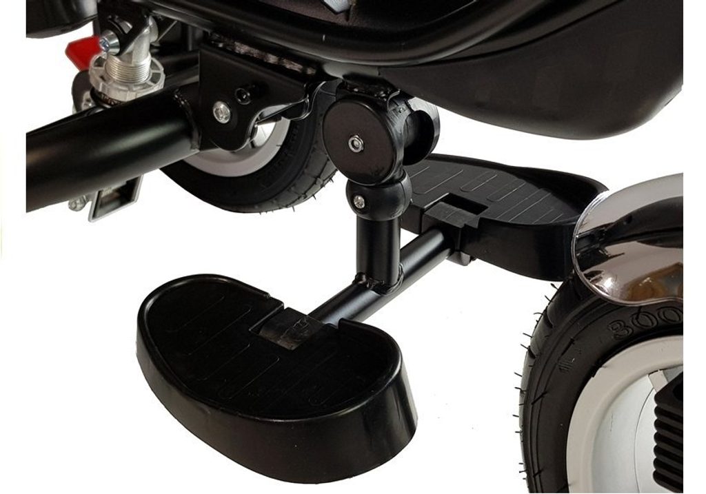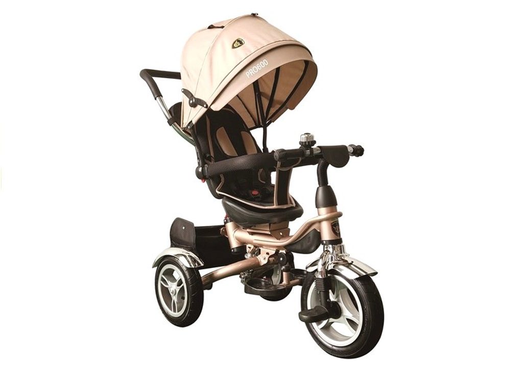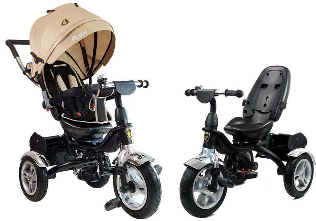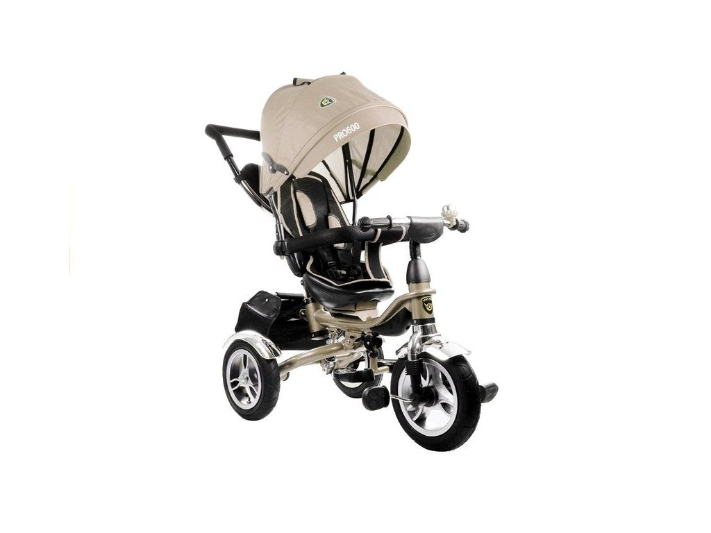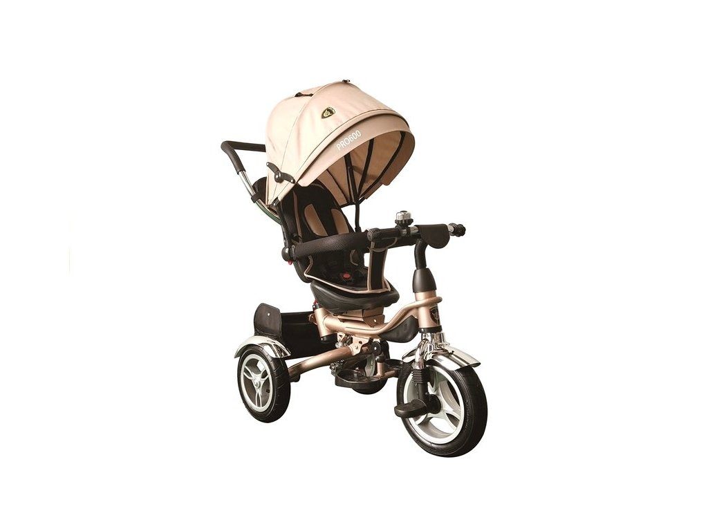 Dětská tříkolka 2v1 PRO600 s nafukovacími koly. Primárně určena pro děti od 3 do 5 let, ale využití najde i pro menší děti. Vybavena praktickou stříškou proti slunci. V zadní části je umístěn velký koš na hračky, mezi vodící tyčí potom taška na drobnosti. Tříkolka má pevnou ocelovou konstrukci a robustní nafukovací kola. Pro menší děti slouží sklopná stupátka. Čalouněné madlo zabraňuje vypadnutí dítěte z kočárku. Na řídítkách je zvoneček. Pomocí vodící tyče mohou tříkolku řídit i rodiče. Tříkolku můžete zcela odstrojit, demontovat stříšku, vodící tyč, ochrannou bariéru a stupátka. Dítě tak může jezdit zcela samo.