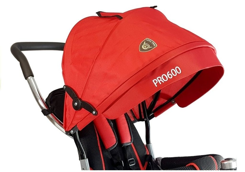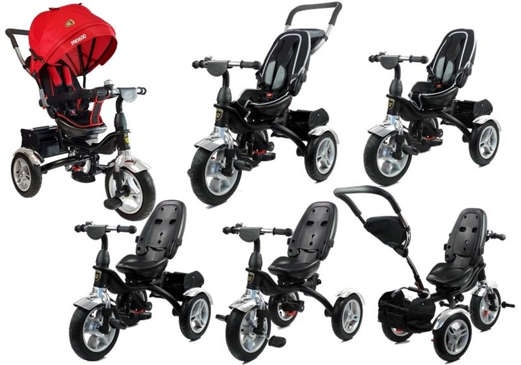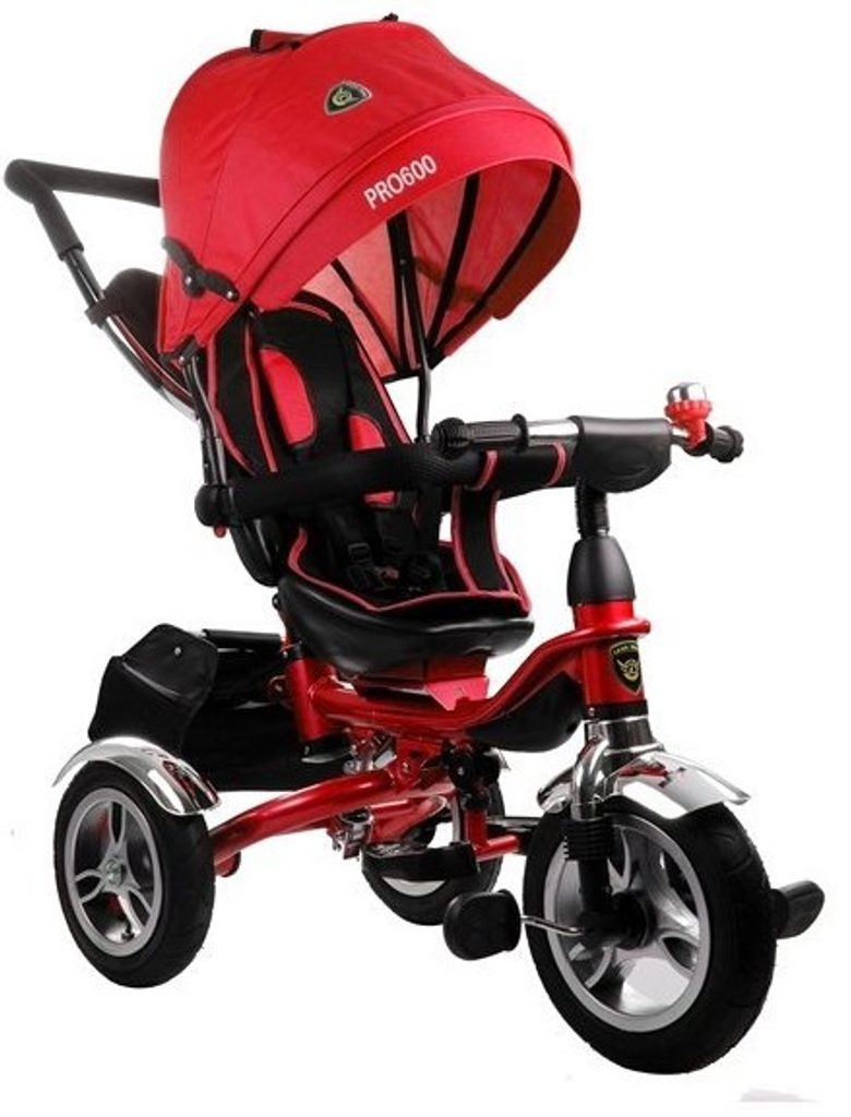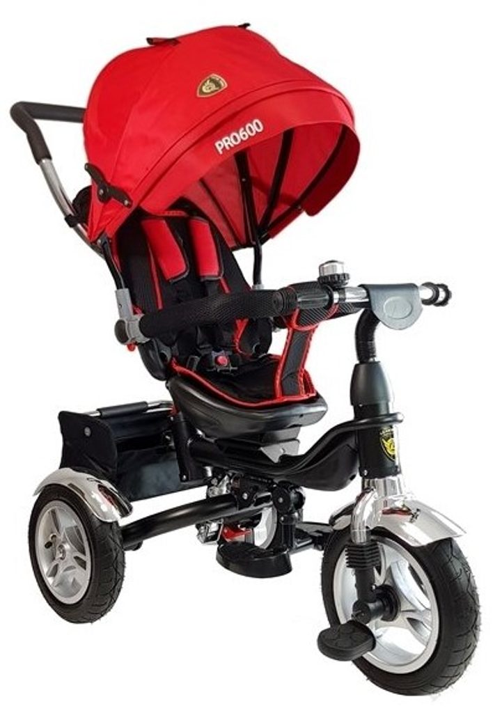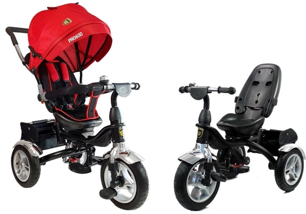 Dětská tříkolka 2v1 PRO600 s nafukovacími koly. Primárně určena pro děti od 3 do 5 let, ale využití najde i pro menší děti. Vybavena praktickou stříškou proti slunci. V zadní části je umístěn velký koš na hračky, mezi vodící tyčí potom taška na drobnosti. Tříkolka má pevnou ocelovou konstrukci a robustní nafukovací kola. Pro menší děti slouží sklopná stupátka. Čalouněné madlo zabraňuje vypadnutí dítěte z kočárku. Na řídítkách je zvoneček. Pomocí vodící tyče mohou tříkolku řídit i rodiče. Tříkolku můžete zcela odstrojit, demontovat stříšku, vodící tyč, ochrannou bariéru a stupátka. Dítě tak může jezdit zcela samo.