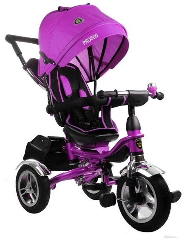 Dětská tříkolka 2v1 PRO600 s nafukovacími koly.  Primárně určena pro děti od 3 do 5 let, ale využití najde i pro menší děti. Vybavena praktickou stříškou proti slunci. V zadní části je umístěn velký koš na hračky, mezi vodící tyčí potom taška na drobnosti. Tříkolka má pevnou ocelovou konstrukci a robustní nafukovací kola. Pro menší děti slouží sklopná stupátka. Čalouněné madlo zabraňuje vypadnutí dítěte z kočárku. Na řídítkách je zvoneček. Pomocí vodící tyče mohou tříkolku řídit i rodiče. Tříkolku můžete zcela odstrojit, demontovat stříšku, vodící tyč, ochrannou bariéru a stupátka. Dítě tak může jezdit zcela samo.