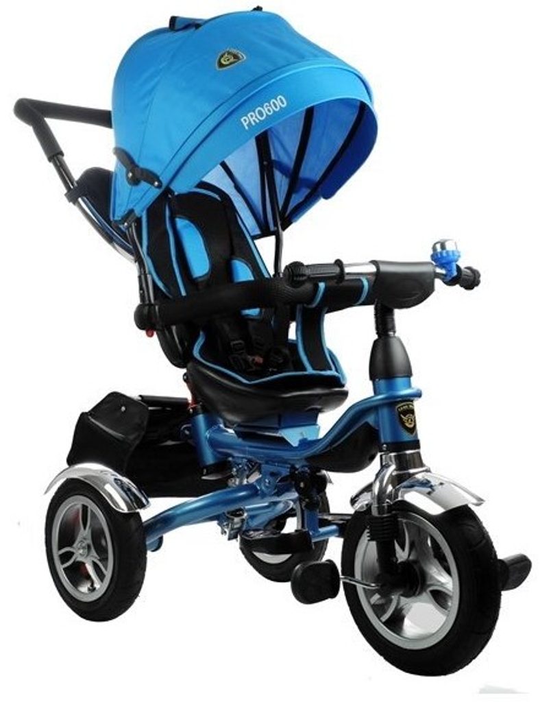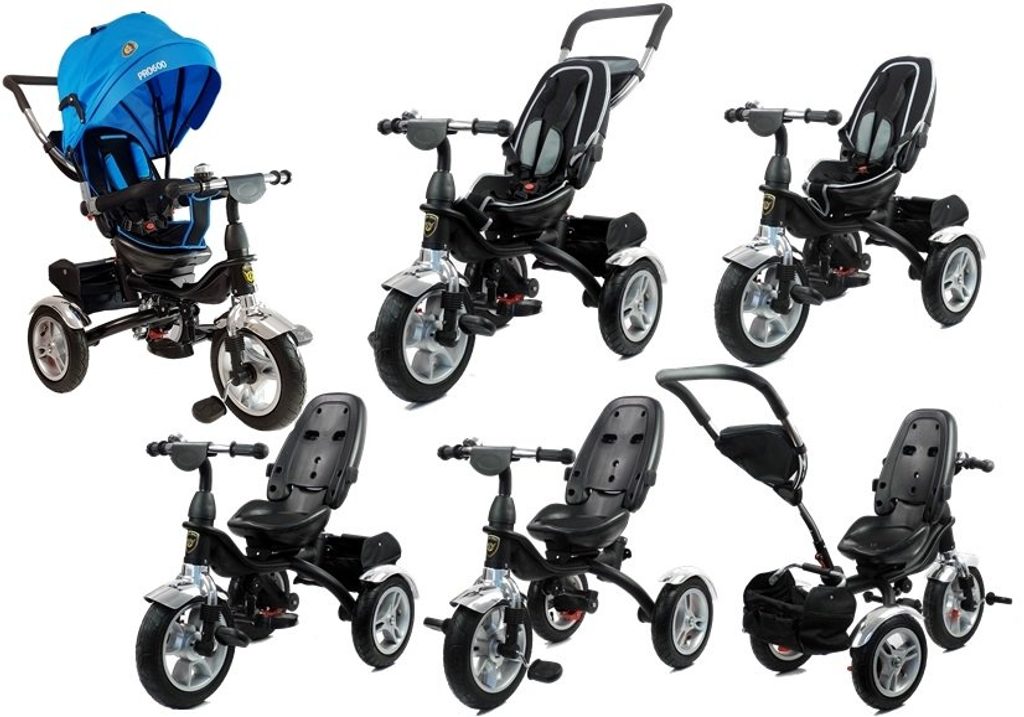 Dětská tříkolka 2v1 PRO600 s nafukovacími koly.  Primárně určena pro děti od 3 do 5 let, ale využití najde i pro menší děti. Vybavena praktickou stříškou proti slunci. V zadní části je umístěn velký koš na hračky, mezi vodící tyčí potom taška na drobnosti. Tříkolka má pevnou ocelovou konstrukci a robustní nafukovací kola. Pro menší děti slouží sklopná stupátka. Čalouněné madlo zabraňuje vypadnutí dítěte z kočárku. Na řídítkách je zvoneček. Pomocí vodící tyče mohou tříkolku řídit i rodiče. Tříkolku můžete zcela odstrojit, demontovat stříšku, vodící tyč, ochrannou bariéru a stupátka. Dítě tak může jezdit zcela samo.