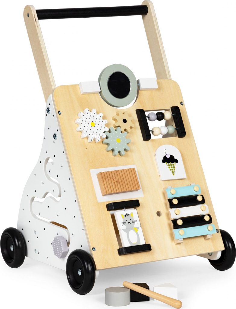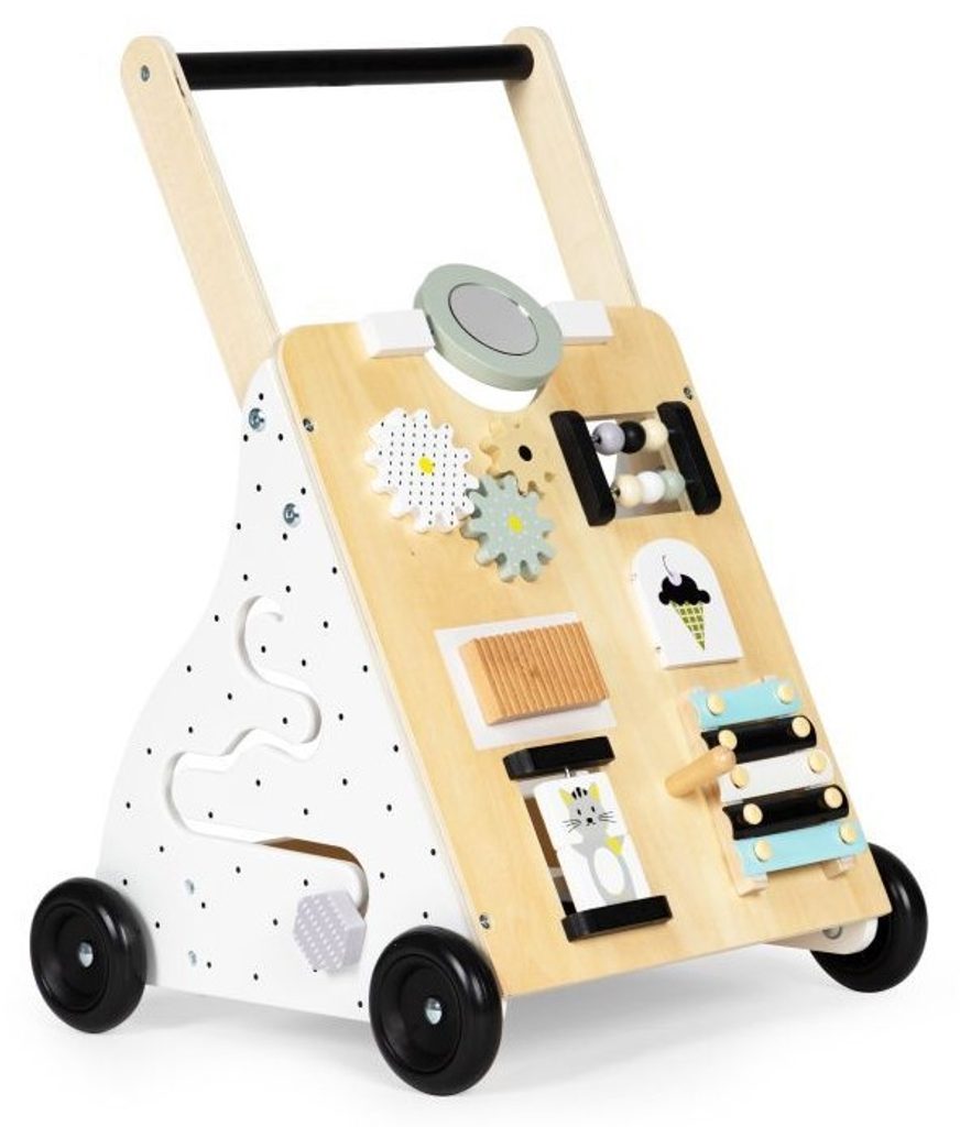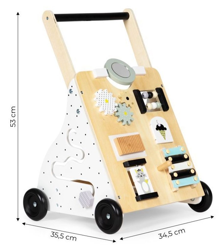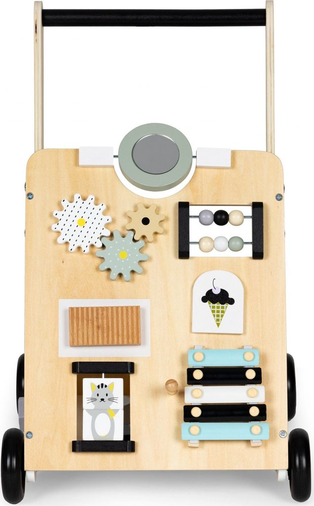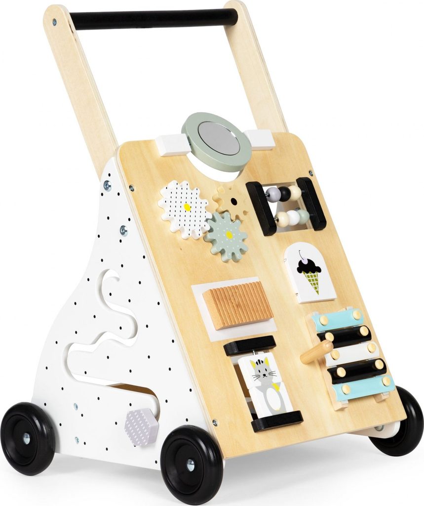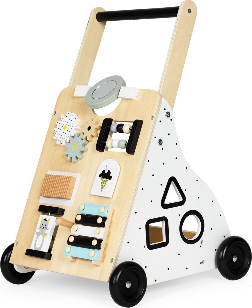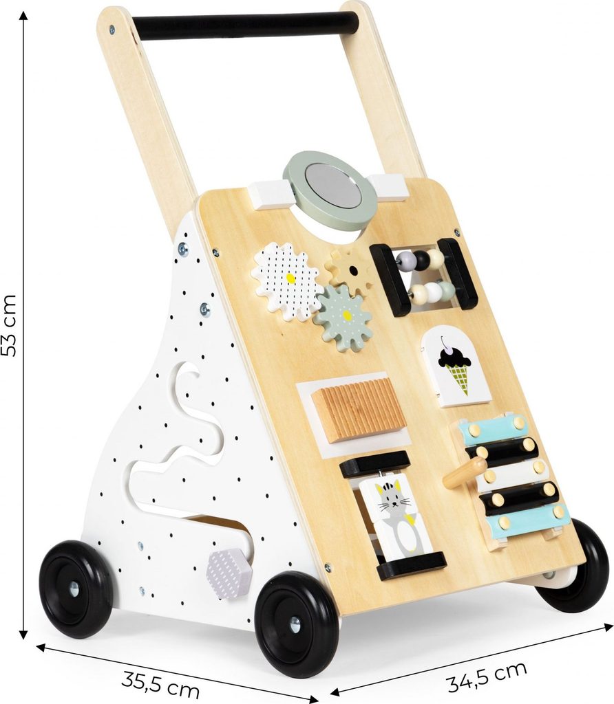 Dětské dřevěné chodítko Ecotoys je ideální hračkou pro děti již od prvních krůčků. Je vyrobeno ze dřeva tak, že nemá žádné ostré hrany a je pro dítě absolutně bezpečné. Obsahuje spoustu zábavných a barevných prvků jako jsou ozubená kolečka, labyrint a další. Slouží také jako úložný prostor pro hračky a dítě je tak může mít vždy po ruce. Kolečka chodítka jsou vyrobeny z protiskluzového materiálu, který nepoškrábe podlahu. Součástí balení jsou barevné kostky, které lze prohazovat otvory na boční straně chodítka.