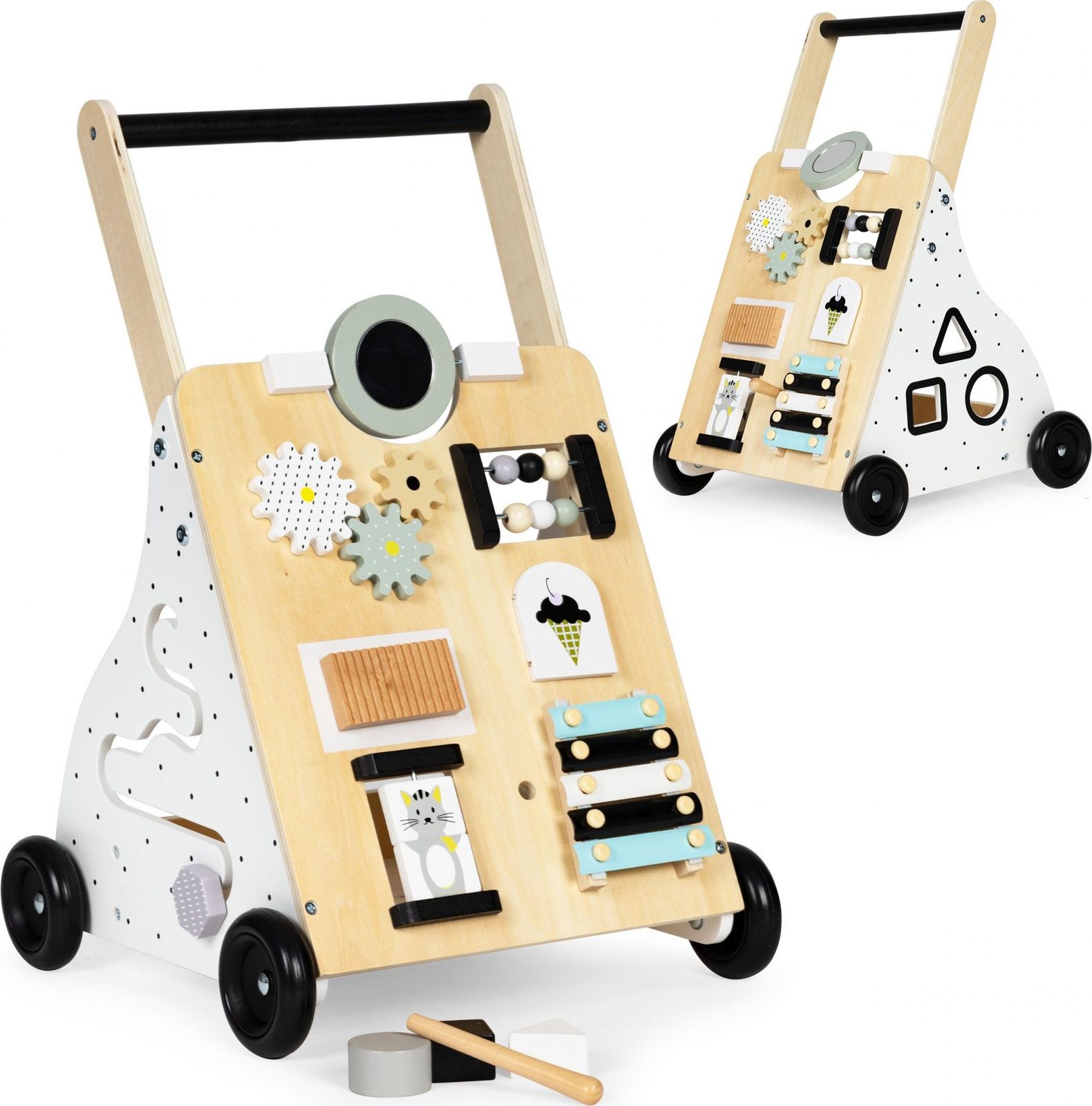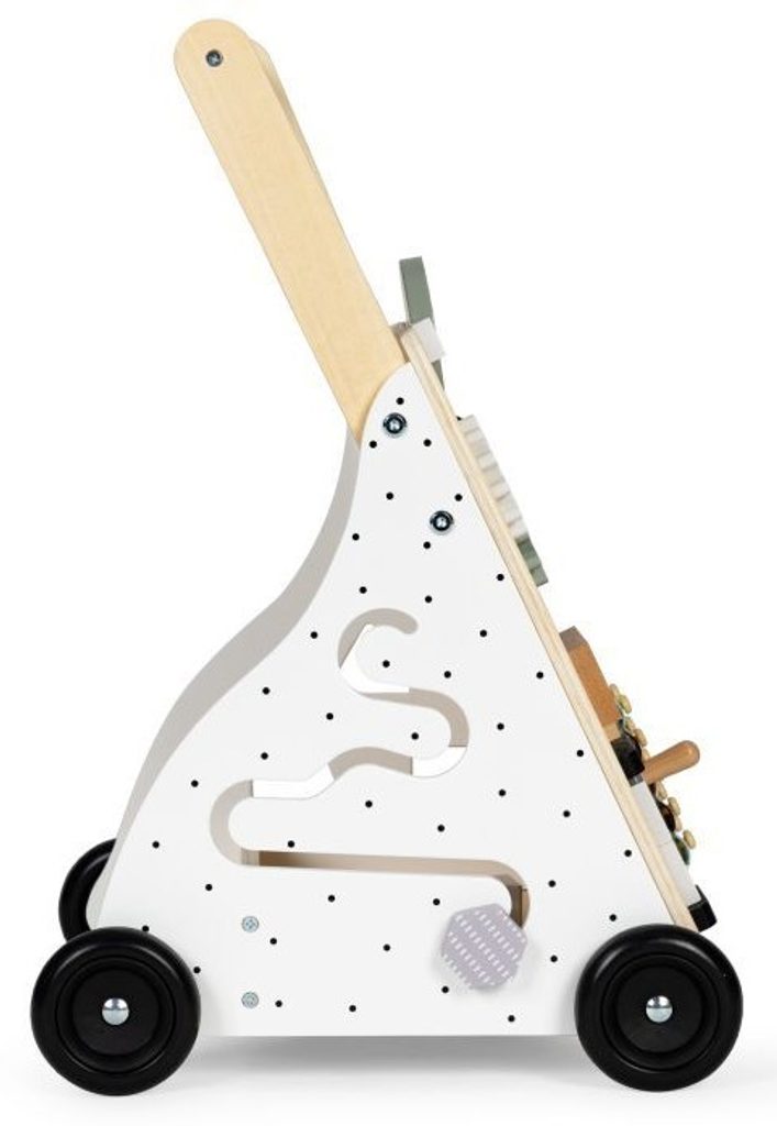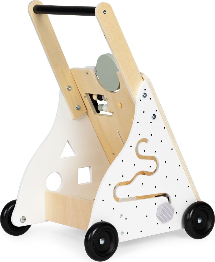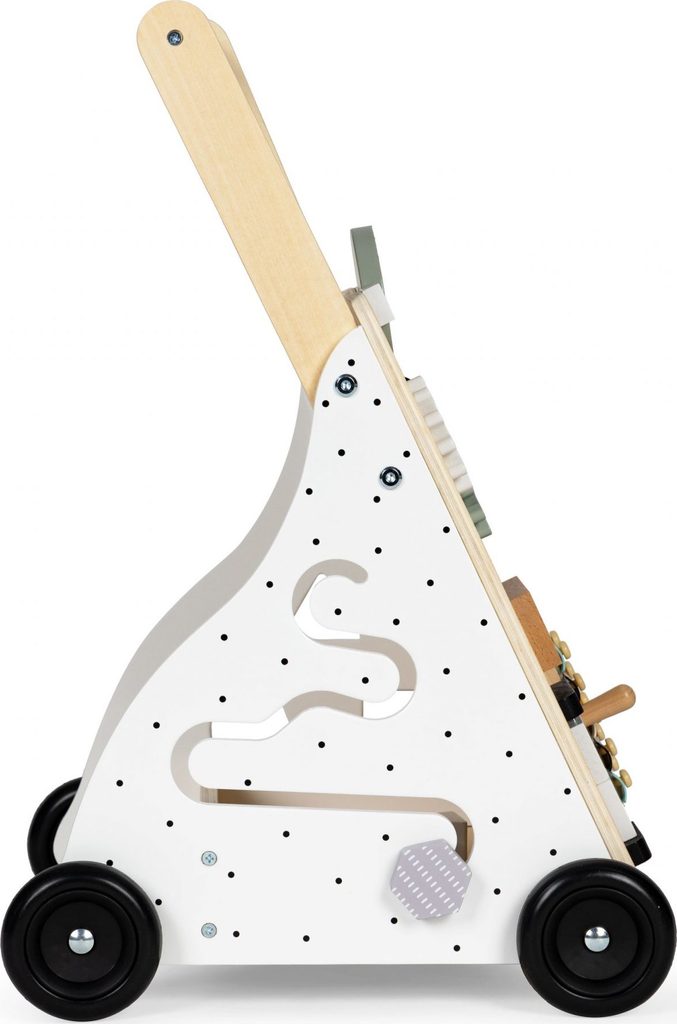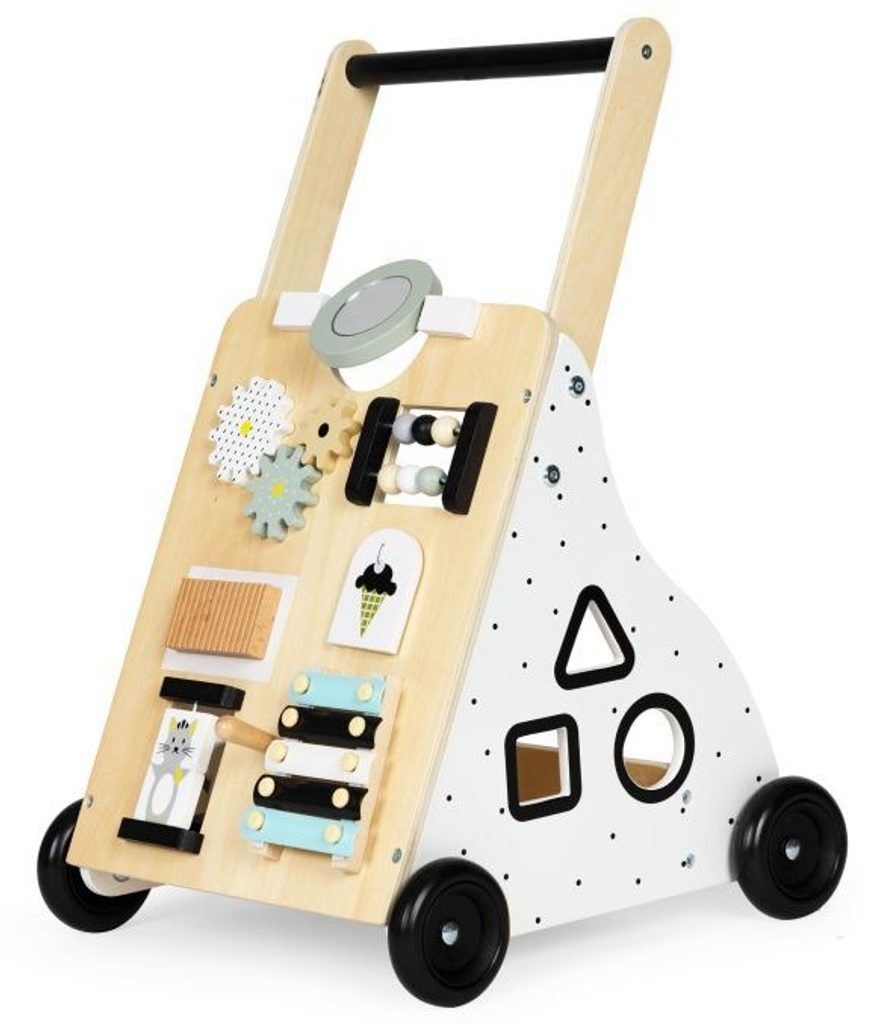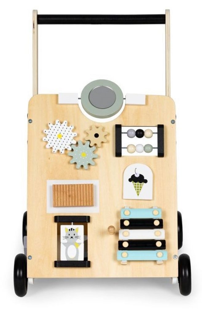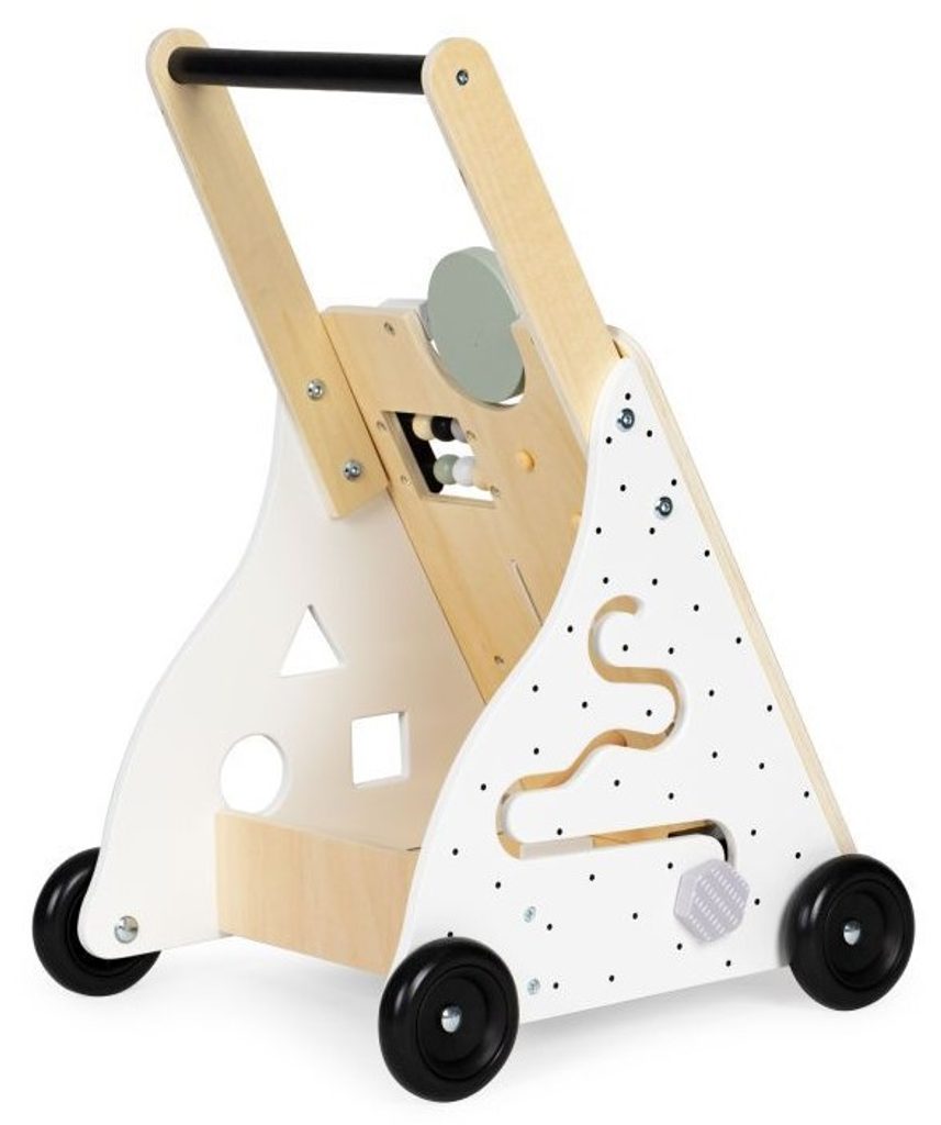 Dětské dřevěné chodítko Ecotoys je ideální hračkou pro děti již od prvních krůčků. Je vyrobeno ze dřeva tak, že nemá žádné ostré hrany a je pro dítě absolutně bezpečné. Obsahuje spoustu zábavných a barevných prvků jako jsou ozubená kolečka, labyrint a další. Slouží také jako úložný prostor pro hračky a dítě je tak může mít vždy po ruce. Kolečka chodítka jsou vyrobeny z protiskluzového materiálu, který nepoškrábe podlahu. Součástí balení jsou barevné kostky, které lze prohazovat otvory na boční straně chodítka.