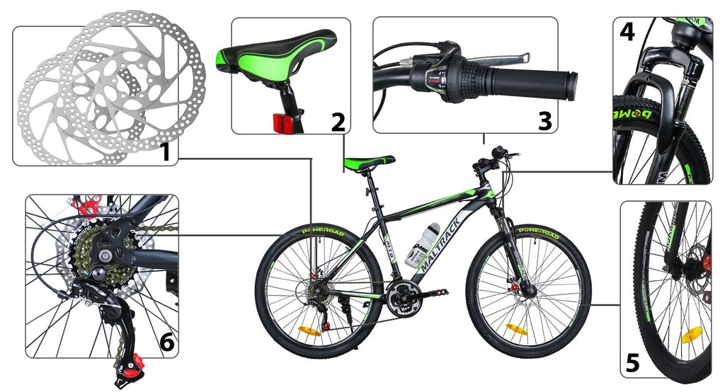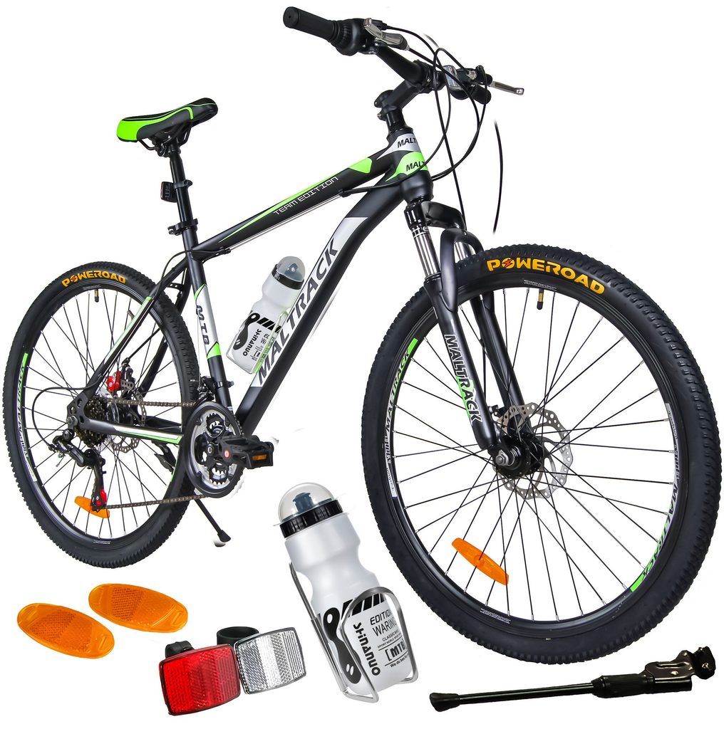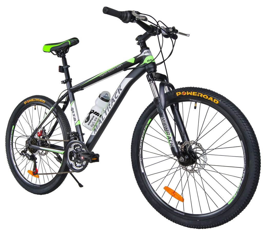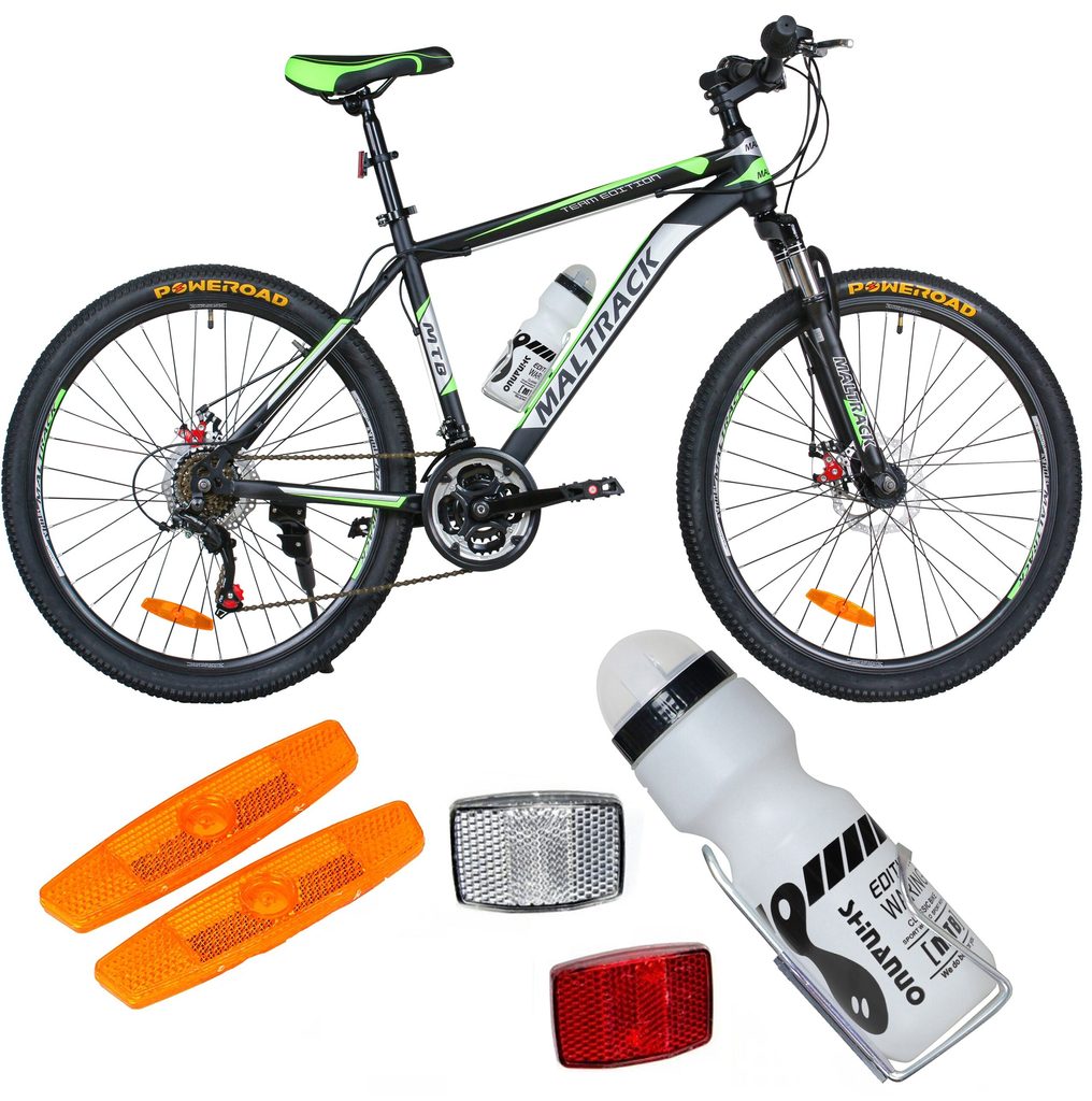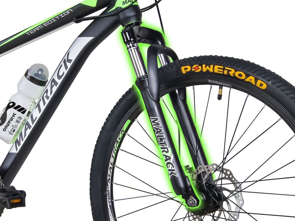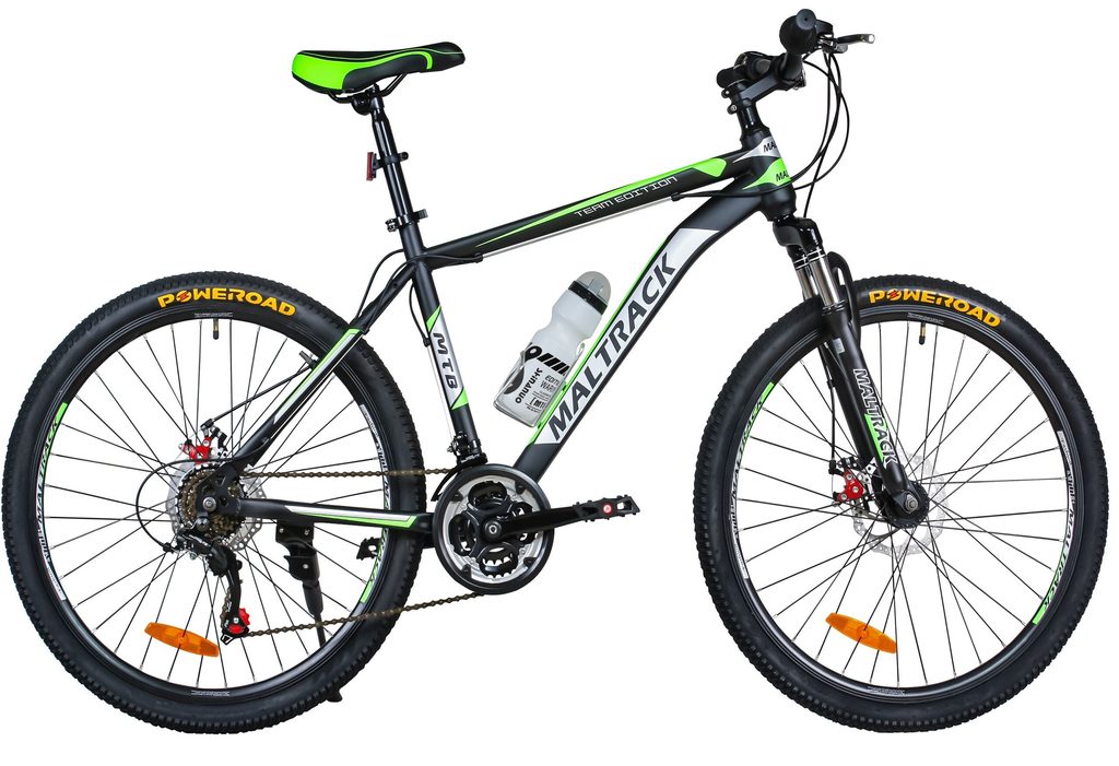 Odpružené dětské kolo MalTrack Team Green s 2 přehazovačkami Shimano Tourney a velikostí ráfků 26 palců je určeno pro děti a juniory s výškou od 140 do 180 cm s nosností do 110 kg. Kolo je zaměřeno na nejmladší a díky snadné obsluze a barevnému modernímu designu je každý okamžik strávený na kole skvělým zážitkem. Kolo je vybaveno přední i zadní kotoučovou brzdou s dodatečným antikorozním nátěrem. Přední vidlice je odpružená. Ve výbavě je také stojan, bezpečnostní odrazky a cyklistická láhev s držákem. Přední a zadní přehazovačka umožňuje celkem 18 převodů. Silniční a zároveň terénní pneumatiky Poweroad jsou usazeny na ráfcích u kterých máte jistotu, že se nevystředí.