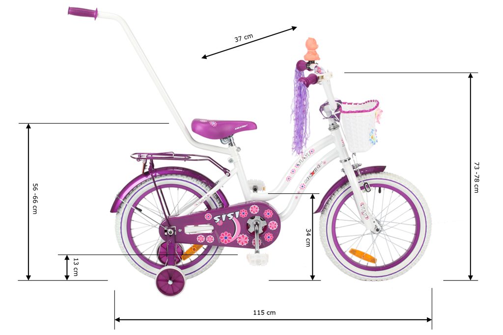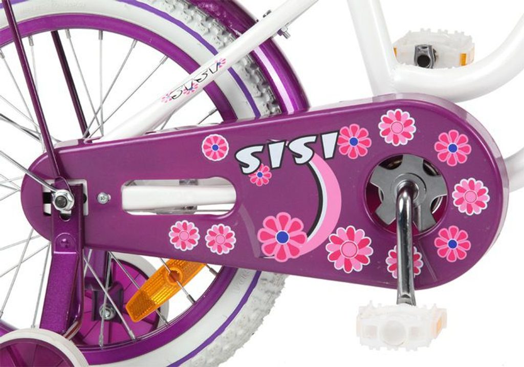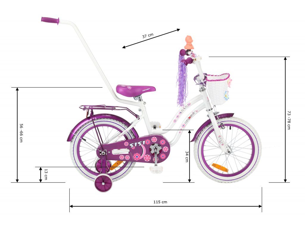 Dětské kolo s velikostí ráfků 16 palců je určeno pro nejmenší děti ve věku od 4 do 6 let s výškou do 120 cm. Kolo je opatřeno vodící tyčí a balančními kolečky, dítě se tedy bude cítit hned od první jízdy bezpečně a stabilně. Kolo je vybaveno 2 druhy brzd. Protisměrná brzda-torpédo u možnuje brzdit zpětným záběrem pedálů nebo lze použít přední pákovou brzdu.Proti nechtěnému namotání nohavice nebo tkaničky do řetězu má toto jízdní kolo kryt, který zakrývá celý řetěz.