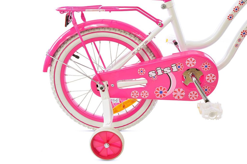 Dětské kolo s velikostí ráfků 16 palců je určeno pro nejmenší děti ve věku od 4 do 6 let s výškou do 120 cm. Kolo je opatřeno vodící tyčí a balančními kolečky, dítě se tedy bude cítit hned od první jízdy bezpečně a stabilně. Kolo je vybaveno 2 druhy brzd. Protisměrná brzda-torpédo u možnuje brzdit zpětným záběrem pedálů nebo lze použít přední pákovou brzdu.Proti nechtěnému namotání nohavice nebo tkaničky do řetězu má toto jízdní kolo kryt, který zakrývá celý řetěz.
