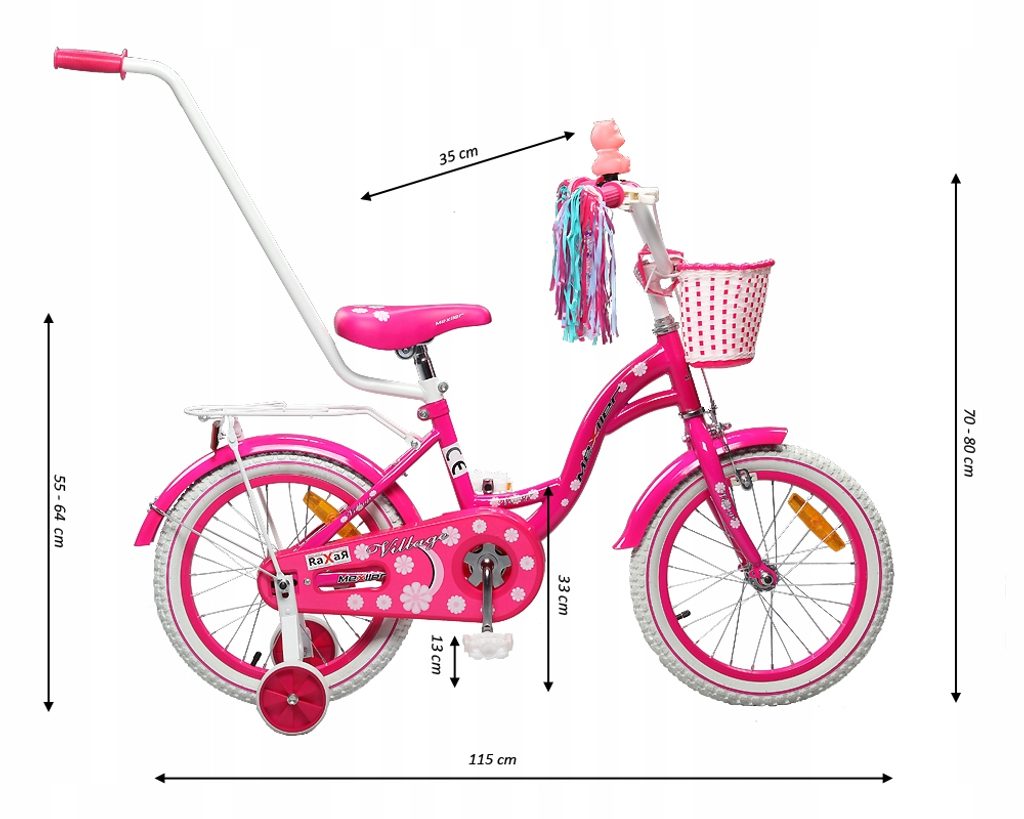 Dětské kolo s velikostí ráfků 16 palců je určeno pro nejmenší děti ve věku od 4 do 6 let s výškou do 120 cm. Kolo je opatřeno vodící tyčí a balančními kolečky, dítě se tedy bude cítit hned od první jízdy bezpečně a stabilně. Kolo je vybaveno 2 druhy brzd. Protisměrná brzda-torpédo u možnuje brzdit zpětným záběrem pedálů nebo lze použít přední pákovou brzdu.Proti nechtěnému namotání nohavice nebo tkaničky do řetězu má toto jízdní kolo kryt, který zakrývá celý řetěz.