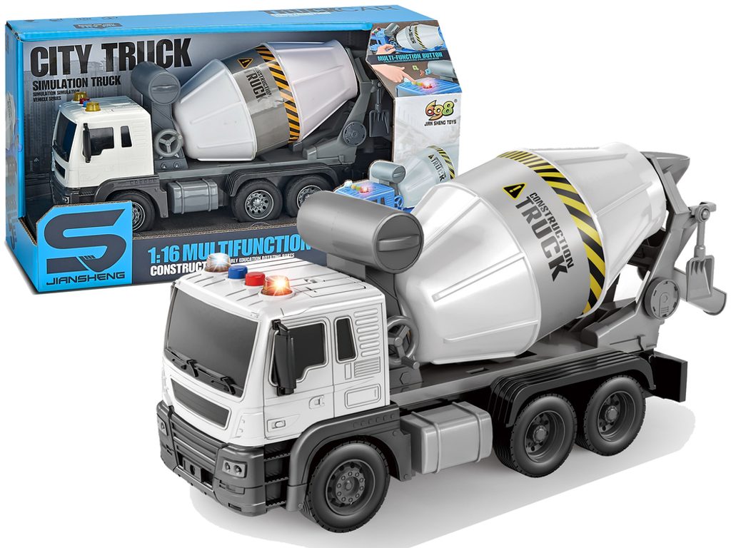 Dětské auto - míchačka na beton City Truck je ideální hračkou pro rozvoj manuální zručnosti a logického myšlení. Je vybaveno otočným bubnem, který se otáčí pomocí bočního kolečka, v zadní části má násypku a žlab na vypouštění "betonu". Na střeše kabiny jsou umístěny světýlka a autíčko je vybaveno také zvuky jízdy a klaksonu. Hračka je určena pro děti od 36 měsíců věku.