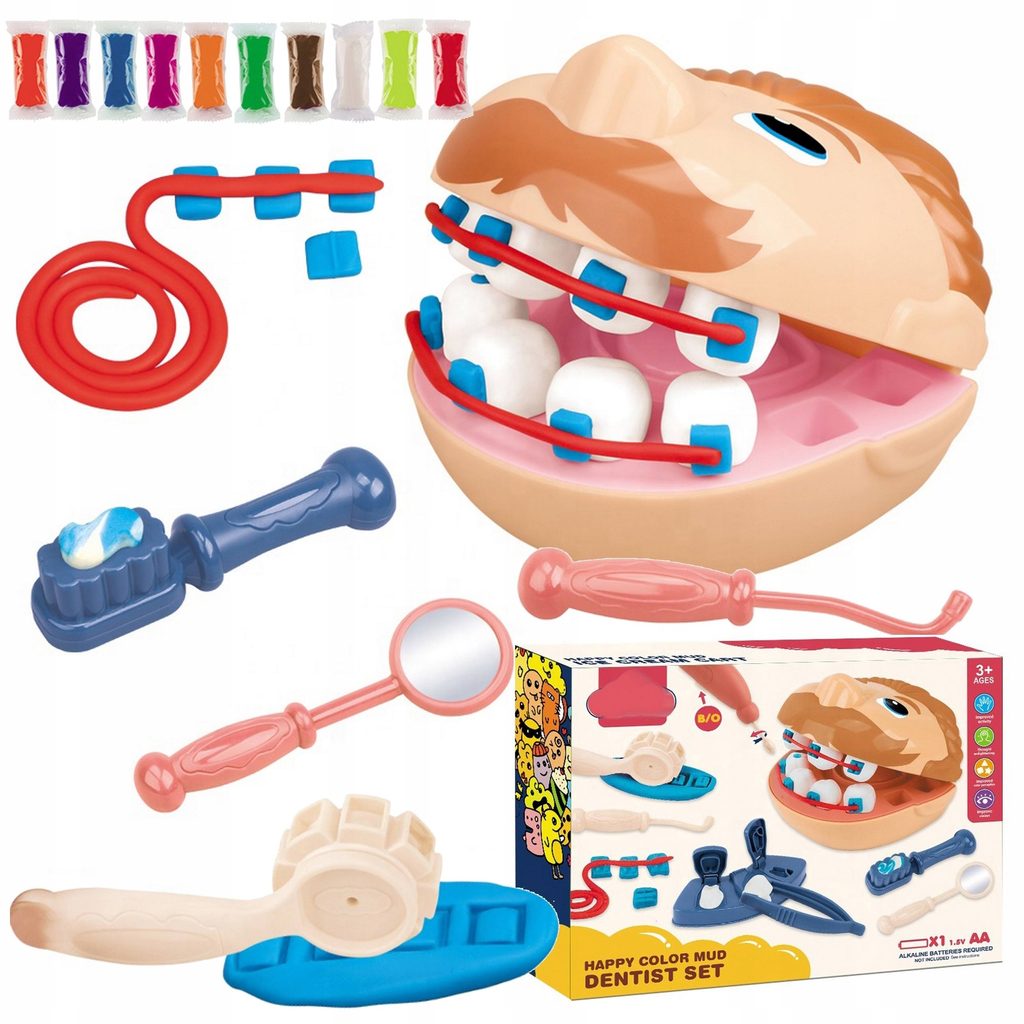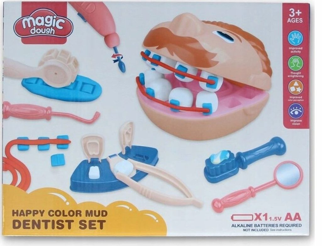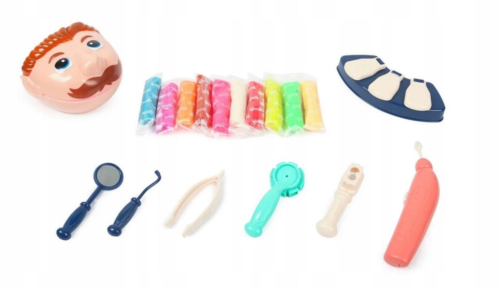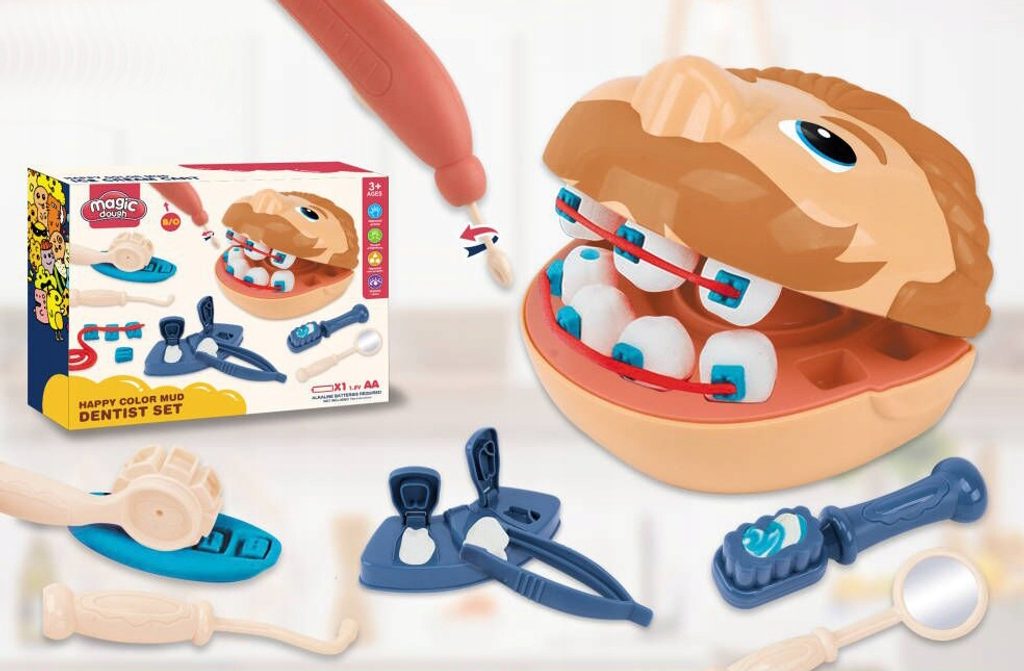 Dětská modelovací plastelína Dětský zubař je ideální hračkou pro všechny děti ale i dospělé. V sadě najdete kromě plastelíny v několika odstínech také hlavu, fromu na vytváření zoubků, dláto, zrcátko, šteteček, rovnátka a vrtačku na baterii. Plastelína s příslušenstvím poskytne Vašemu dítěti prakticky neomezené možnosti stát se skutečným zubařem. Výrazně rozvíjí manuální dovednosti. Hraní s plastelínou a různými vychytávkami bude skvělou podporou pro správný vývoj Vašeho dítěte. Hračka je určena pro děti od 3 let věku.