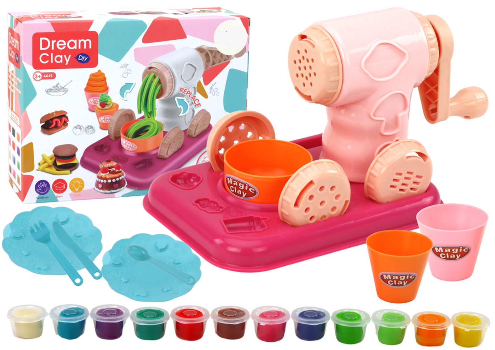 Dětská modelovací plastelína Dream Clay je ideální hračkou pro všechny děti ale i dospělé. V sadě je celkem 12 kelímků s plastelínou v různých barvách. Součástí sady je vytlačovací strojek se 4 nástavci a spousta dalšího příslušenství: talířky, příbory, kelímky a zabudované formičky. Plastelína s příslušenstvím poskytne Vašemu dítěti prakticky neomezené možnosti pro navrhování, stavění a skládání různých plastelínových předmětů. Výrazně rozvíjí manuální dovednosti. Hraní s plastelínou a různými vychytávkami bude skvělou podporou pro správný vývoj Vašeho dítěte. Hračka je určena pro děti od 3 let věku.