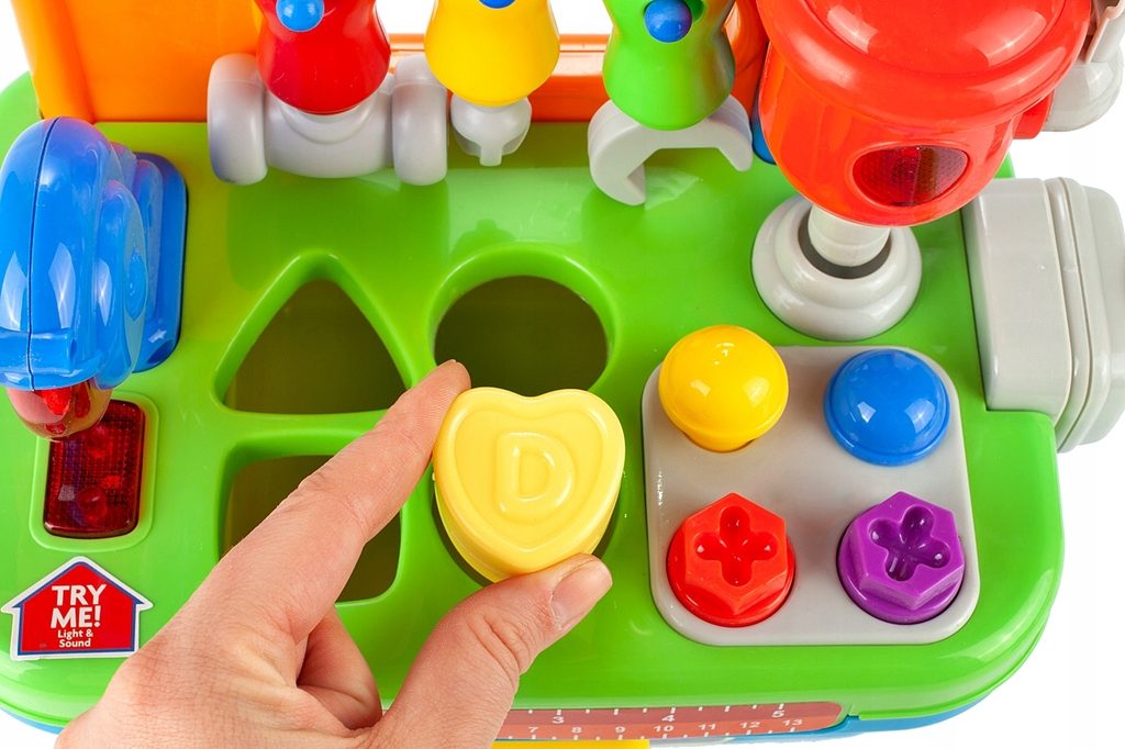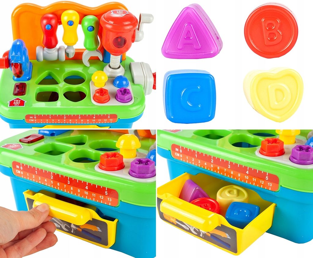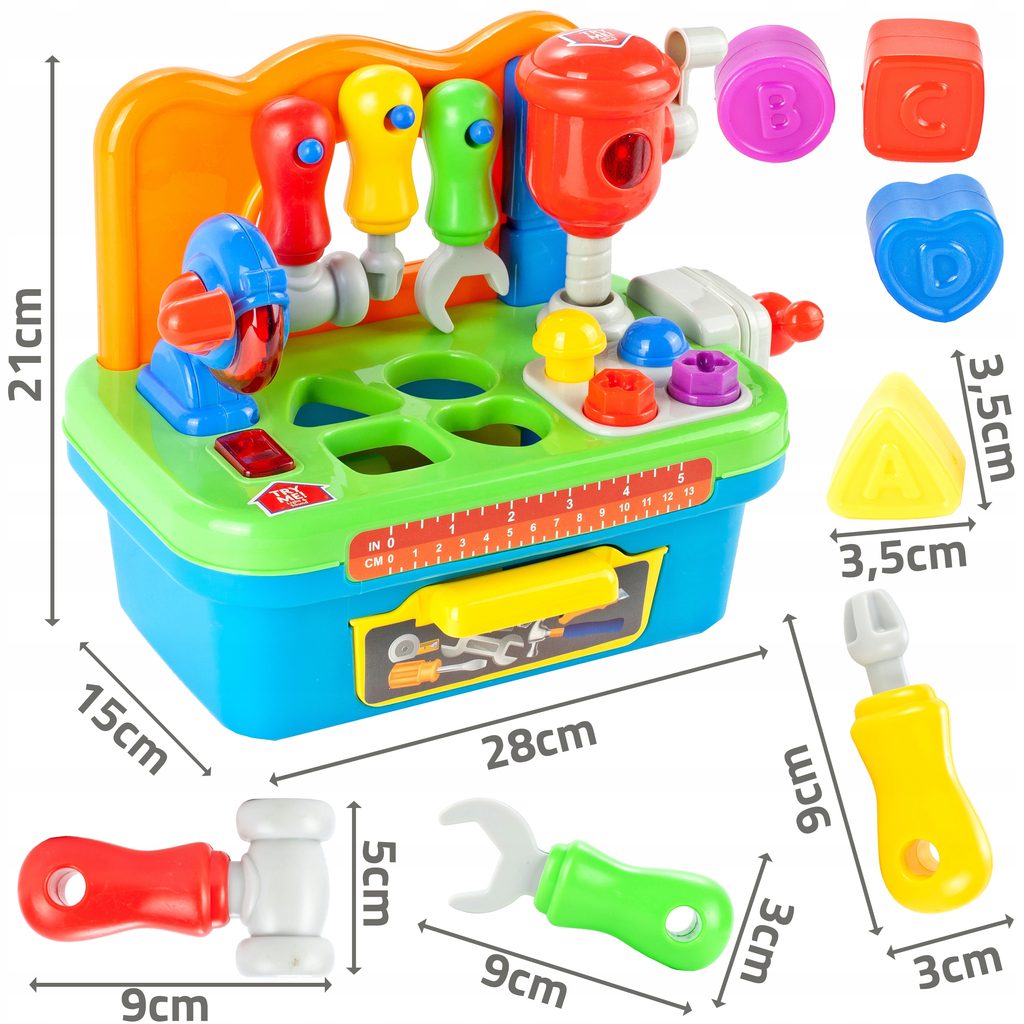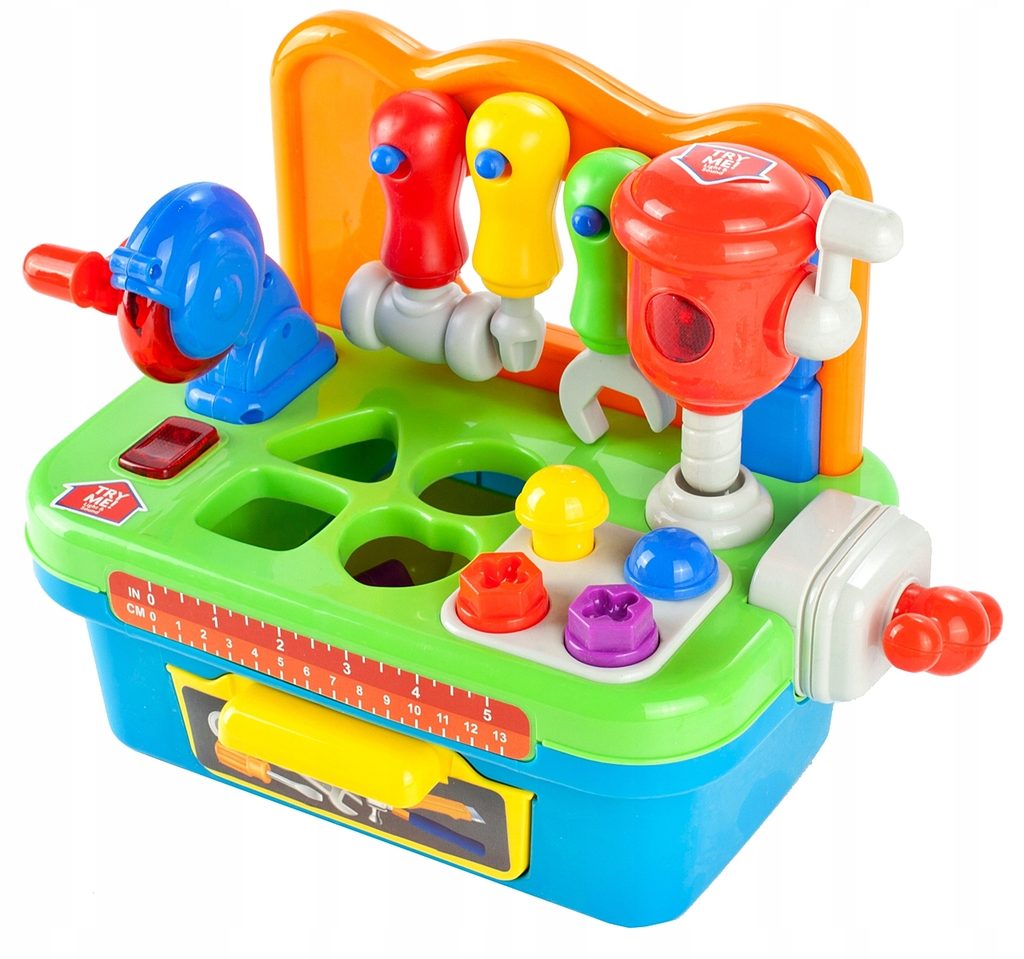 Dětský multifunkční stoleček - ponk Tool Master je ideální hračkou pro ty nejmenší děti. Dítě si na něm může "opravovat" své oblíbené hračky. Ve výbavě najděte otočnou pilu a vrtačku se světlem a zvukem, svěrák, výsuvnou přihrádku a další nářadí. Dále je stoleček vybavený prohazovacími otvory kterými lze vhazovat přiložené barevné kostky. Stoleček je ideální hračkou pro cvičení manuálních dovedností, počítání, rozpoznávání barev a tvarů. Hračka je určena pro děti od 24 měsíců věku.