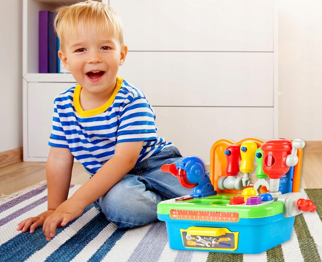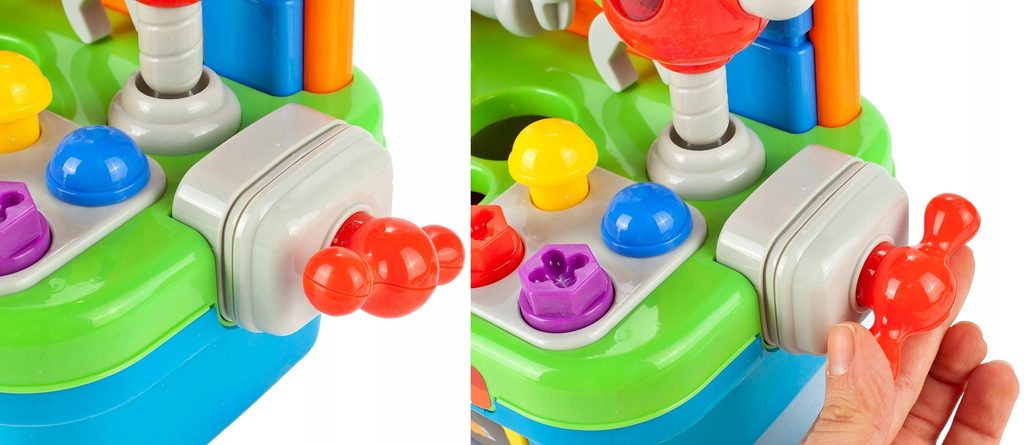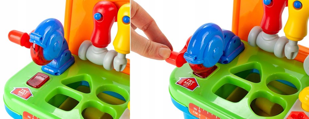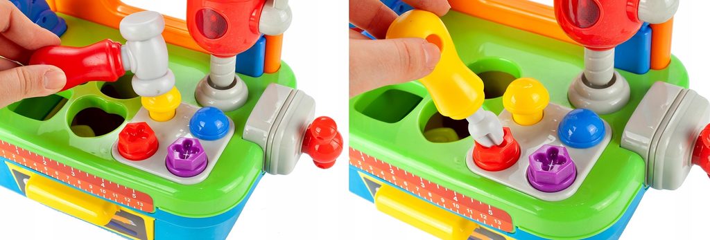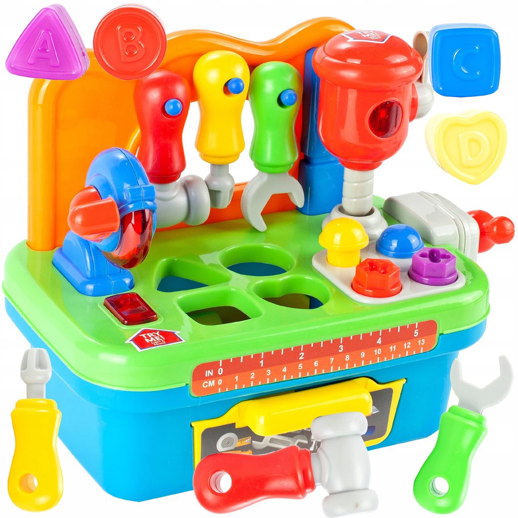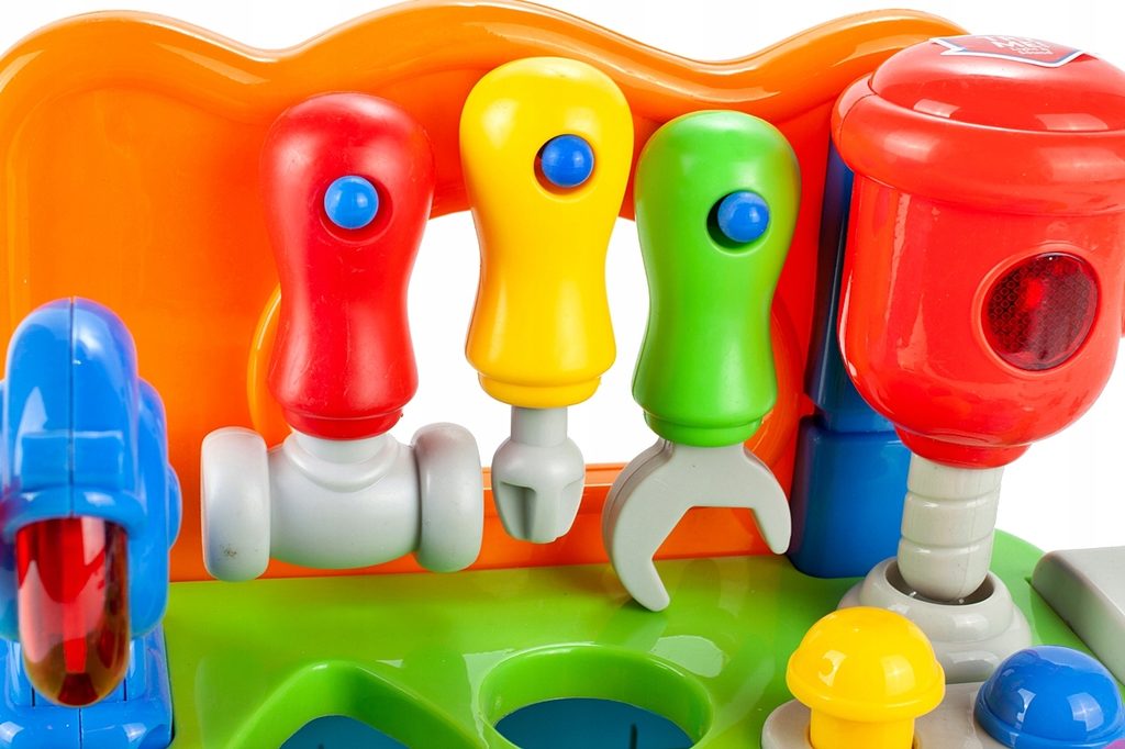 Dětský multifunkční stoleček - ponk Tool Master je ideální hračkou pro ty nejmenší děti. Dítě si na něm může "opravovat" své oblíbené hračky. Ve výbavě najděte otočnou pilu a vrtačku se světlem a zvukem, svěrák, výsuvnou přihrádku a další nářadí. Dále je stoleček vybavený prohazovacími otvory kterými lze vhazovat přiložené barevné kostky. Stoleček je ideální hračkou pro cvičení manuálních dovedností, počítání, rozpoznávání barev a tvarů. Hračka je určena pro děti od 24 měsíců věku.