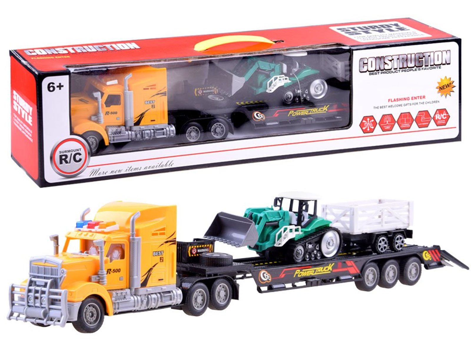 Auto s dálkovým ovládáním 27MGz v provedení tahače s návěsem R500 Truck umožnuje jízdu dopředu a dozadu, zatáčí doprava a doleva. Je vybaveno světelnými efekty umístěnými na střeše kabiny autíčka. Součástí balení je dálkový ovladač se 2 páčkami pro změnu směru jízdy a jízdu vpřed a vzad a také traktor s vlečkou. Ten se ovládá tlačením, není poháněn bateriemi. Ovladač i autíčko jsou napájeny bateriemi, které nejsou součástí balení. Autíčko je vyrobeno z plastu a má certifikaci CE.