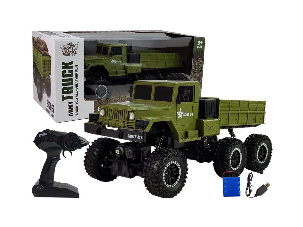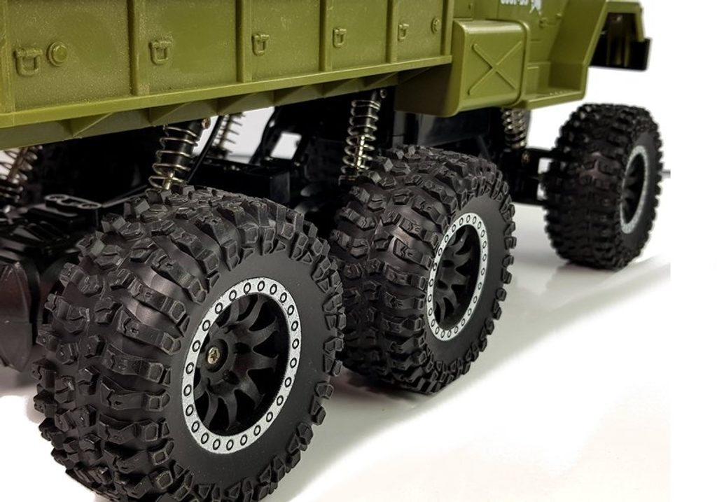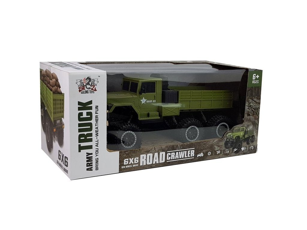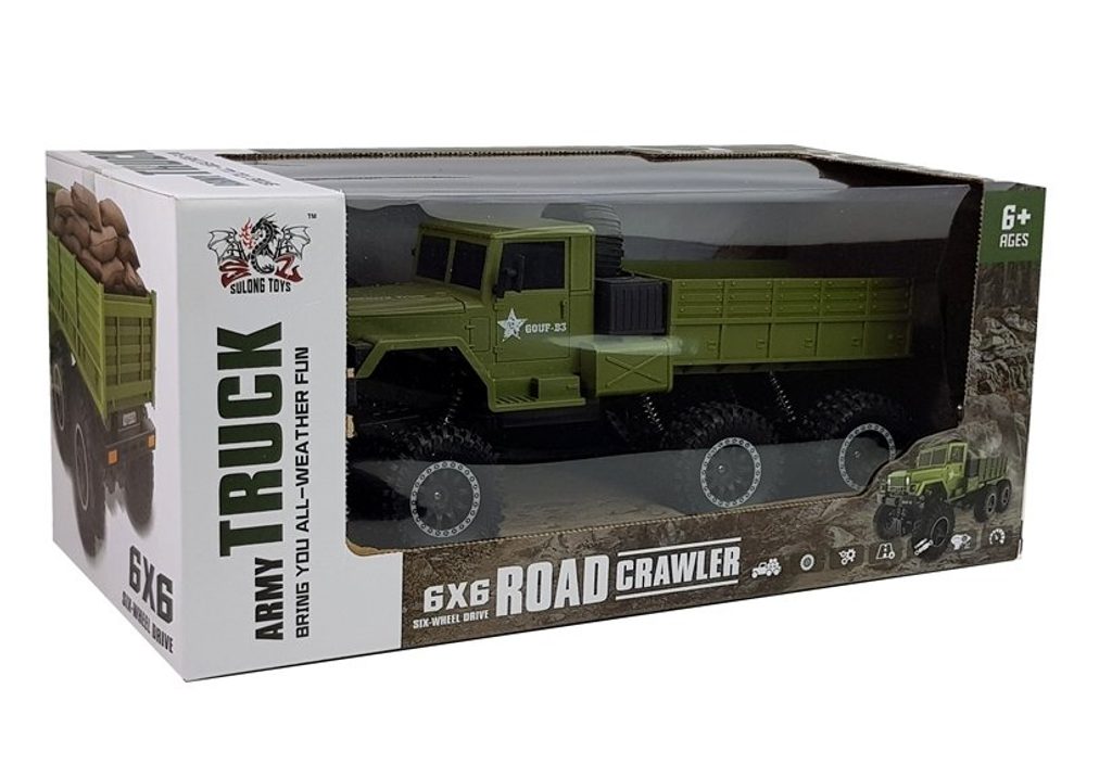 Vojenské nákladní auto Army Truck na dálkové ovládání s dálkovým ovladáním 2,4G umožnuje jízdu dopředu a dozadu, zatáčí doprava a doleva. Je osazeno gumovými koly s velmi dobrou přilnavostí a je vybaveno silnými tlumiči nárazů. Součástí balení je akumulátor, USB nabíječka a dálkový ovladač. Dálkové ovládání je napájeno bateriemi, které nejsou součástí balení. Autíčko je vyrobeno z odolného plastu a má certifikaci CE.