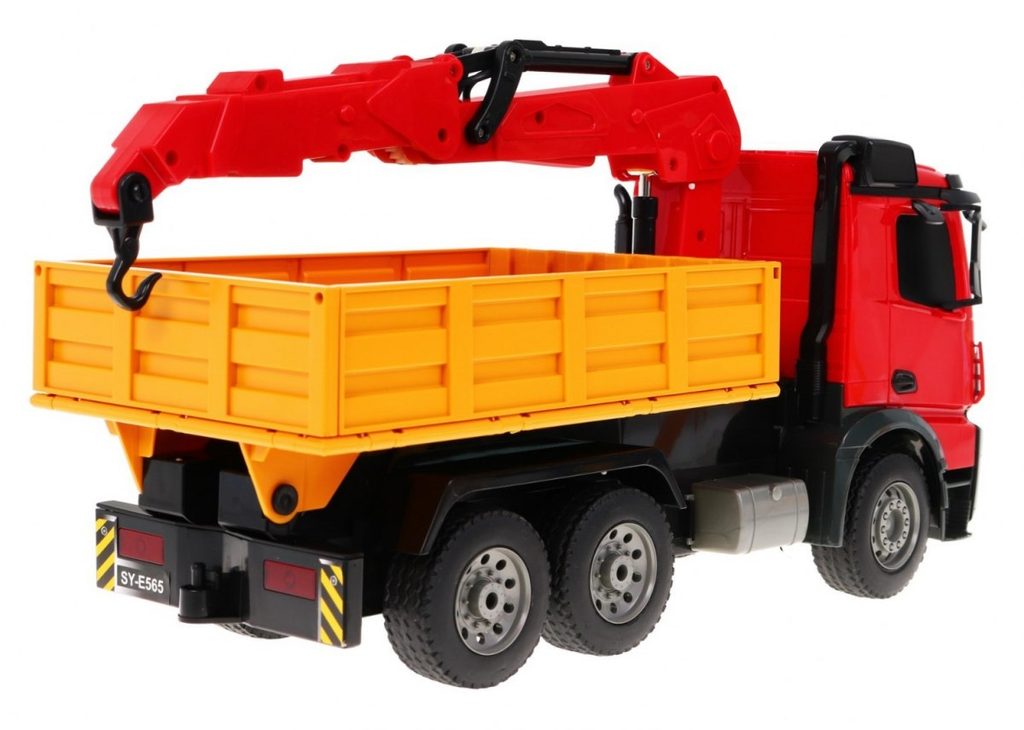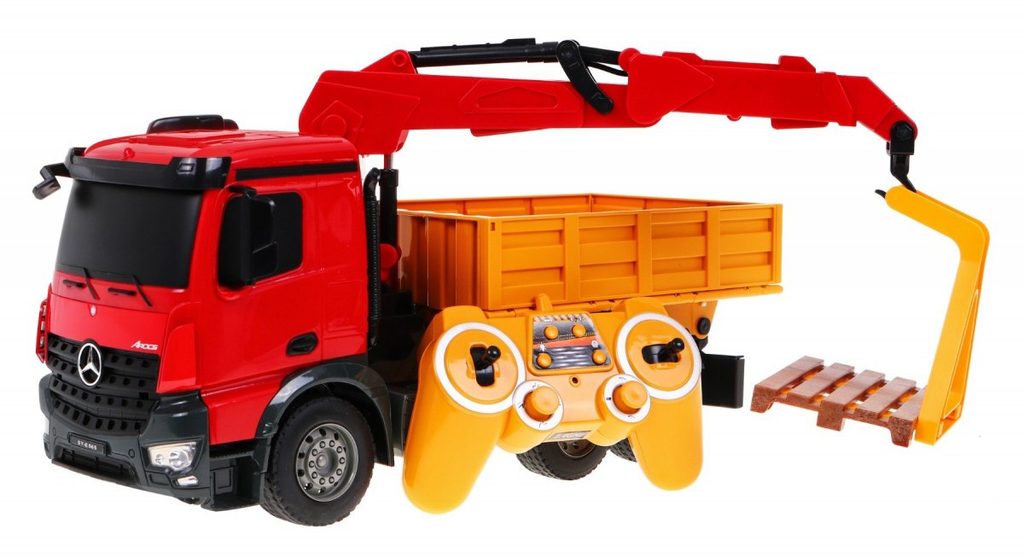 Nákladní auto na dálkové ovládání Mercedes-Benz Arocs s dálkovým ovládáním 2,4G umožnuje jízdu dopředu a dozadu, má otáčecí kola doprava a doleva, pohyblivé a otáčecí rameno jeřábu. Ve výbavě jsou také přední a zadní světla, zvukové efekty, tlumiče nárazů a sklopné bočnice korby. Ovládání je velmi jednoduché pomocí ovladače se 2 joysticky a 6 tlačítky. Součástí balení je akumulátor a USB nabíječka, nástavec na rameno jeřábu a imitace palety. Dálkové ovládání je napájeno bateriemi, které nejsou součástí balení. Auto je vyrobeno z plastu a má certifikaci CE.