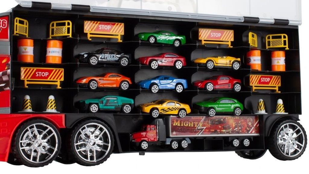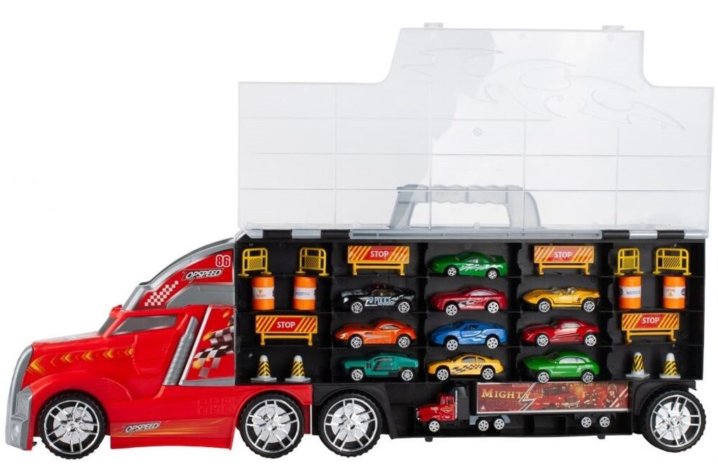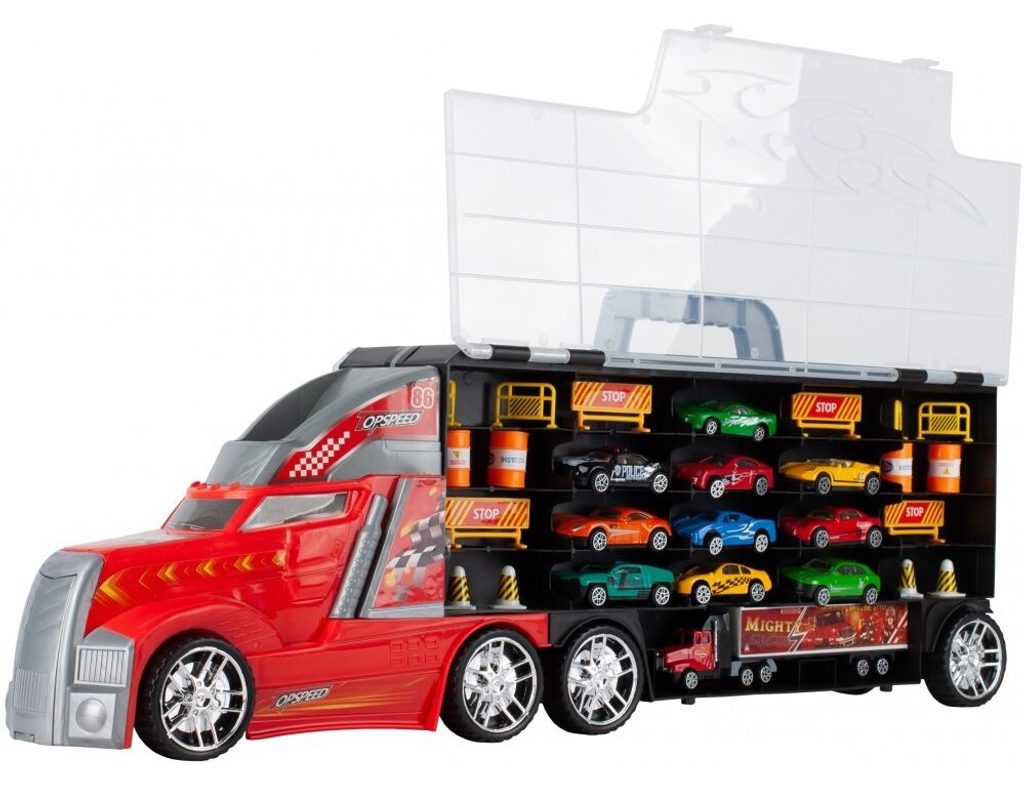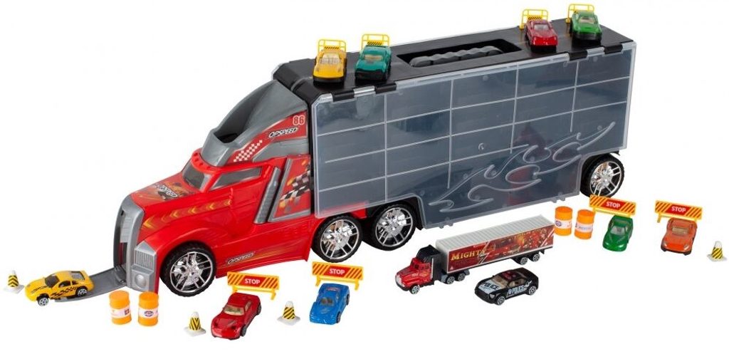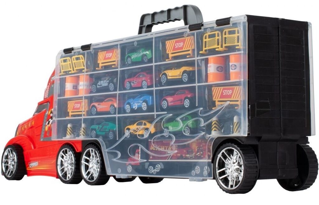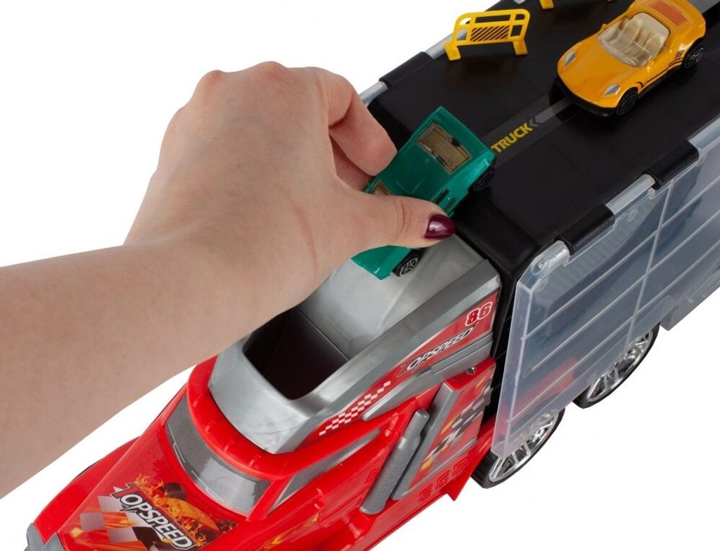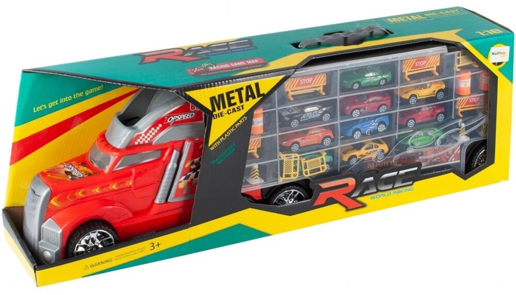 Velké nákladní autíčko Race Truck s autíčky, hrací podložkou a přední skluzavkou. Ta je umístěna na střeše auta a končí v přední části. Součástí auta je 10 různých kovových, kamion a celkem 16 kusů dalšího příslušenství. Obě boční strany auta jsou otevírací a jsou rozděleny na přihrádky. V horní části je praktický úchyt pro snadné přenášení. Hračka je určena pro děti od 36 měsíců věku.