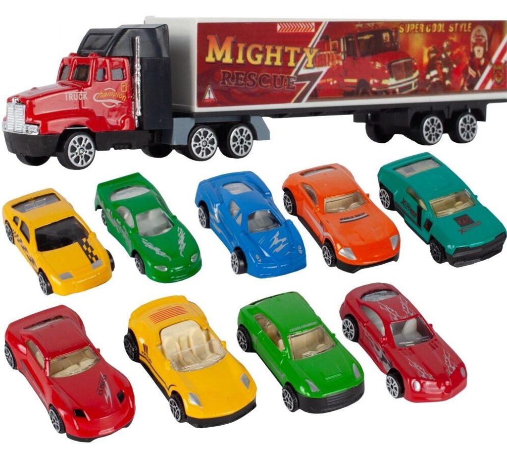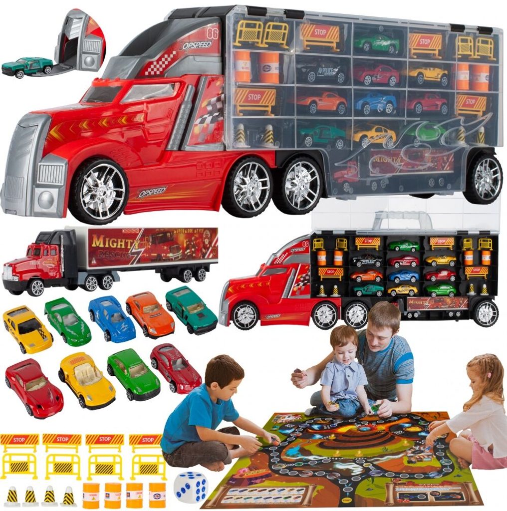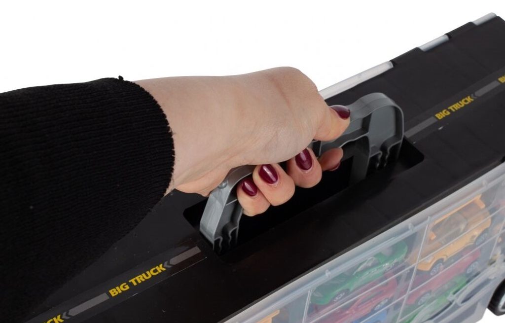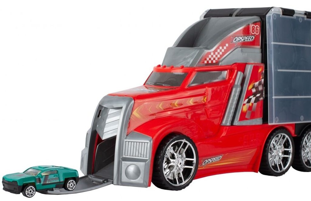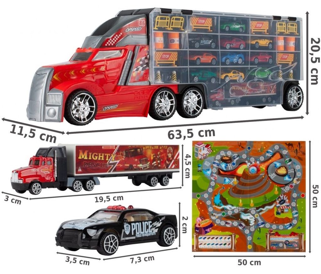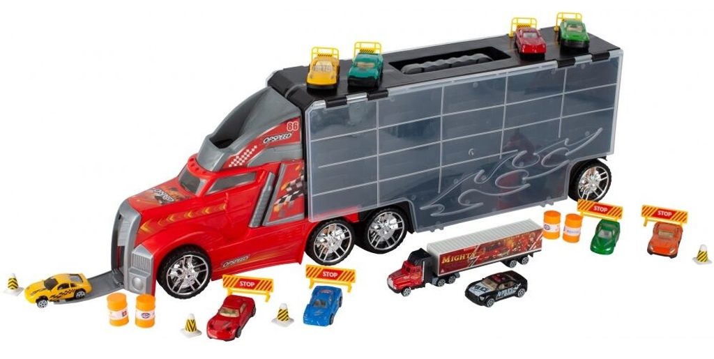 Velké nákladní autíčko Race Truck s autíčky, hrací podložkou a přední skluzavkou. Ta je umístěna na střeše auta a končí v přední části. Součástí auta je 10 různých kovových, kamion a celkem 16 kusů dalšího příslušenství. Obě boční strany auta jsou otevírací a jsou rozděleny na přihrádky. V horní části je praktický úchyt pro snadné přenášení. Hračka je určena pro děti od 36 měsíců věku.