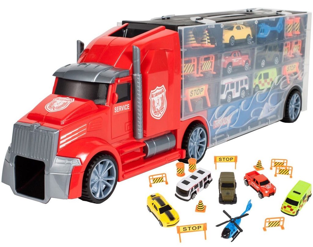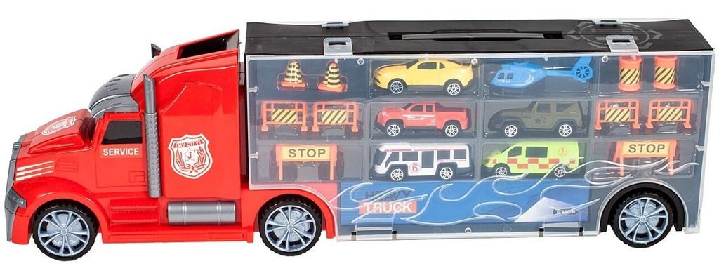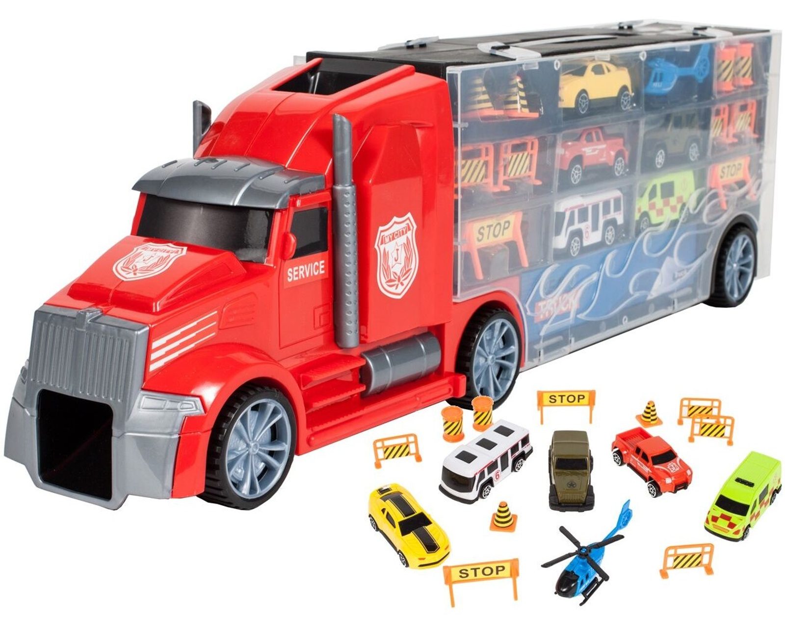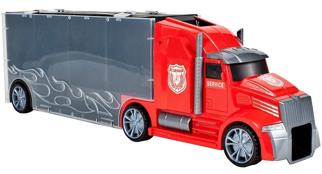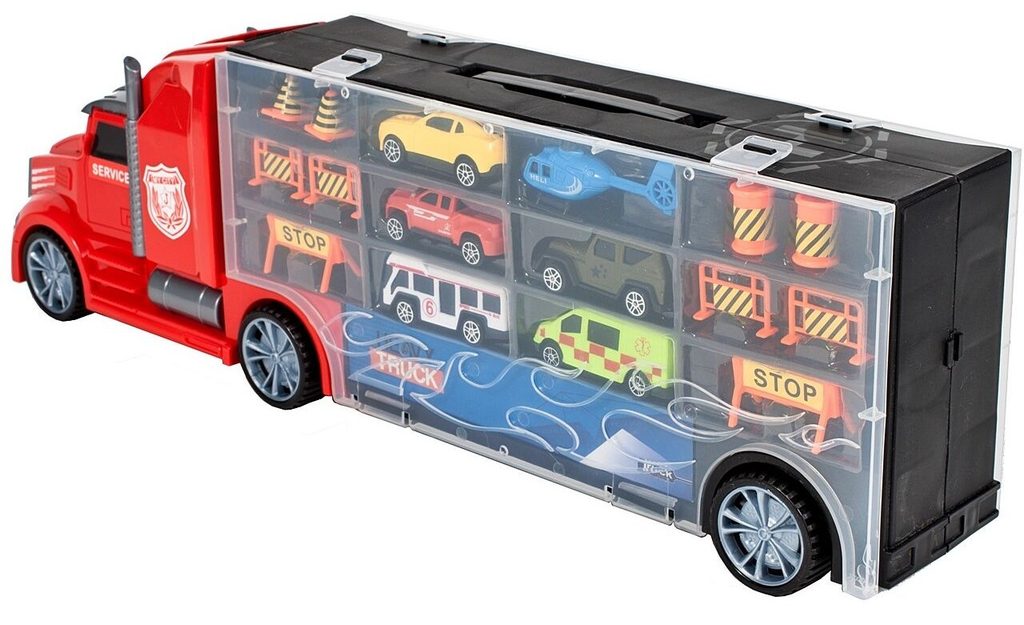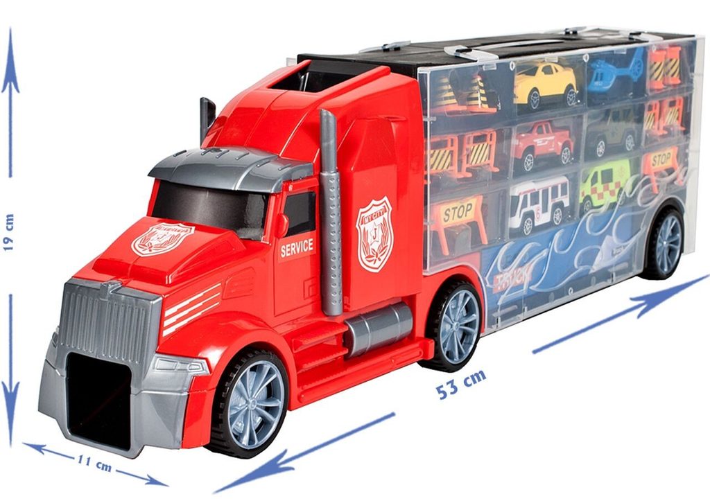 Velké nákladní autíčko Red Truck s autíčky a skluzavkou. Ta je umístěna na střeše auta a končí v přední části. Součástí auta je 5 různých autíček, vrtulník a další příslušenství jako jsou kužely a silniční zábrany. Obě boční strany auta jsou otevírací a jsou rozděleny na 12 menších a 4 velké přihrádky. V horní části je praktický úchyt pro snadné přenášení. Hračka je určena pro děti od 36 měsíců věku.
