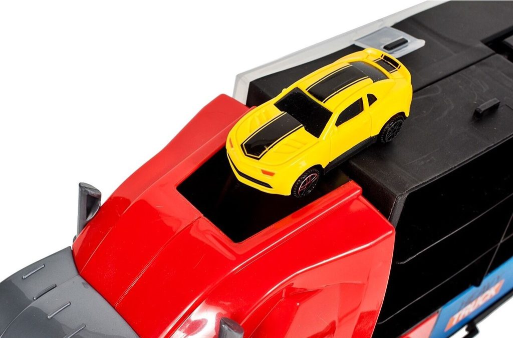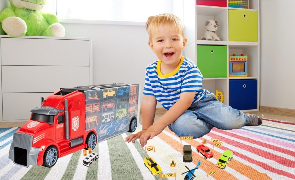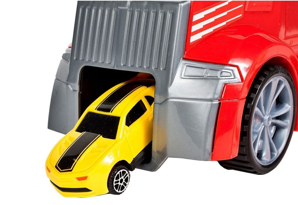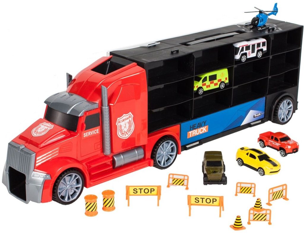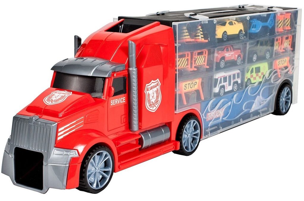 Velké nákladní autíčko Red Truck s autíčky a skluzavkou. Ta je umístěna na střeše auta a končí v přední části. Součástí auta je 5 různých autíček, vrtulník a další příslušenství jako jsou kužely a silniční zábrany. Obě boční strany auta jsou otevírací a jsou rozděleny na 12 menších a 4 velké přihrádky. V horní části je praktický úchyt pro snadné přenášení. Hračka je určena pro děti od 36 měsíců věku.