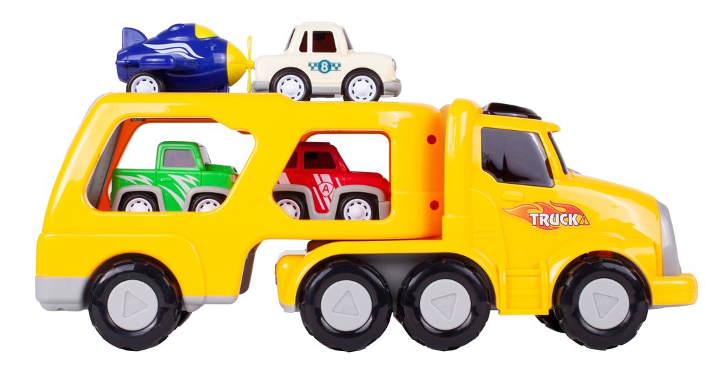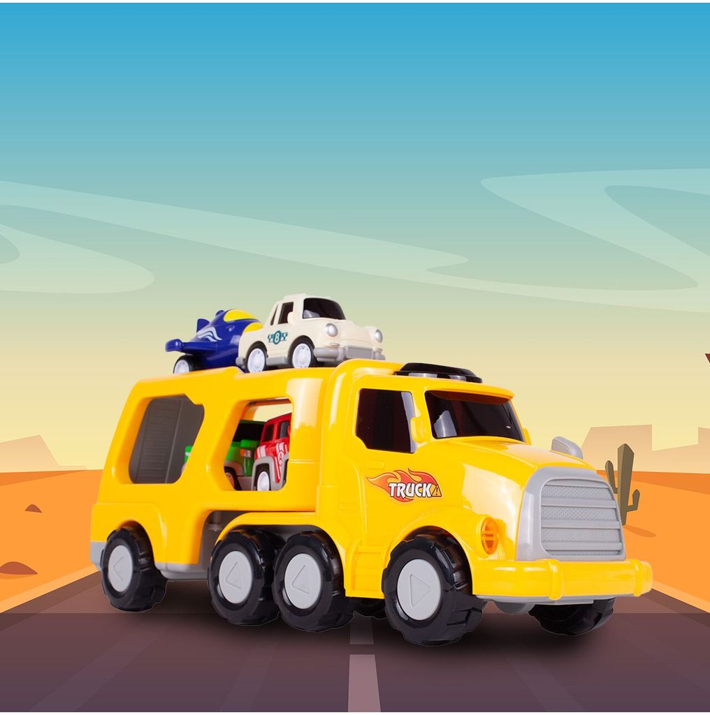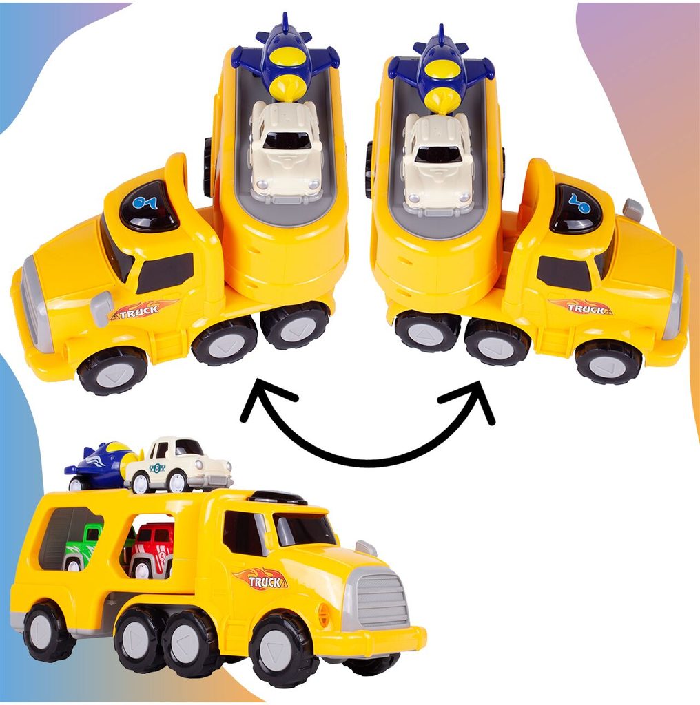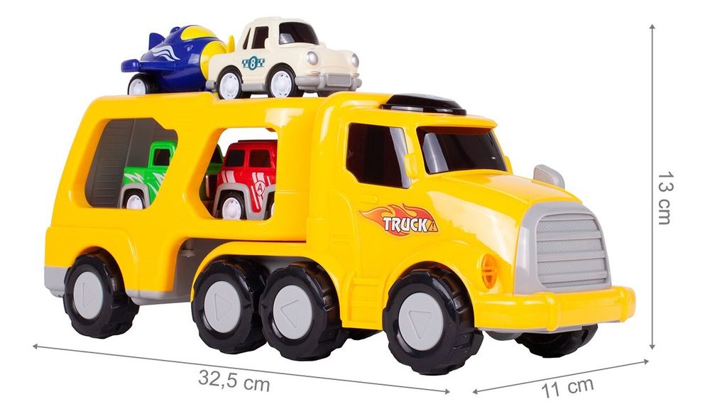Nákladní auto na setrvačník Transport Car je ideální hračkou pro rozvoj manuální zručnosti a logického myšlení. Součástí sady jsou 3 autíčka a helikoptéra. Auto je vybaveno tlačítkem, které spouští melodie a žluté přední světla. Malé autíčka mají natahovací mechanismus. Pohon velkého auta s otáčecím návěsem zajišťuje setrvačník. Zadní plošina je sklopná. Hračka je určena pro děti od 36 měsíců věku.