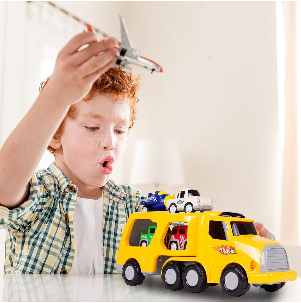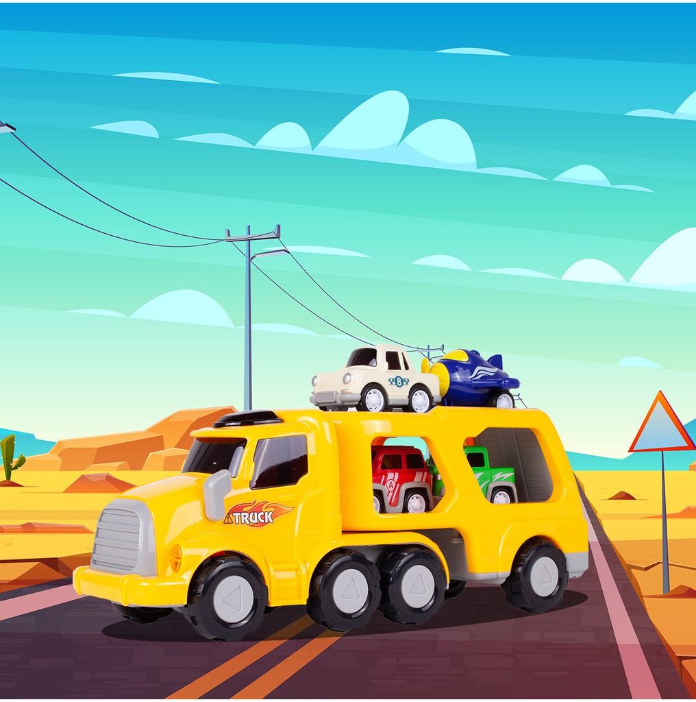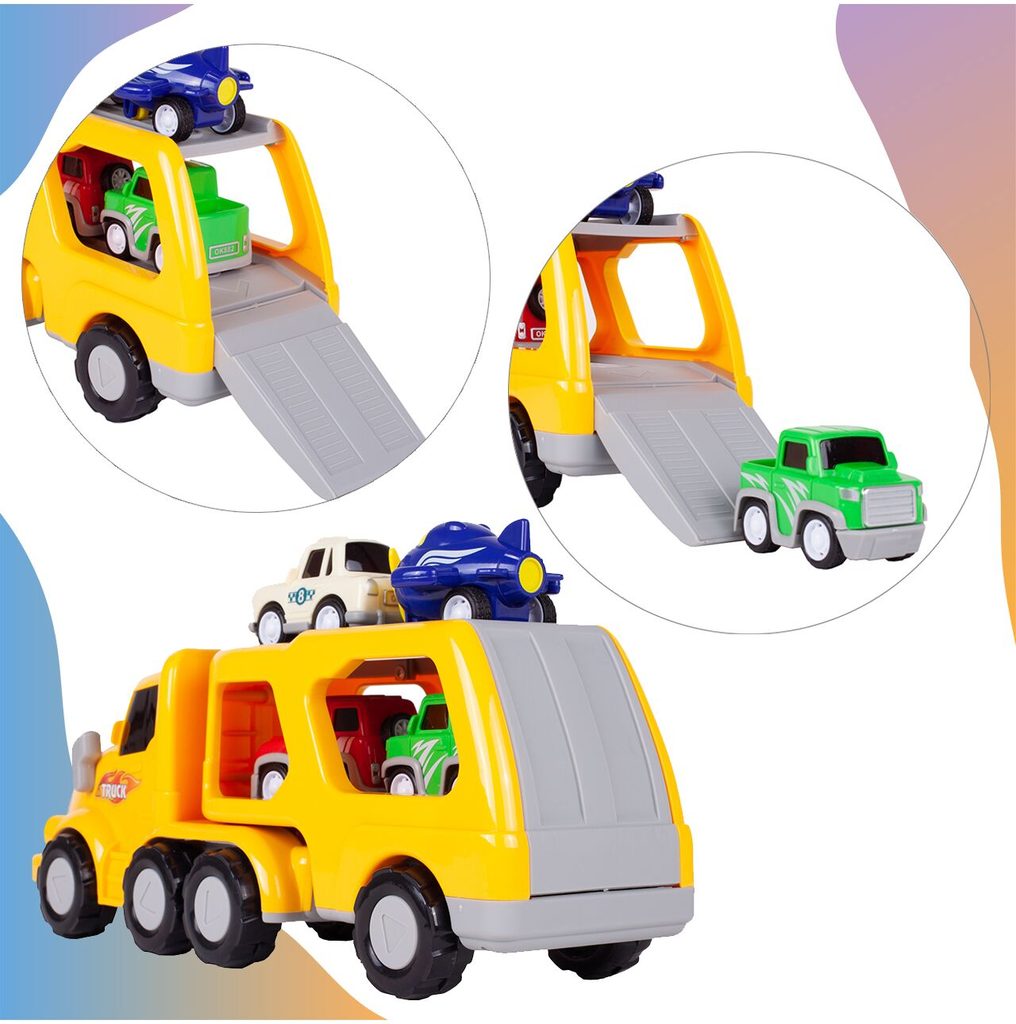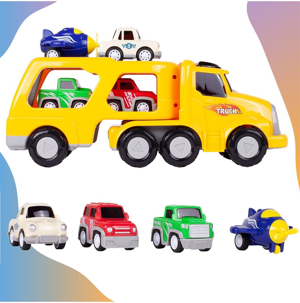 Nákladní auto na setrvačník Transport Car je ideální hračkou pro rozvoj manuální zručnosti a logického myšlení. Součástí sady jsou 3 autíčka a helikoptéra. Auto je vybaveno tlačítkem, které spouští melodie a žluté přední světla. Malé autíčka mají natahovací mechanismus. Pohon velkého auta s otáčecím návěsem zajišťuje setrvačník. Zadní plošina je sklopná. Hračka je určena pro děti od 36 měsíců věku.
