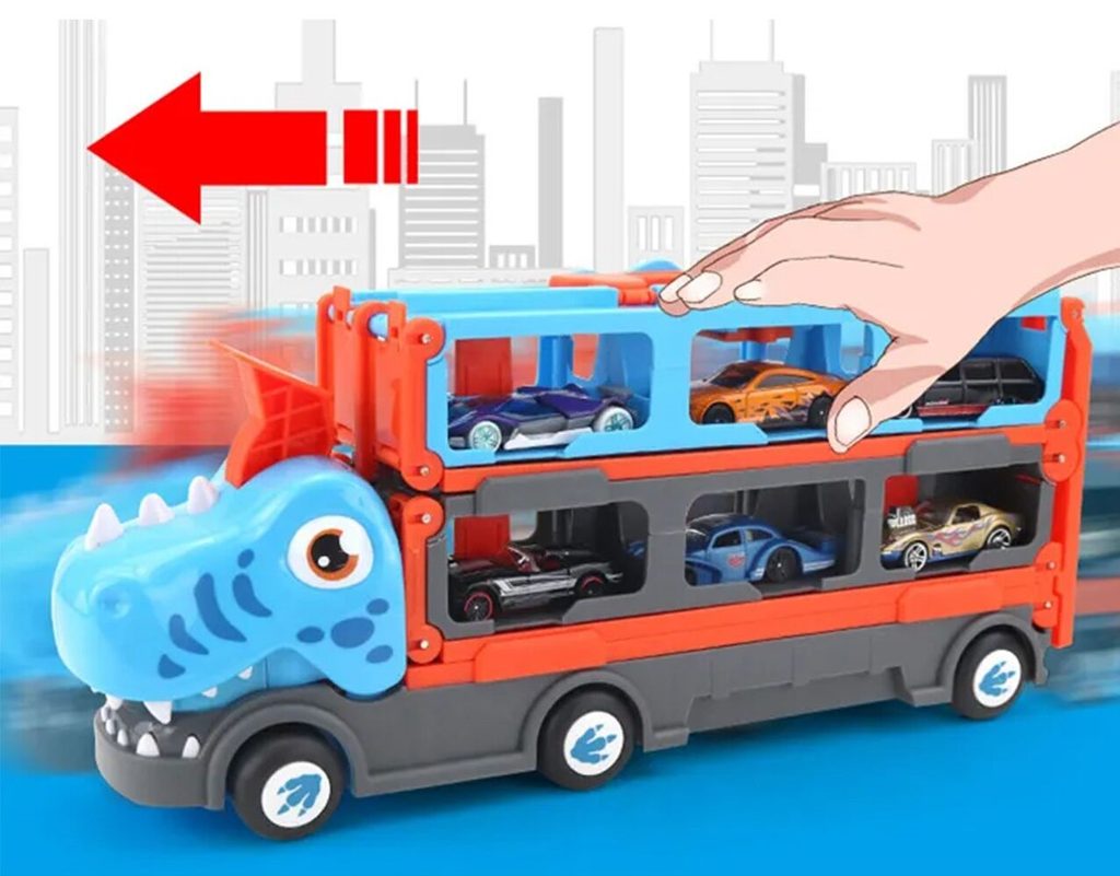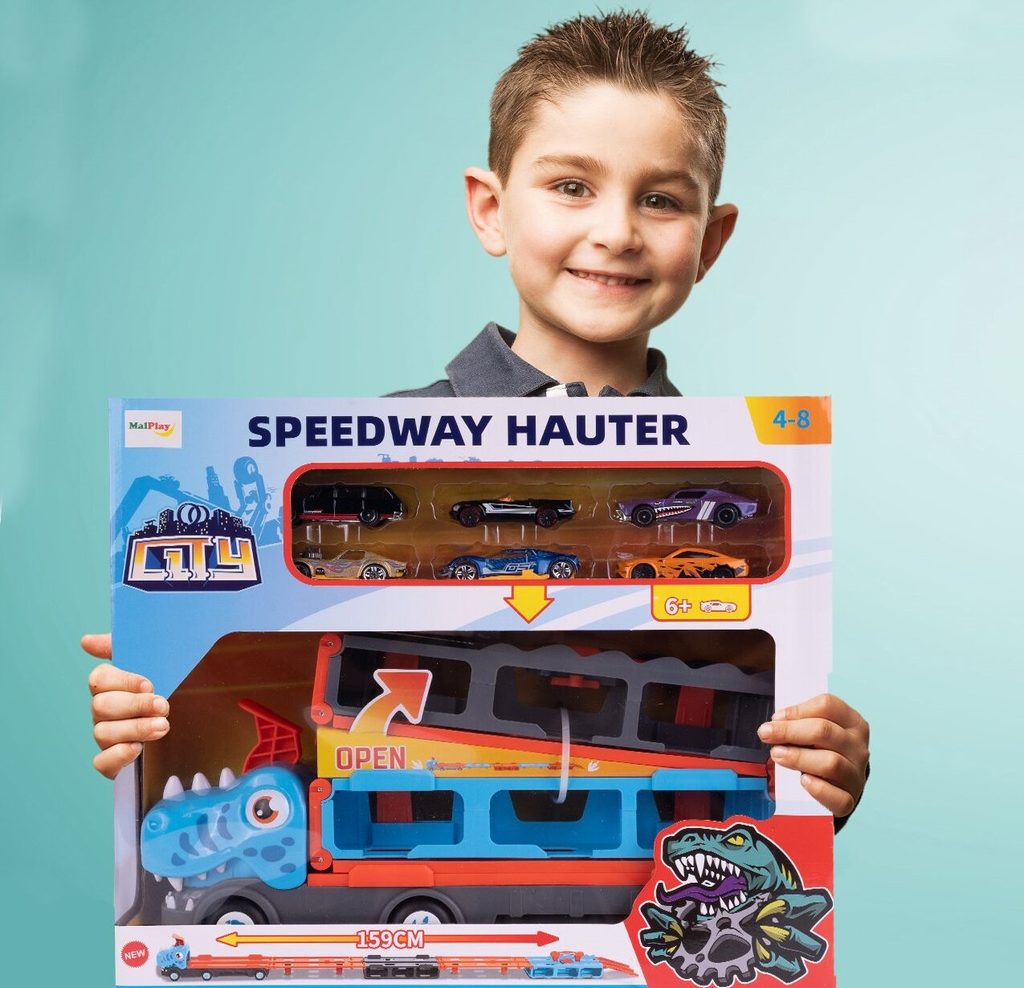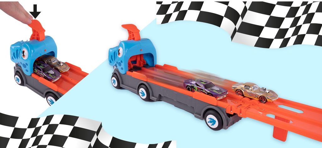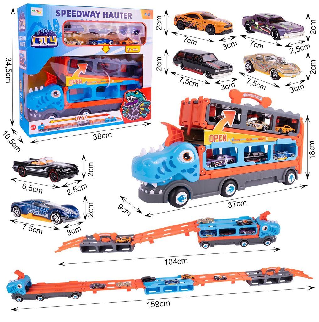 Nákladní auto se 6 různými typy autíček a odpalovačem autíček Speedway Hauter je skvělou hračkou pro dítě samotné nebo hru spolu s kamarády. Princip je velmi jednoduchý. Stačí natáhnout odpalovač v kabině autíčka provedené ve tvaru dinosaura, vložit autíčko, spustit a pak už jen sledovat jak daleko autíčko dojede. Dále lze auto využít jako úložný prostor nebo ho lze rozložit tak, že vznikne dráha až o délce 159 cm! Hračka je vyrobena z materiálu bez ostrých hran a určena pro děti od 4 let věku.