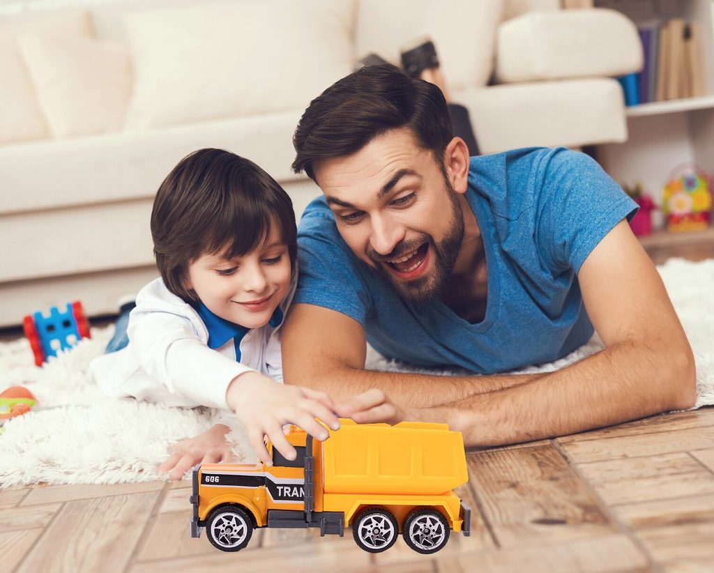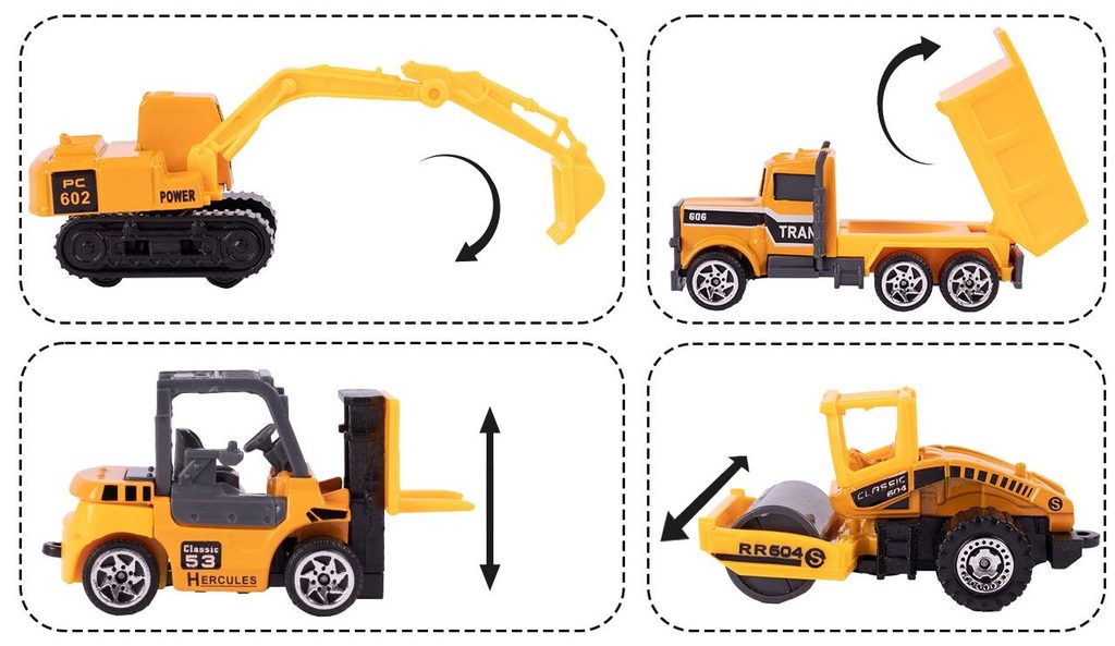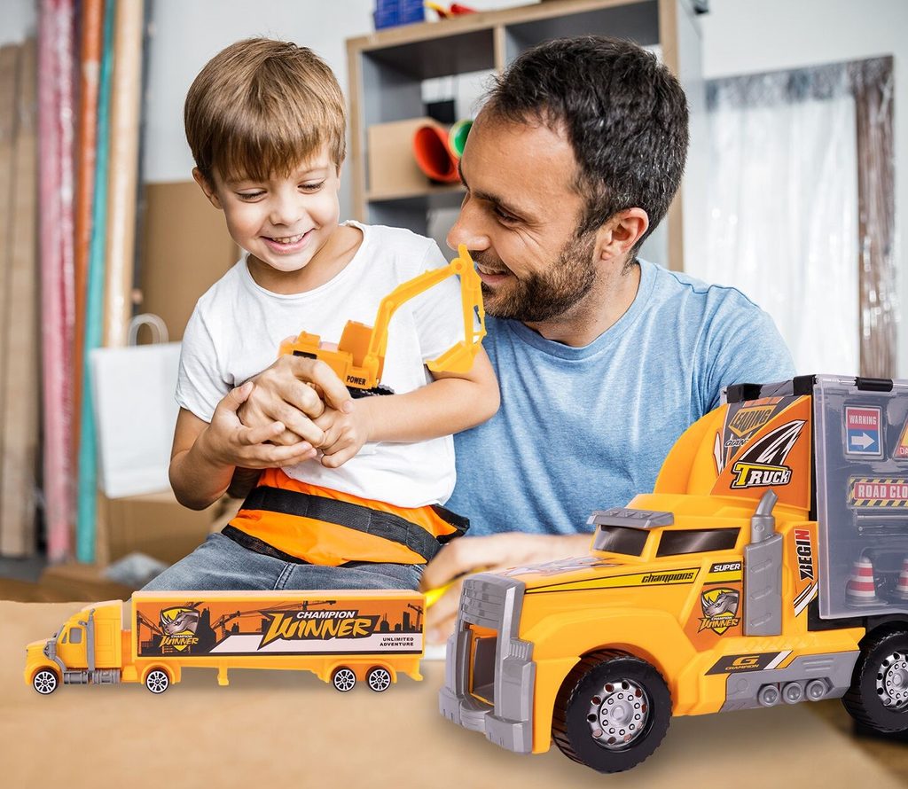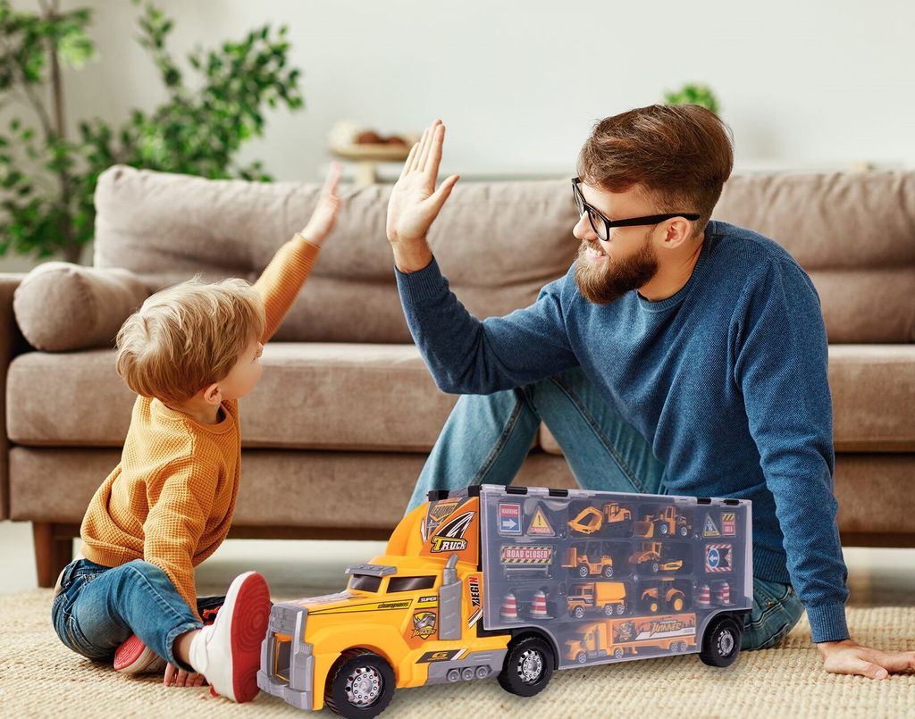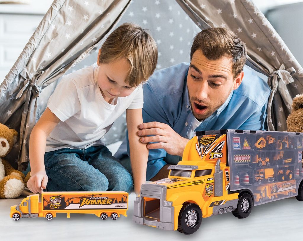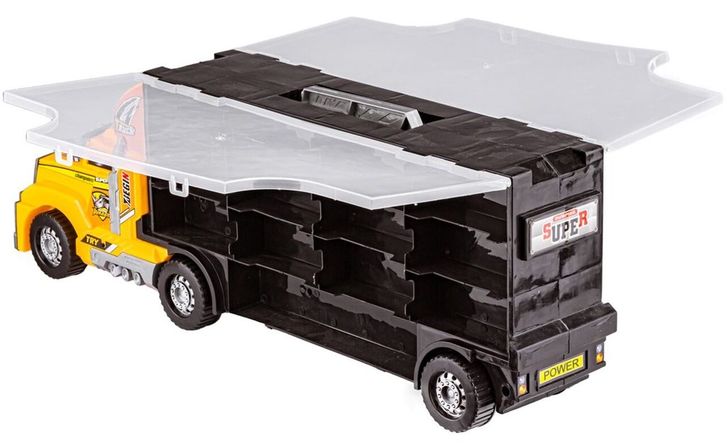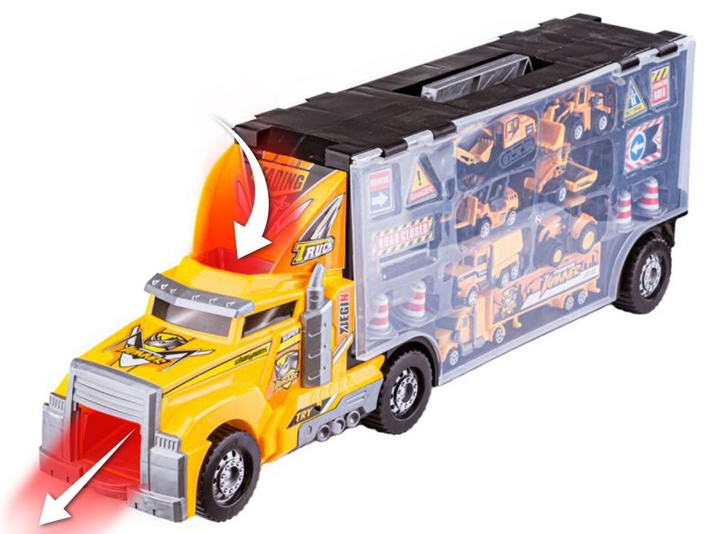 Velké nákladní autíčko Yellow Truck se stavebními stroji a skluzavkou. Ta je umístěna na střeše auta a končí v přední části. Součástí auta je 6 autíček- stavebních strojů, kamión, a další příslušenství jako jsou kužely a silniční zábrany. Obě boční strany auta jsou otevírací a jsou rozděleny na 12 menších a 4 velké přihrádky. V horní části je praktický úchyt pro snadné přenášení. Hračka je určena pro děti od 36 měsíců věku.