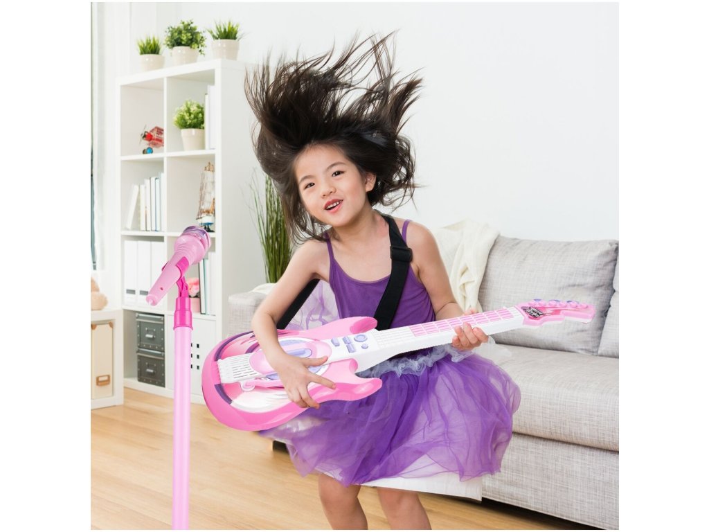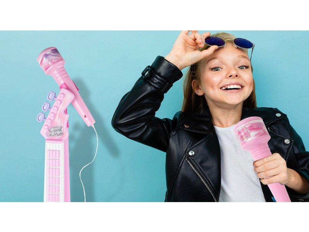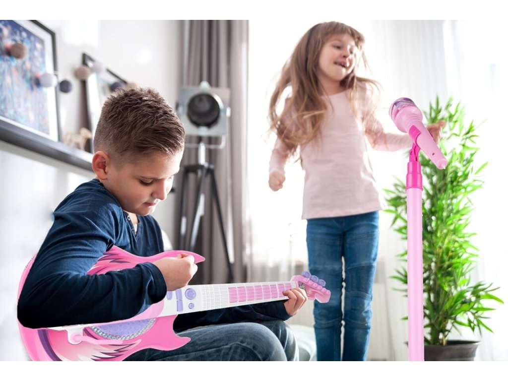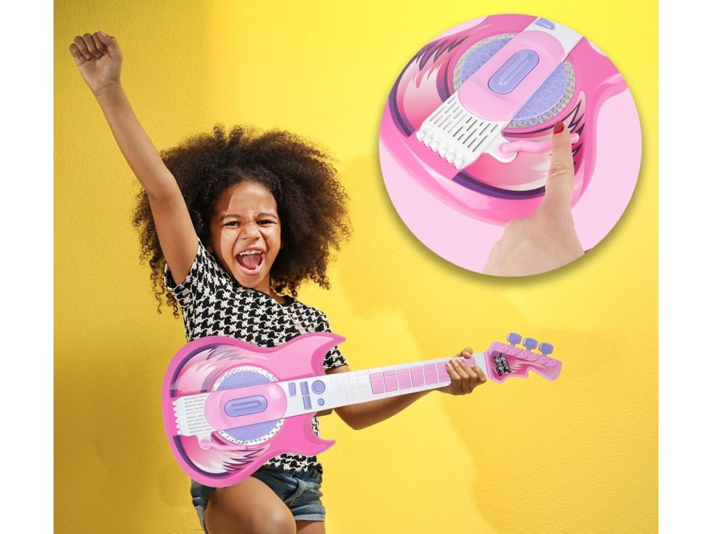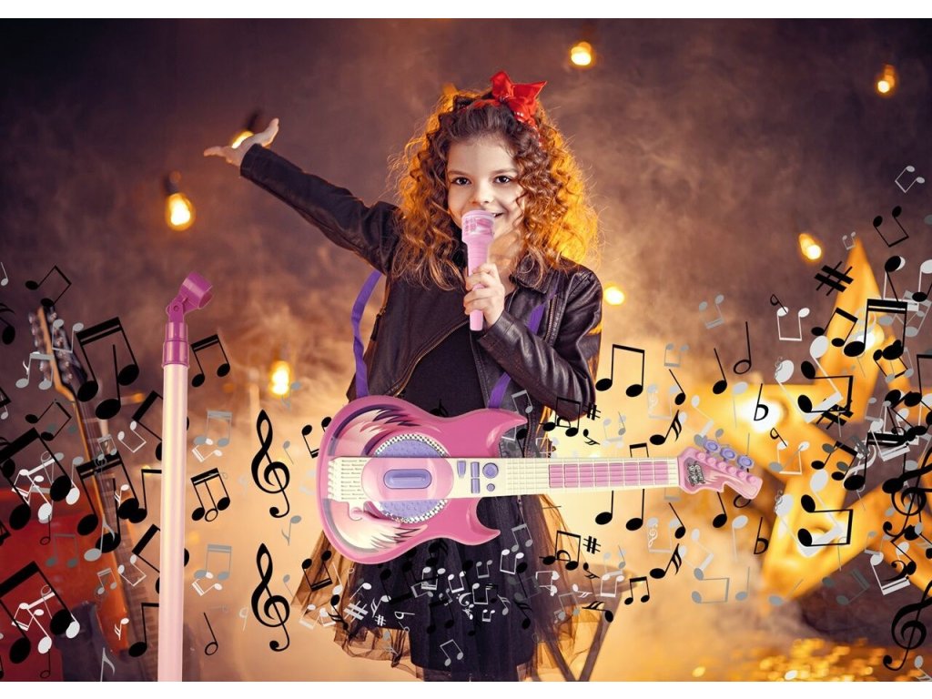 Tato růžová elektrická kytara je ideálním nástrojem pro malé hudební nadšence. S osmi tlačítky na hmatníku může dítě snadno skládat melodie pouhými pohyby prstů. Každé stisknutí tlačítka generuje unikátní kytarové sólo nebo jednotlivý tón, což z ní činí skvělý nástroj pro objevování hudby. Kytara je vybavena dlouhým spínačem u zvukového otvoru, který umožňuje dětem vytvářet různé zvuky kytary jednoduchým pohybem nahoru a dolů. Speciální páka pak přidává rockové efekty, čímž se rozšiřuje možnosti pro kreativitu malých hudebníků. Pro doplnění zábavy můžete kytaru připojit k chytrému telefonu, což umožní dětem hrát a zpívat podle svých oblíbených skladeb s vokály na pozadí. To nejenže pomáhá překonat trému, ale také podporuje jejich hudební rozvoj a fantazii. Stojan na mikrofon je nastavitelný podle výšky dítěte, což zajišťuje pohodlné používání bez ohledu na jejich velikost. Kytara disponuje třístupňovým ovládáním hlasitosti a samostatnými vstupy pro mikrofon a smartphone, což umožňuje flexibilní použití a snadnou integraci s dalším hudebním vybavením. S napájením pomocí baterií je kytara ideální pro cesty k babičce, do školky nebo na narozeninové oslavy, kde děti mohou svou hudbu předvádět bez omezení přístupu k elektrické síti. Tato kytara s mikrofonem je skvělým zdrojem zábavy a inspirace pro nejmenší hudební nadšence.